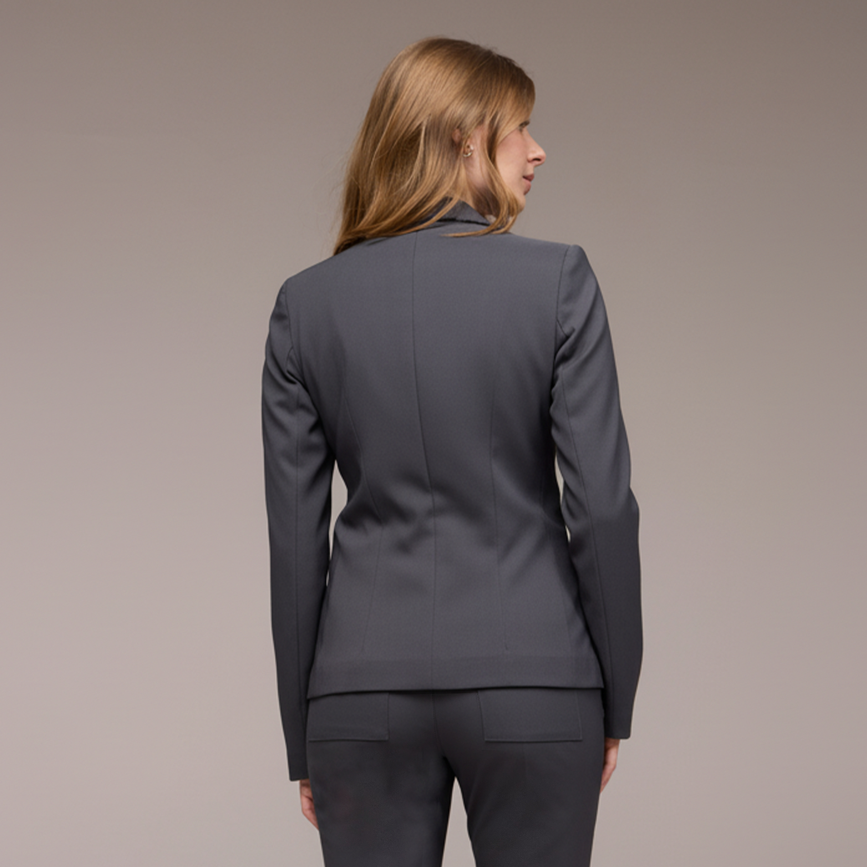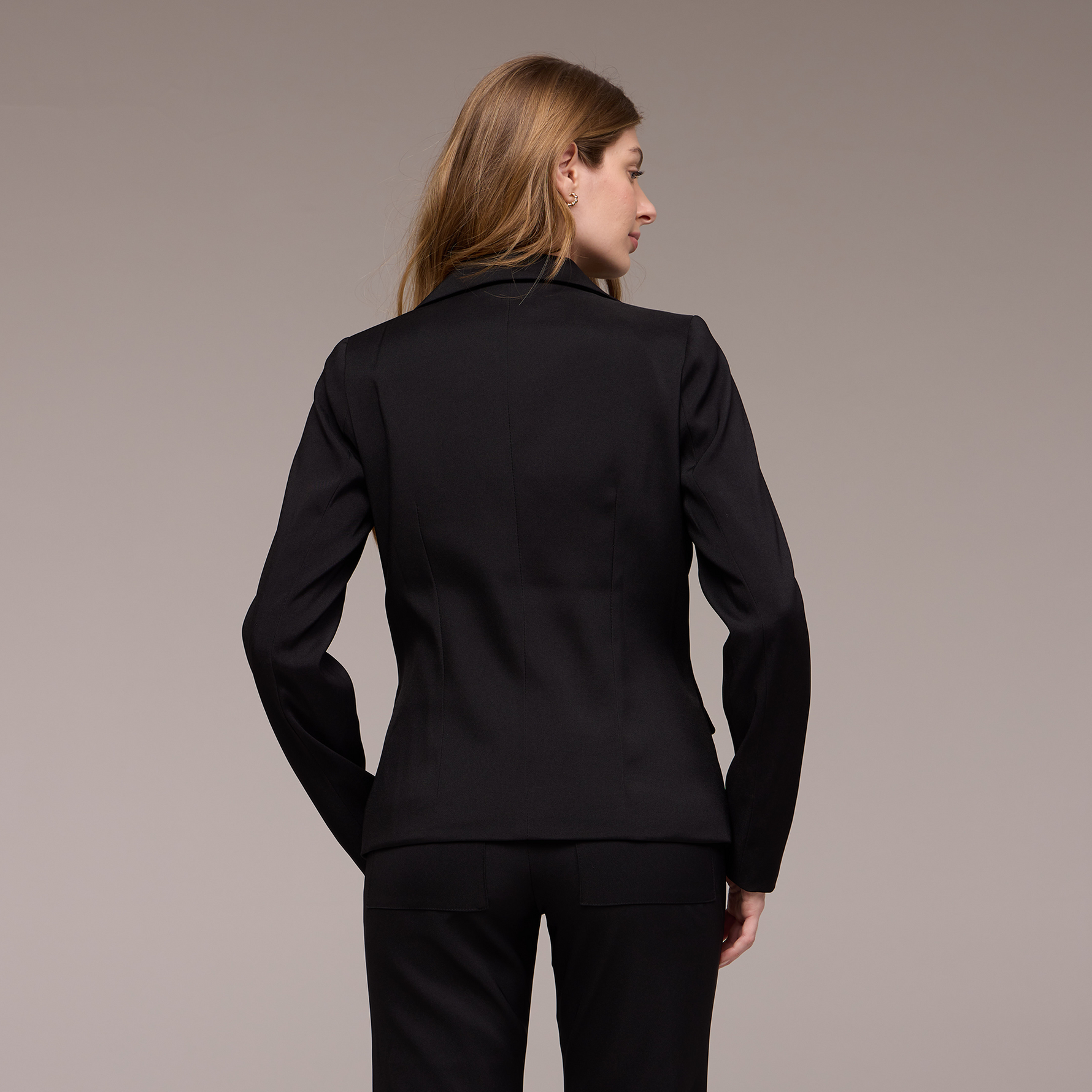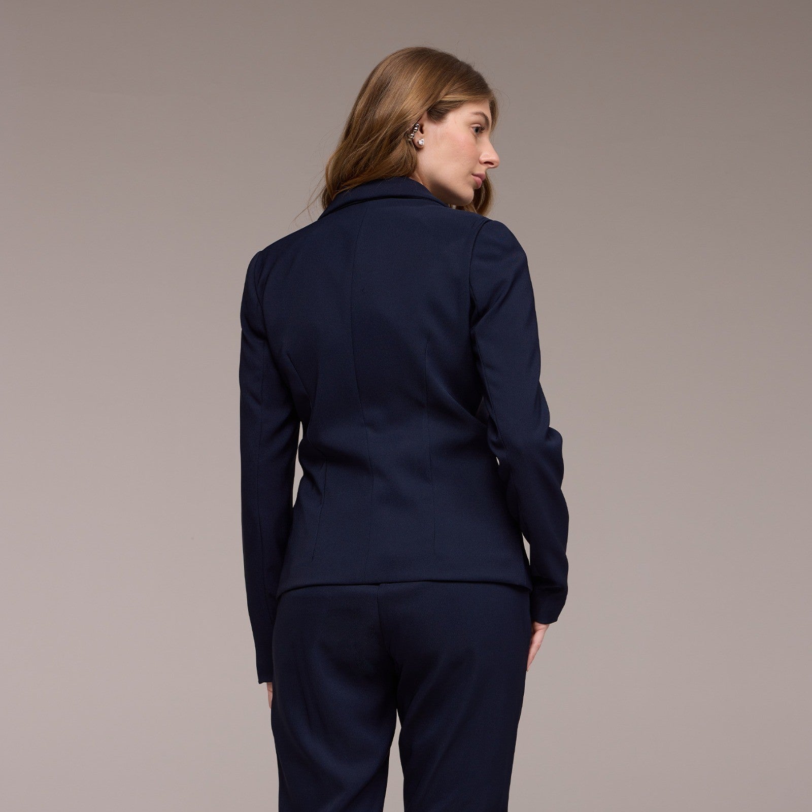 Além de adicionar volume e criar uma silhueta mais equilibrada. Além disso, a base do blazer é arredondada, o que contribui para um caimento suave e elegante. Essa característica também adiciona um toque feminino e harmonioso ao design da peça.