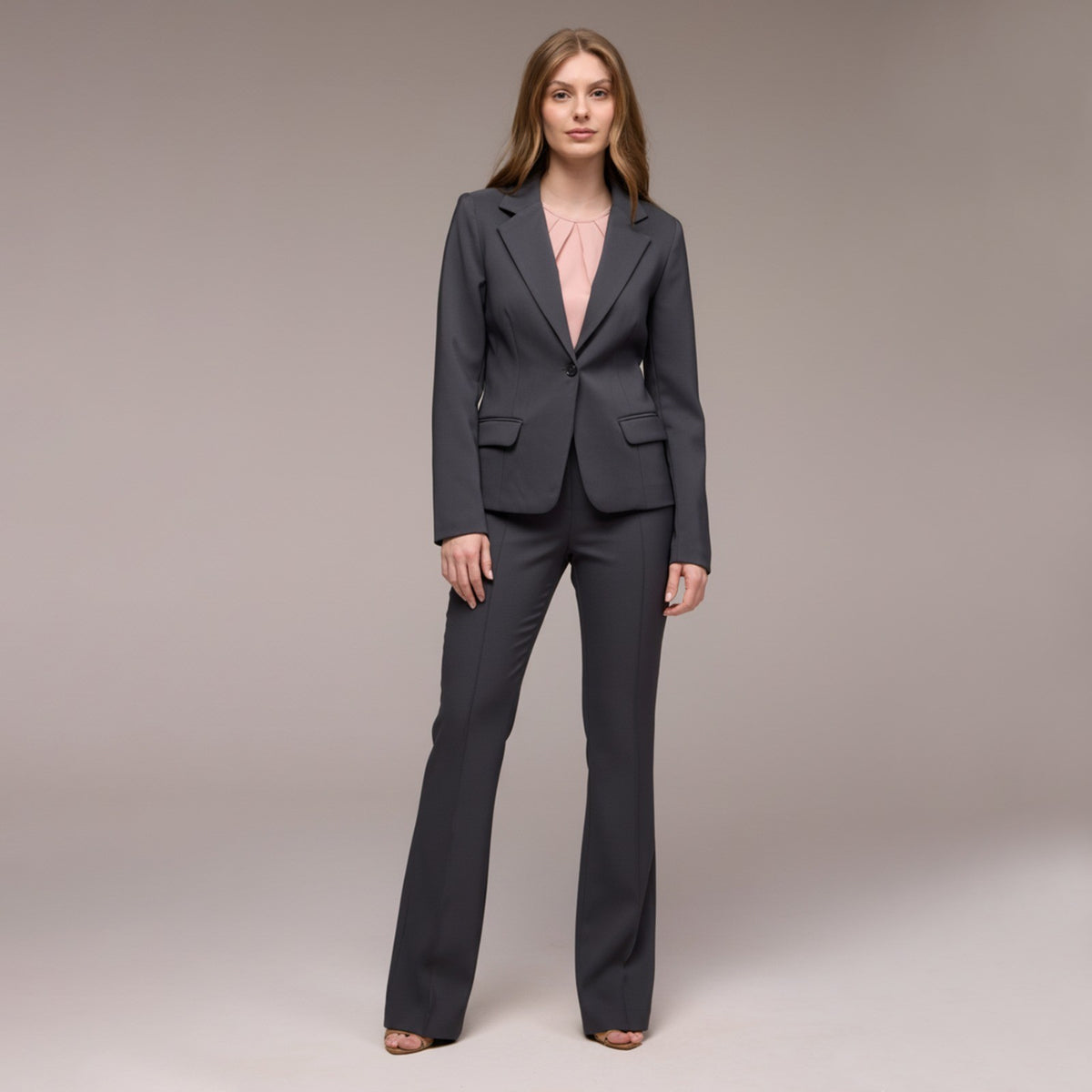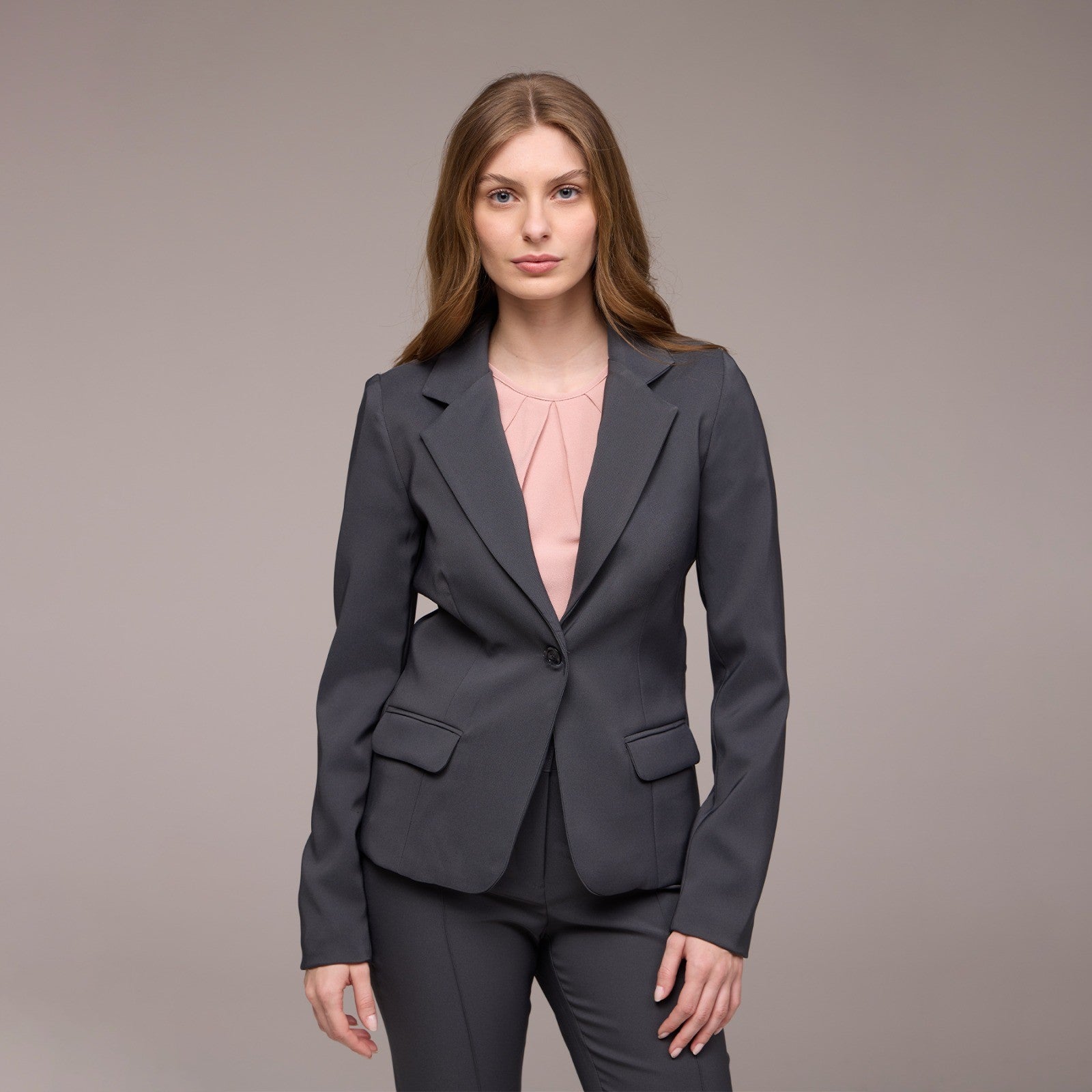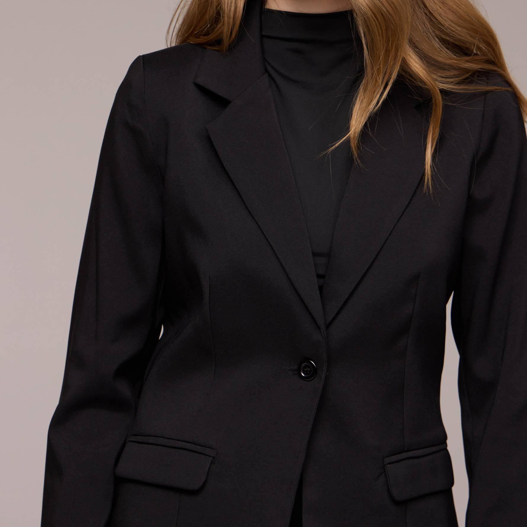 Além de adicionar volume e criar uma silhueta mais equilibrada. Além disso, a base do blazer é arredondada, o que contribui para um caimento suave e elegante. Essa característica também adiciona um toque feminino e harmonioso ao design da peça.