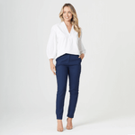 A blusa é feita com uma frente dupla, o que significa que há duas camadas de tecido na parte da frente, o que contribui para um acabamento mais estruturado à peça, além de evitar transparências indesejadas.