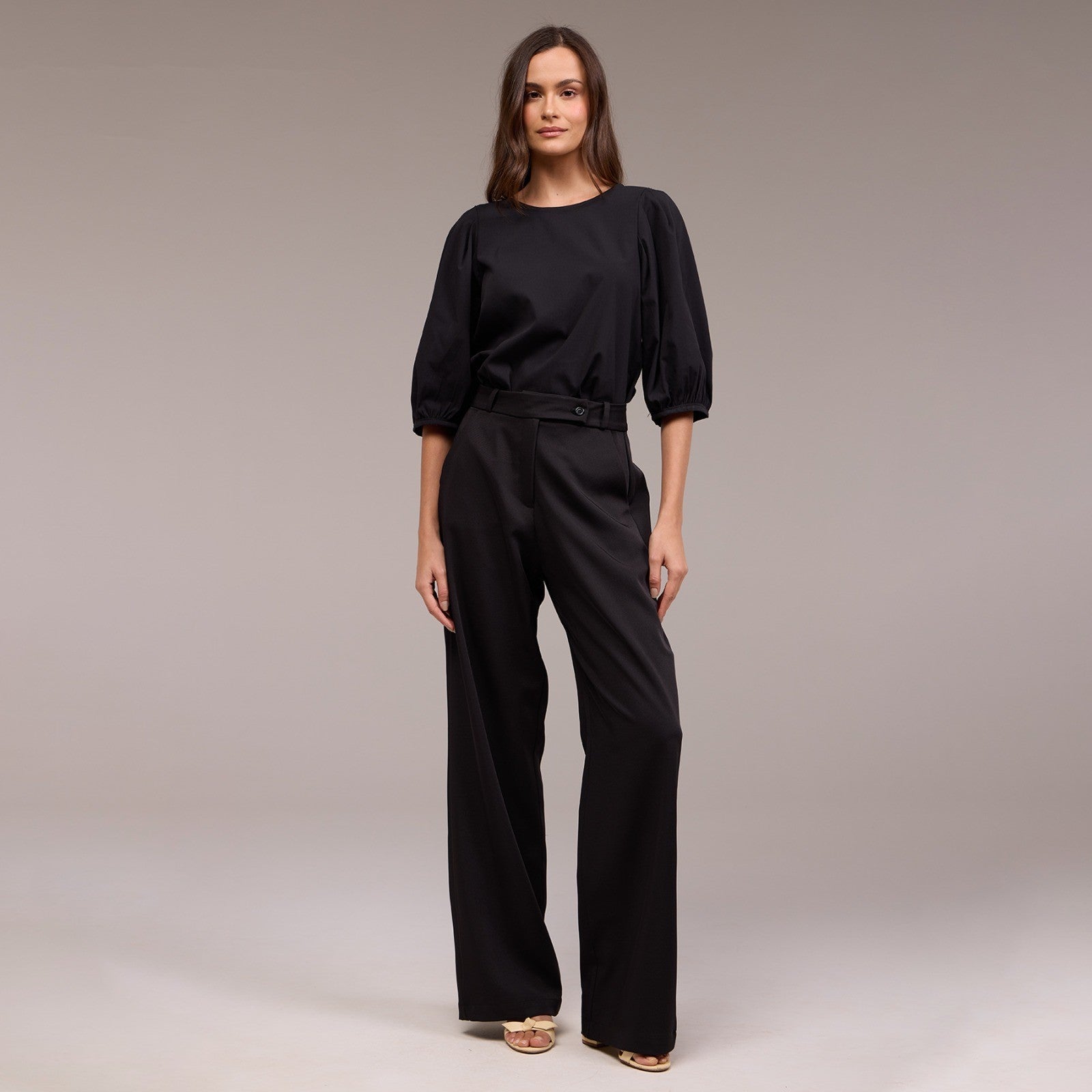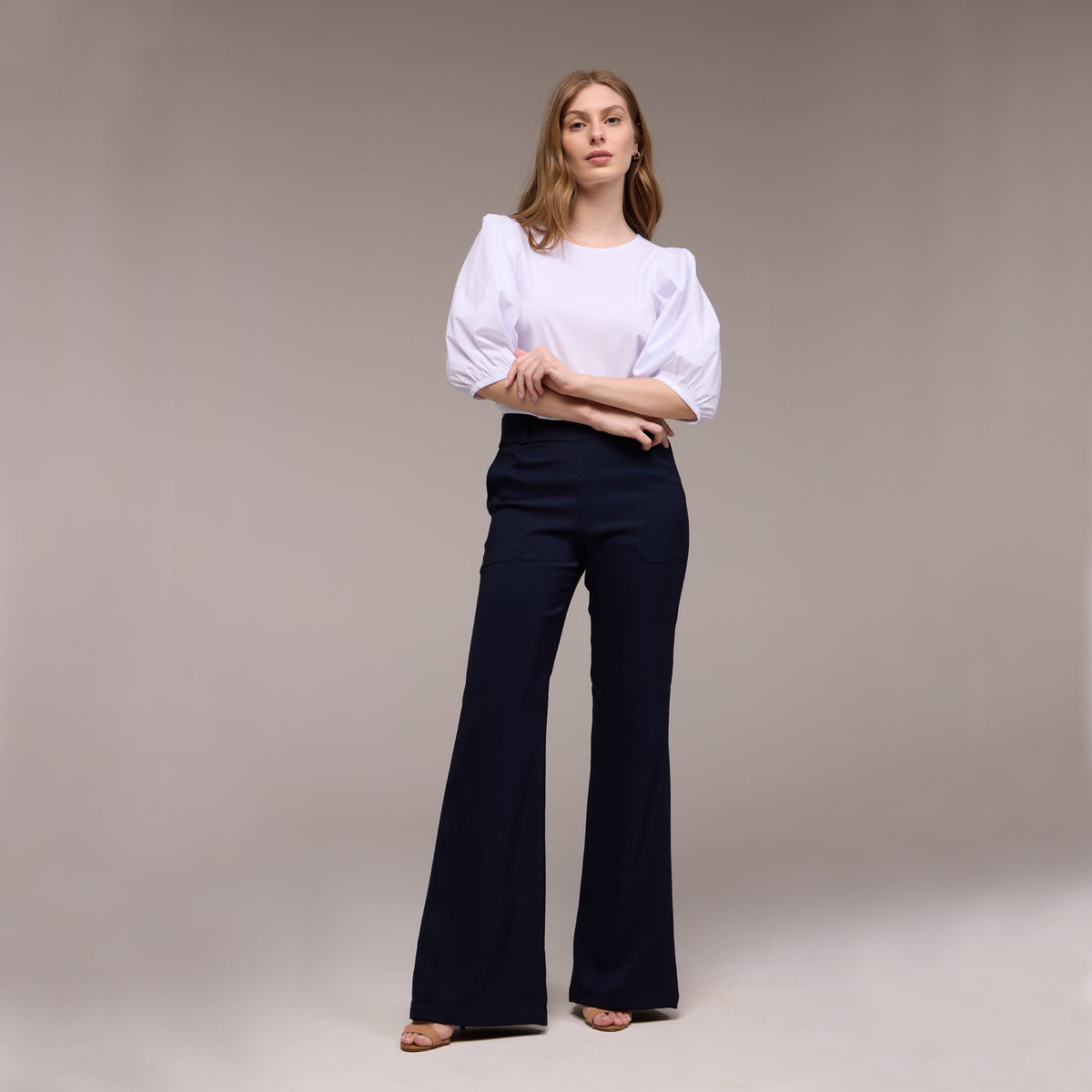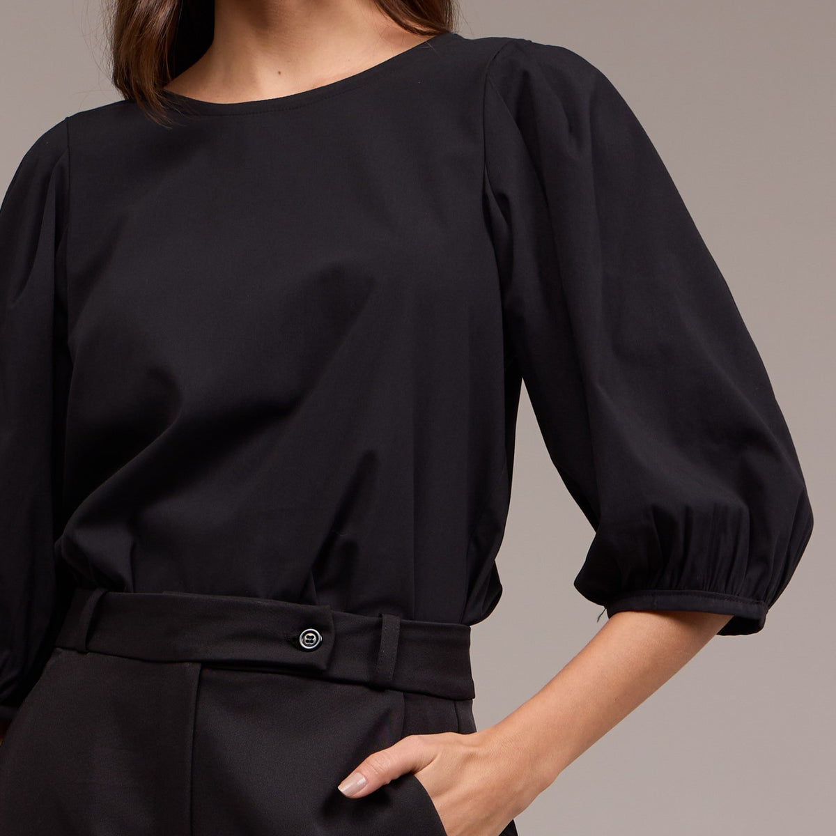 Cada manga bufante termina com um elástico na altura do cotovelo. Esse elástico ajuda a manter o volume da manga e proporciona um ajuste confortável no cotovelo, evitando que as mangas escorreguem para cima.