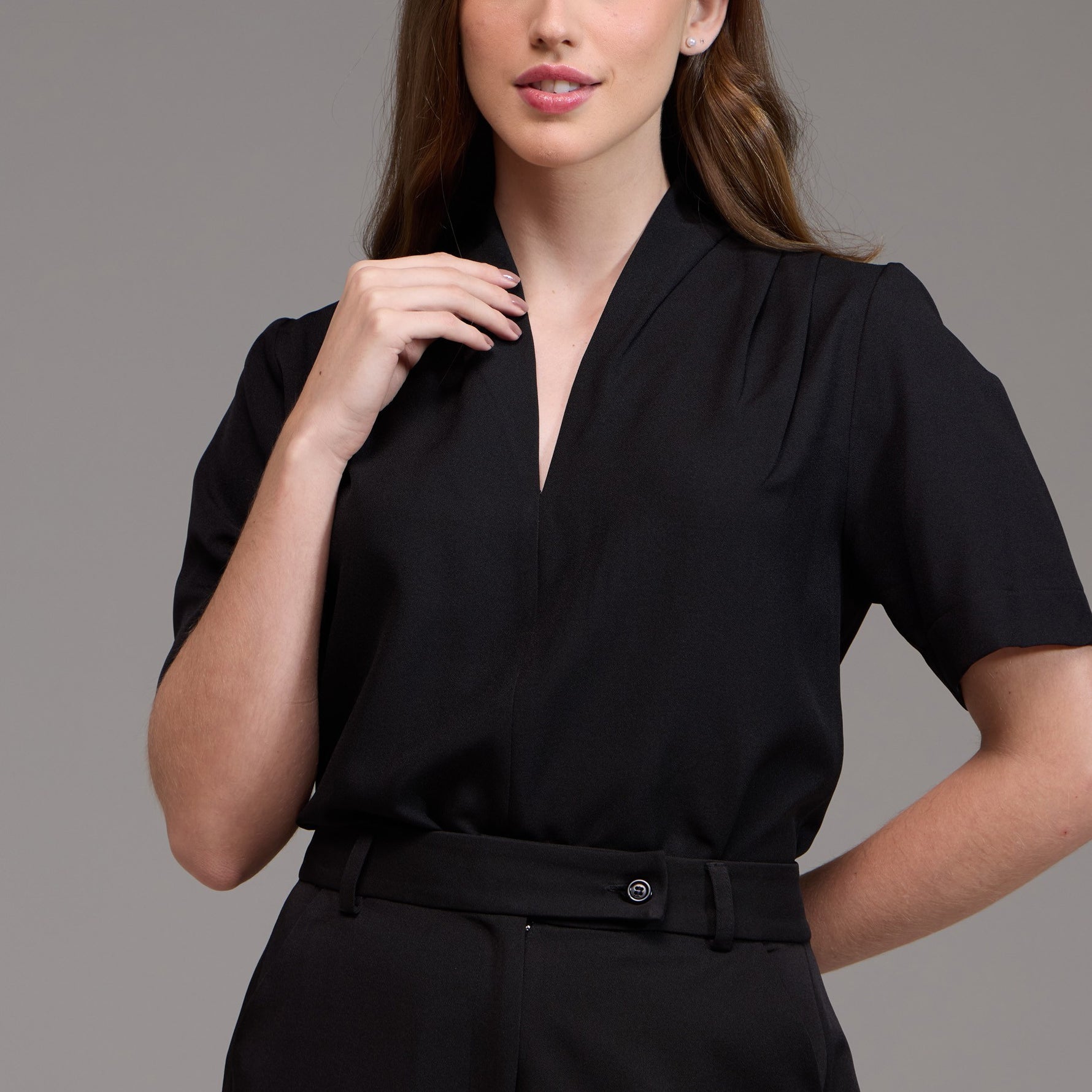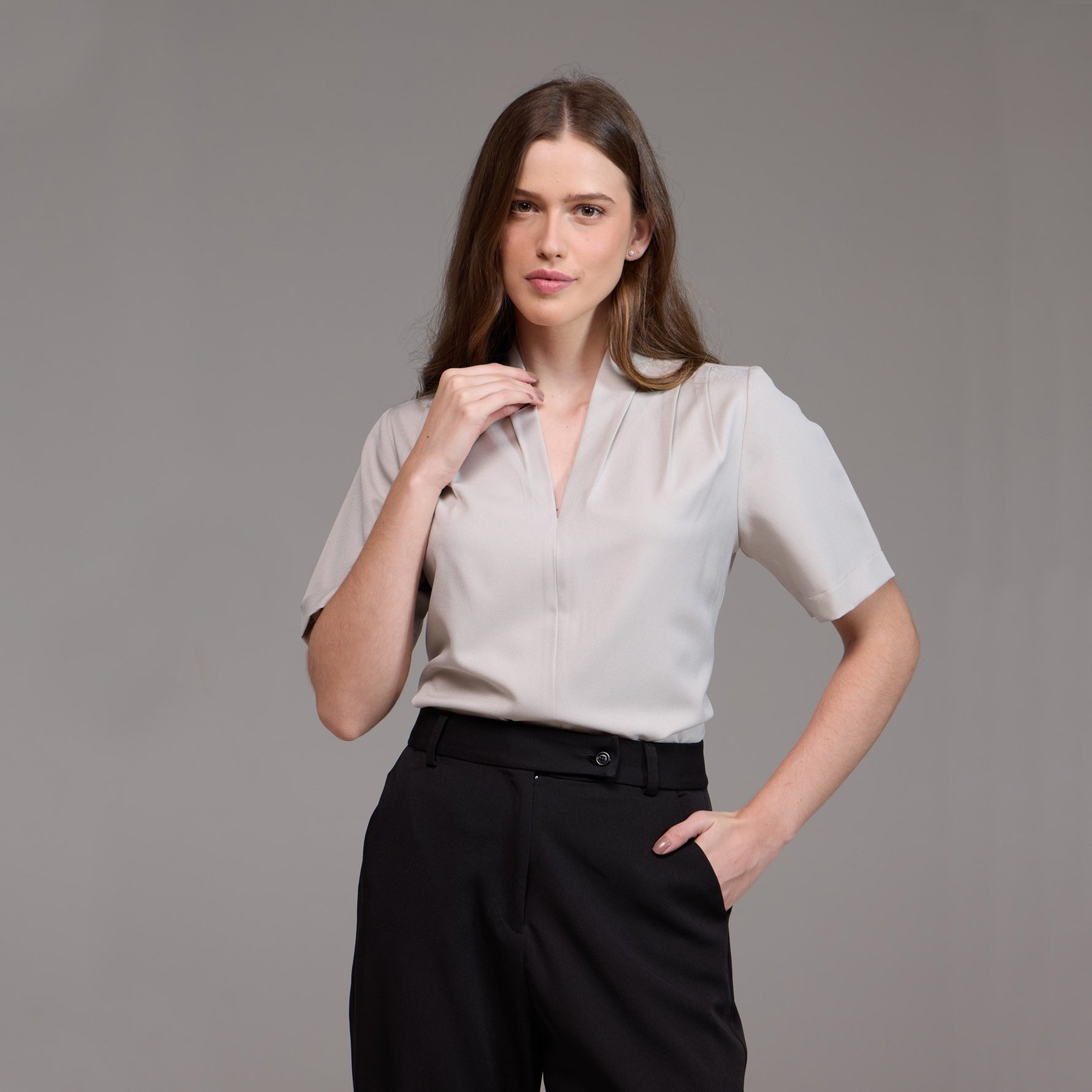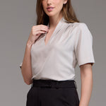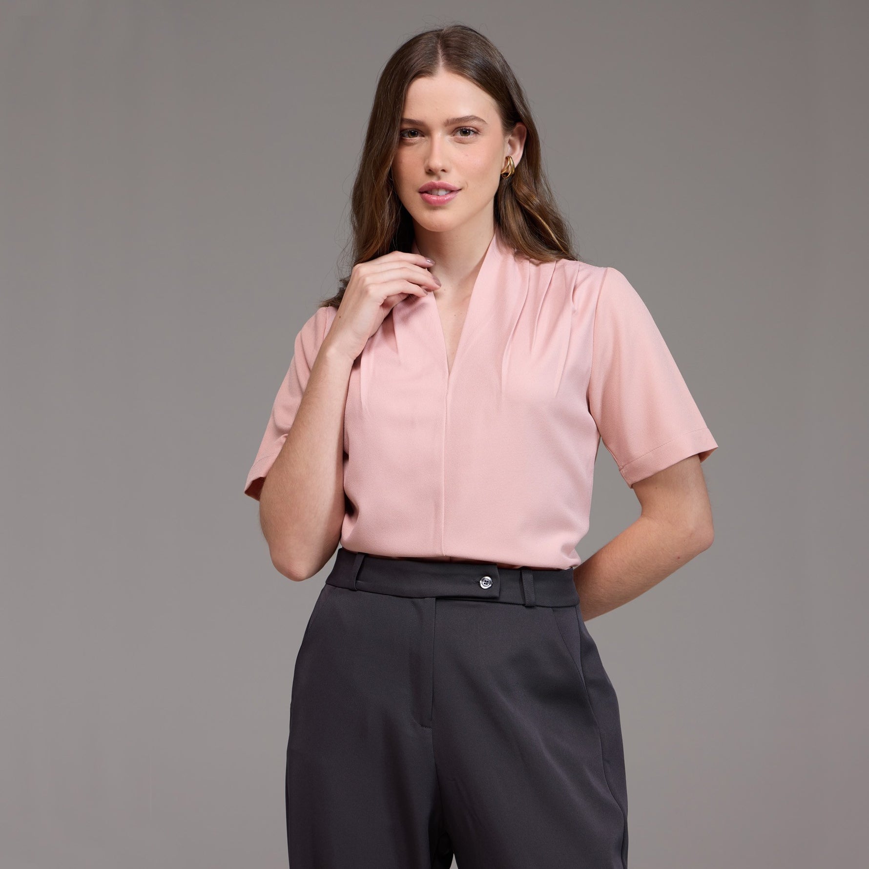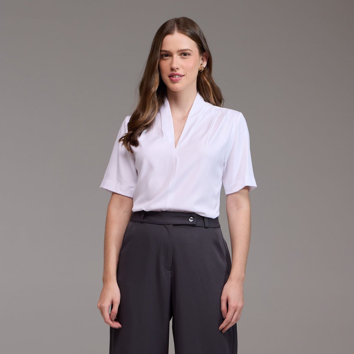 A Blusa Feminina Manga Curta Agata é uma peça moderna e com detalhes únicos, projetada para proporcionar conforto e estilo no ambiente de trabalho.