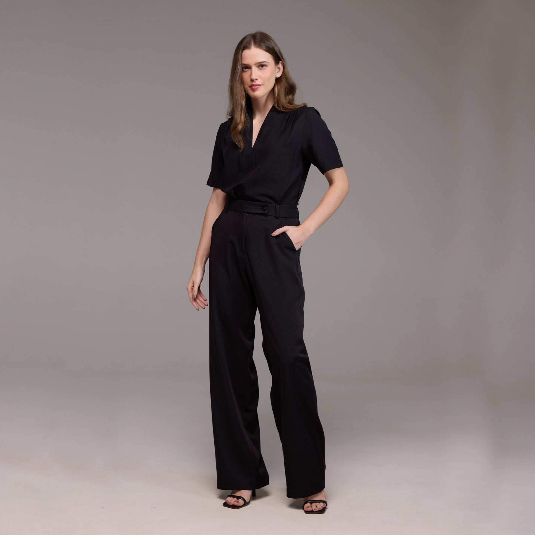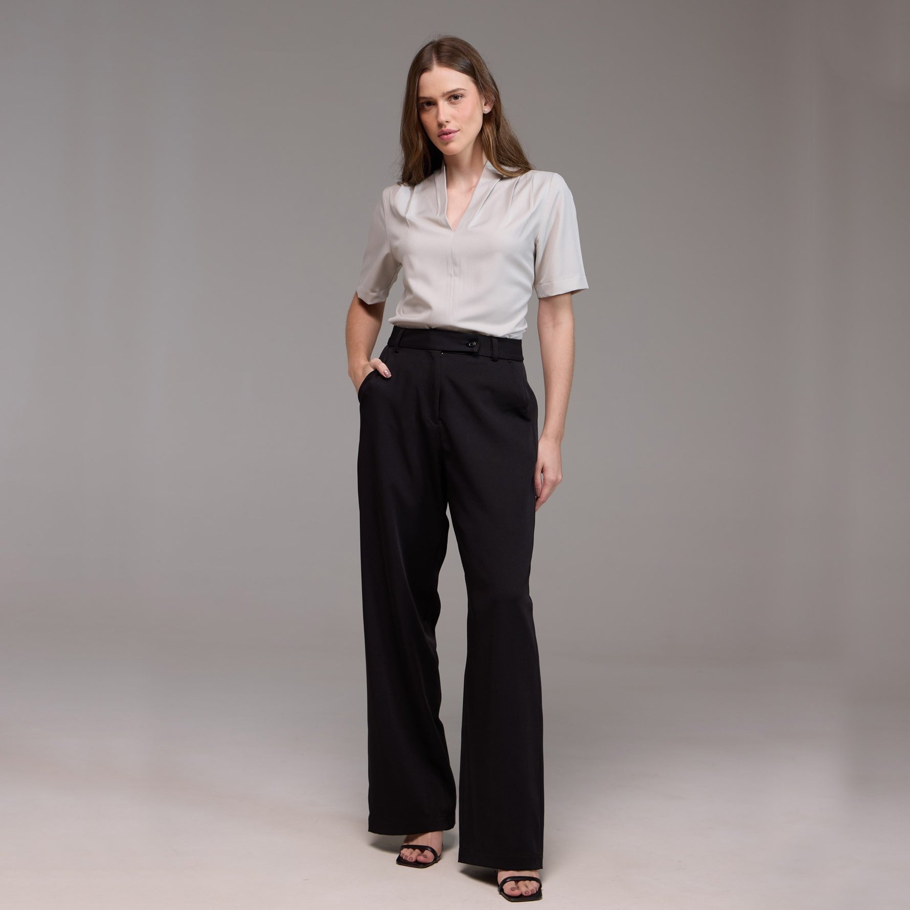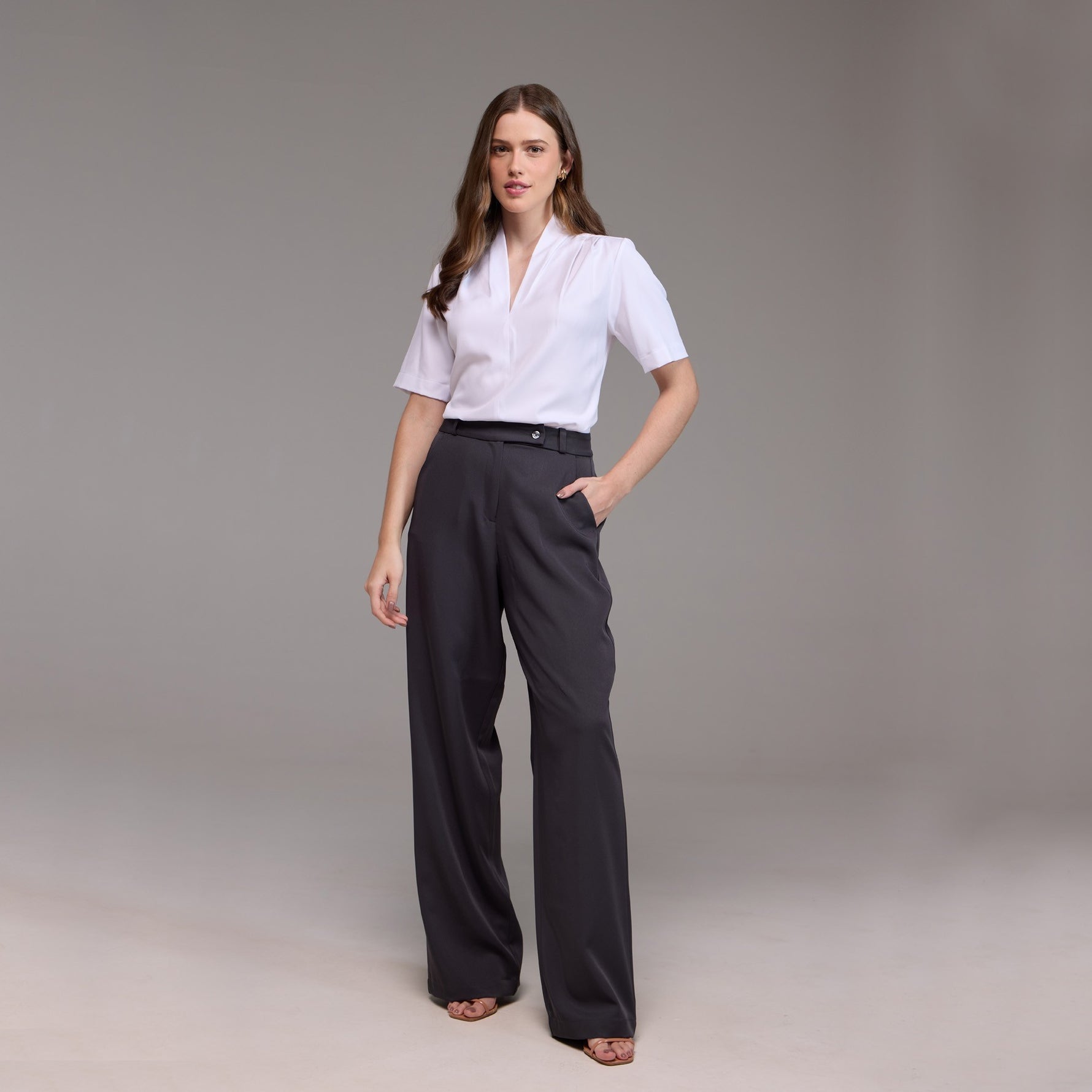 O decote em V realça delicadamente a área do pescoço e do colo, enquanto o seu recorte central que vai até a barra cria uma aparência mais alongada e esguia.