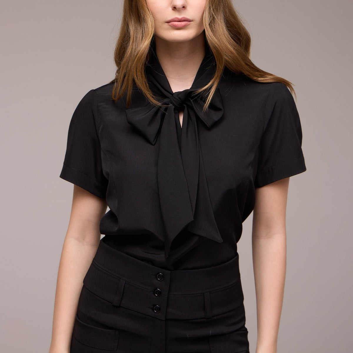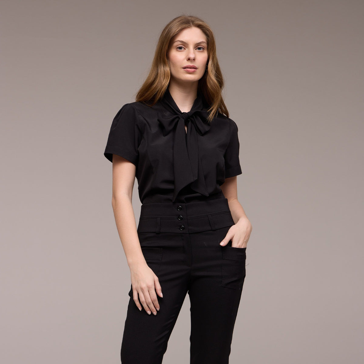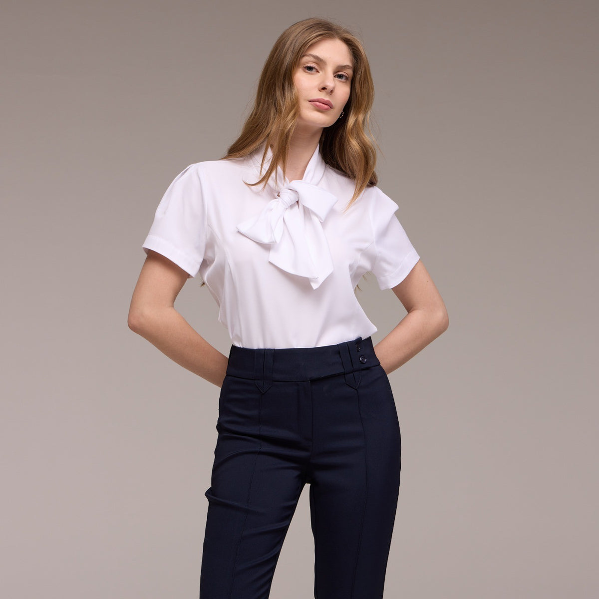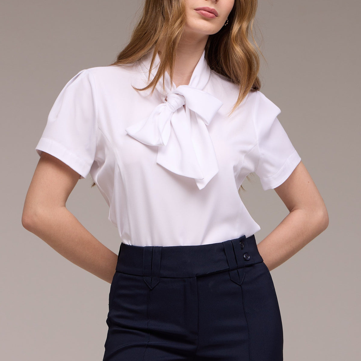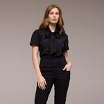 A Blusa Feminina Manga Curta Eduarda, com sua gola laço e manga curta bufante, é a escolha perfeita para quem busca um toque de sofisticação e feminilidade em seu uniforme.