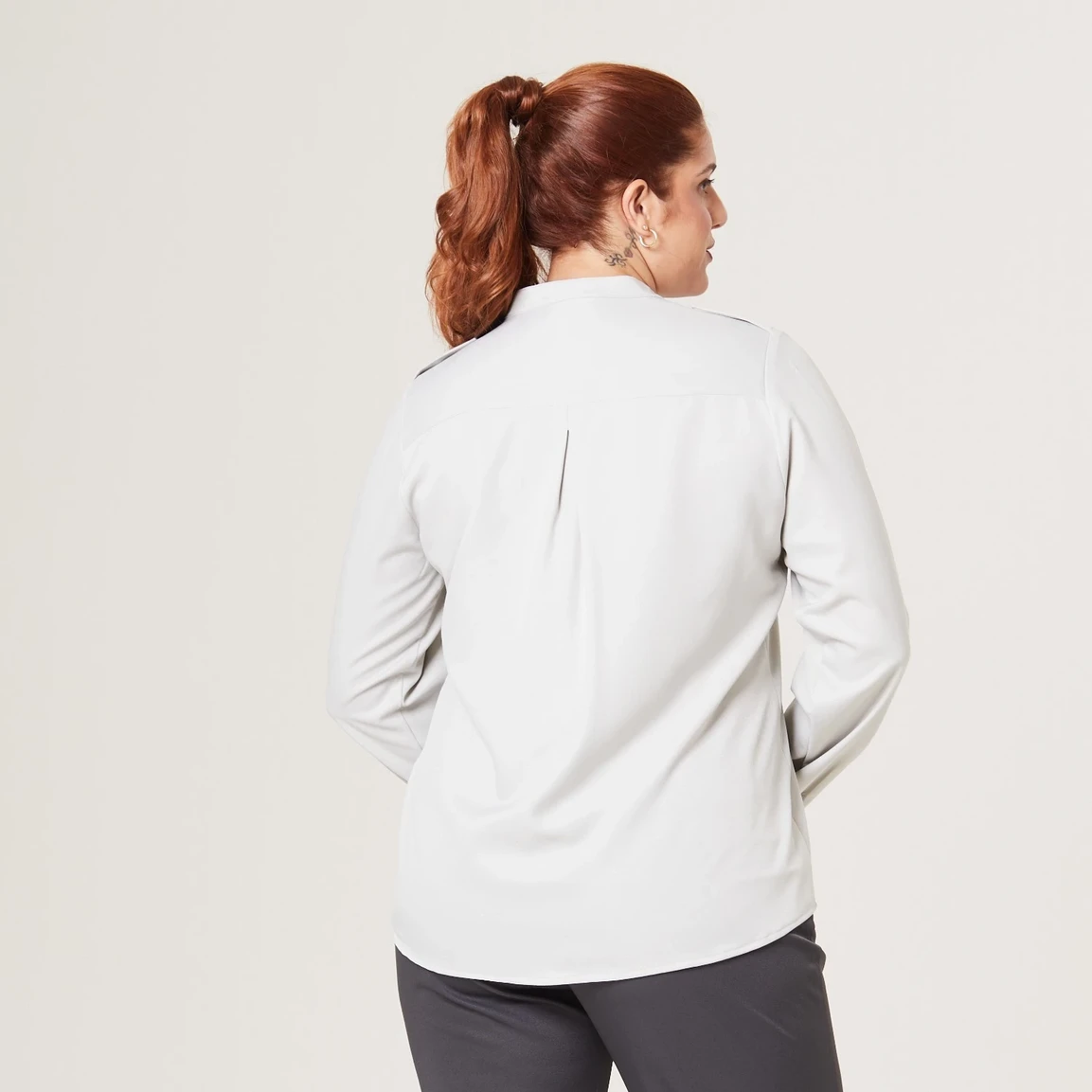 O recorte sutil nas costas acentua a silhueta, criando uma modelagem mais desenhada. Além disso, no busto, a blusa possui dois bolsos falsos com uma tampa, o que agrega um toque de formalidade por se assemelhar a uma camisa social. Esses pequenos detalhes contribuem para criar uma aparência única e charmosa.