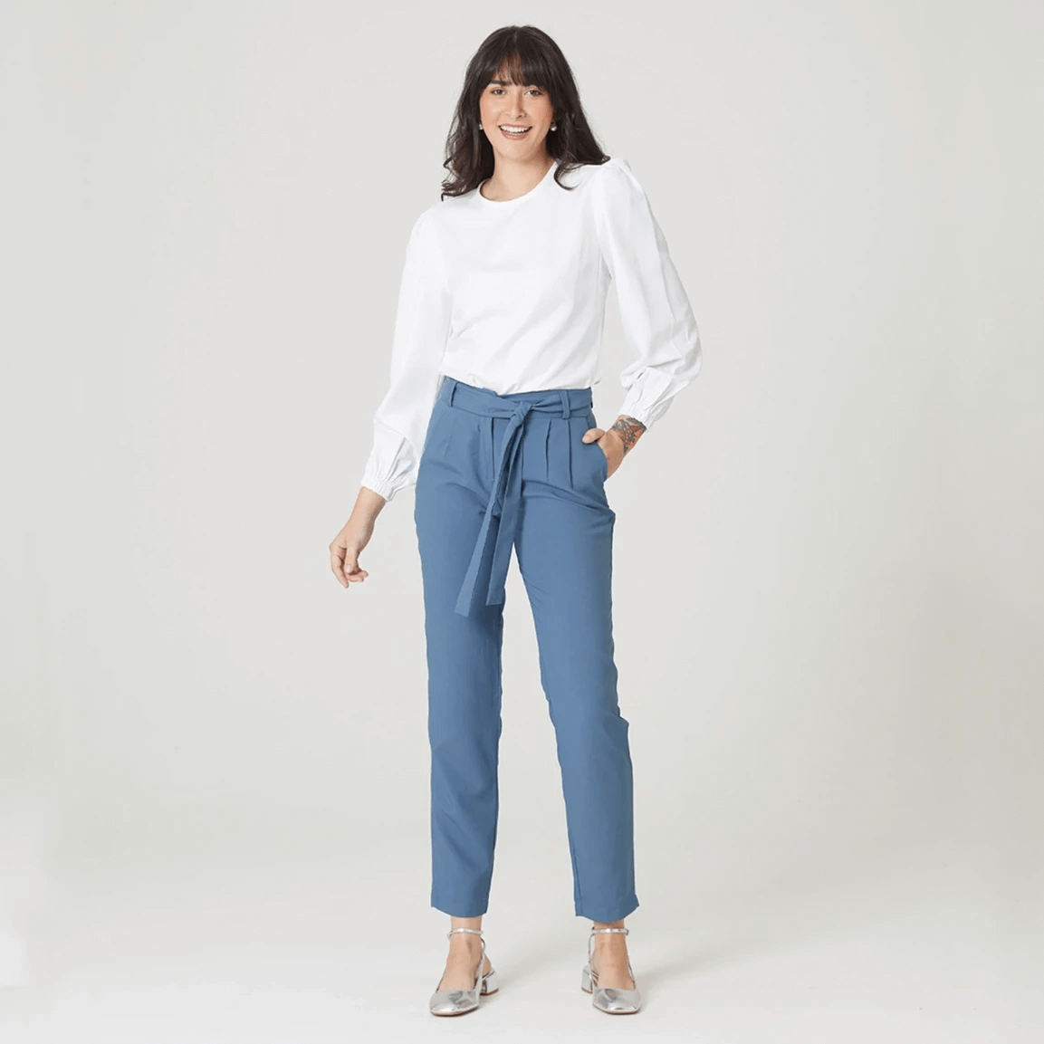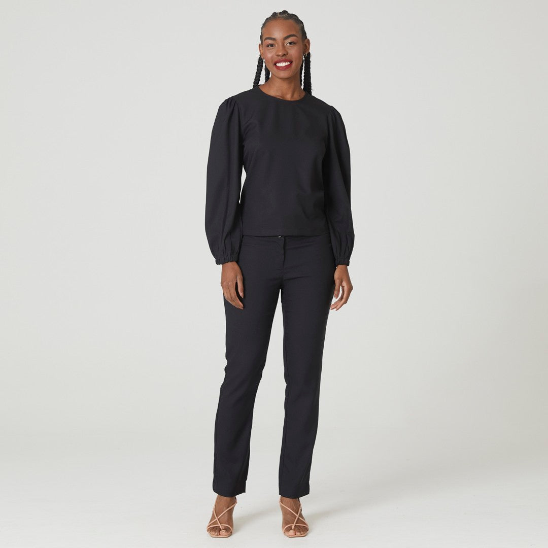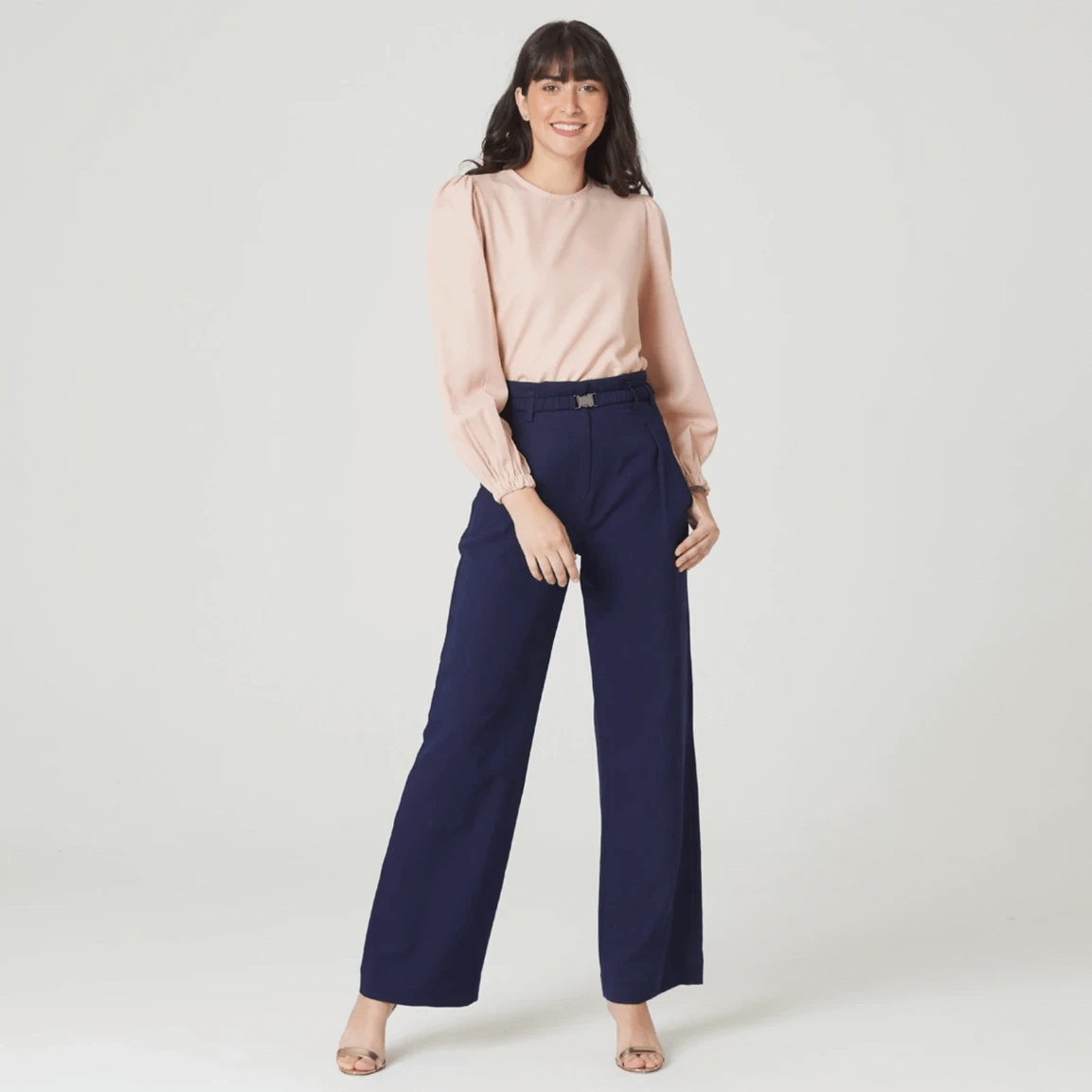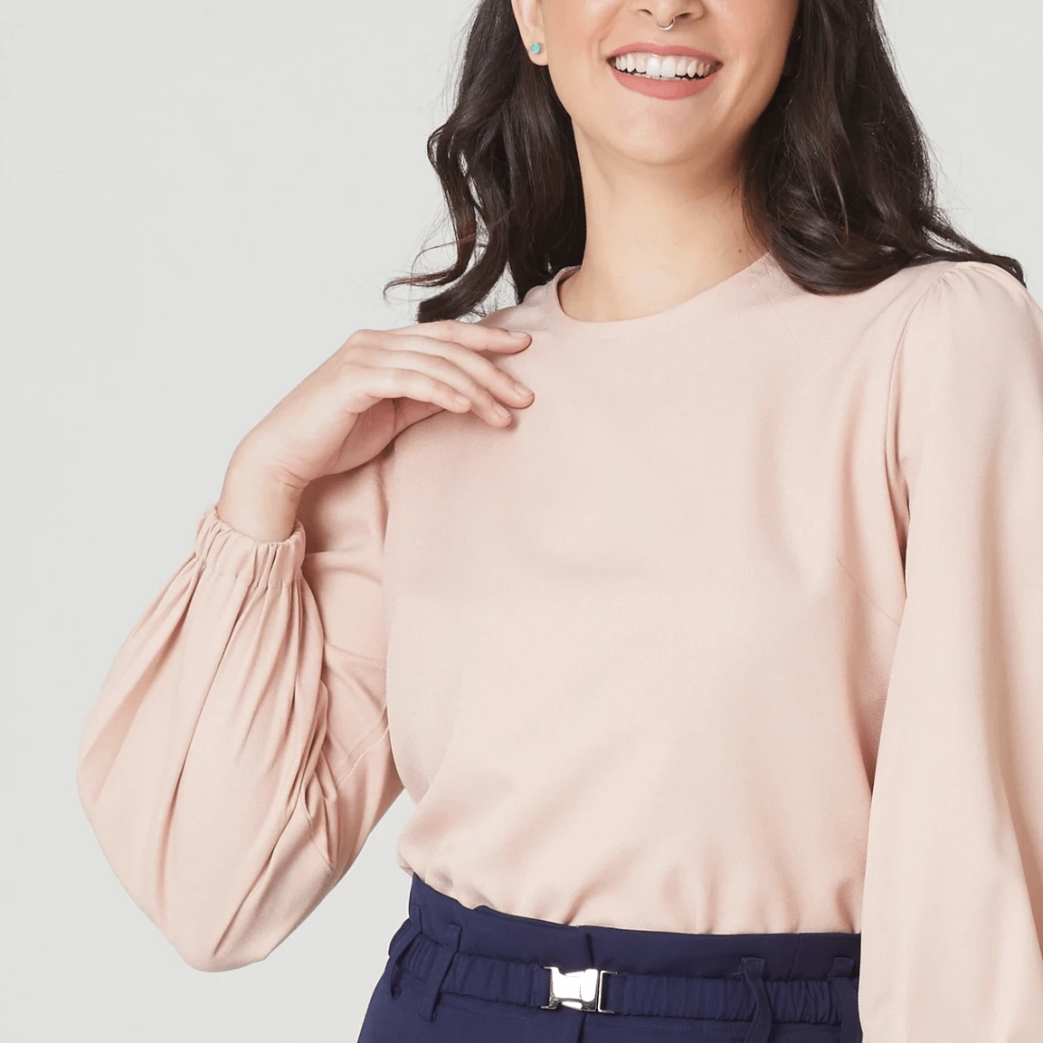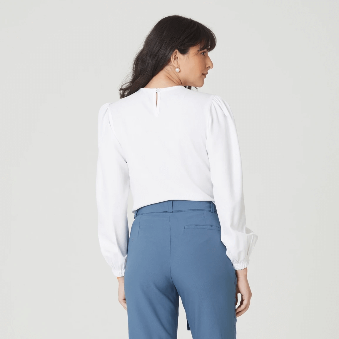 Além disso, a blusa possui detalhes franzidos levemente bufantes na manga e nos punhos, que agregam leveza e movimento à peça, sem perder a seriedade necessária para o ambiente corporativo.