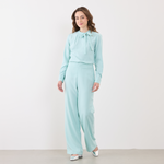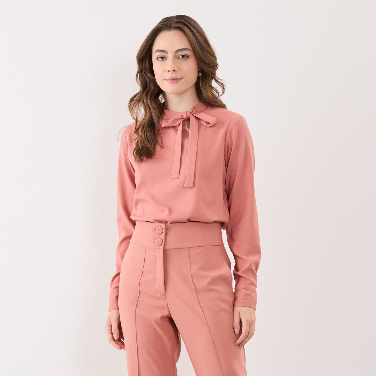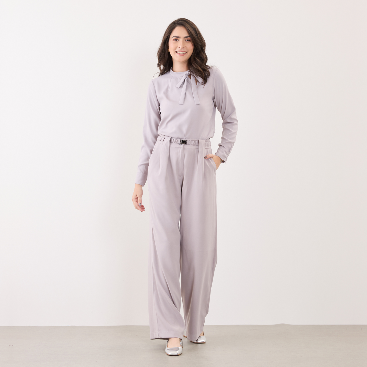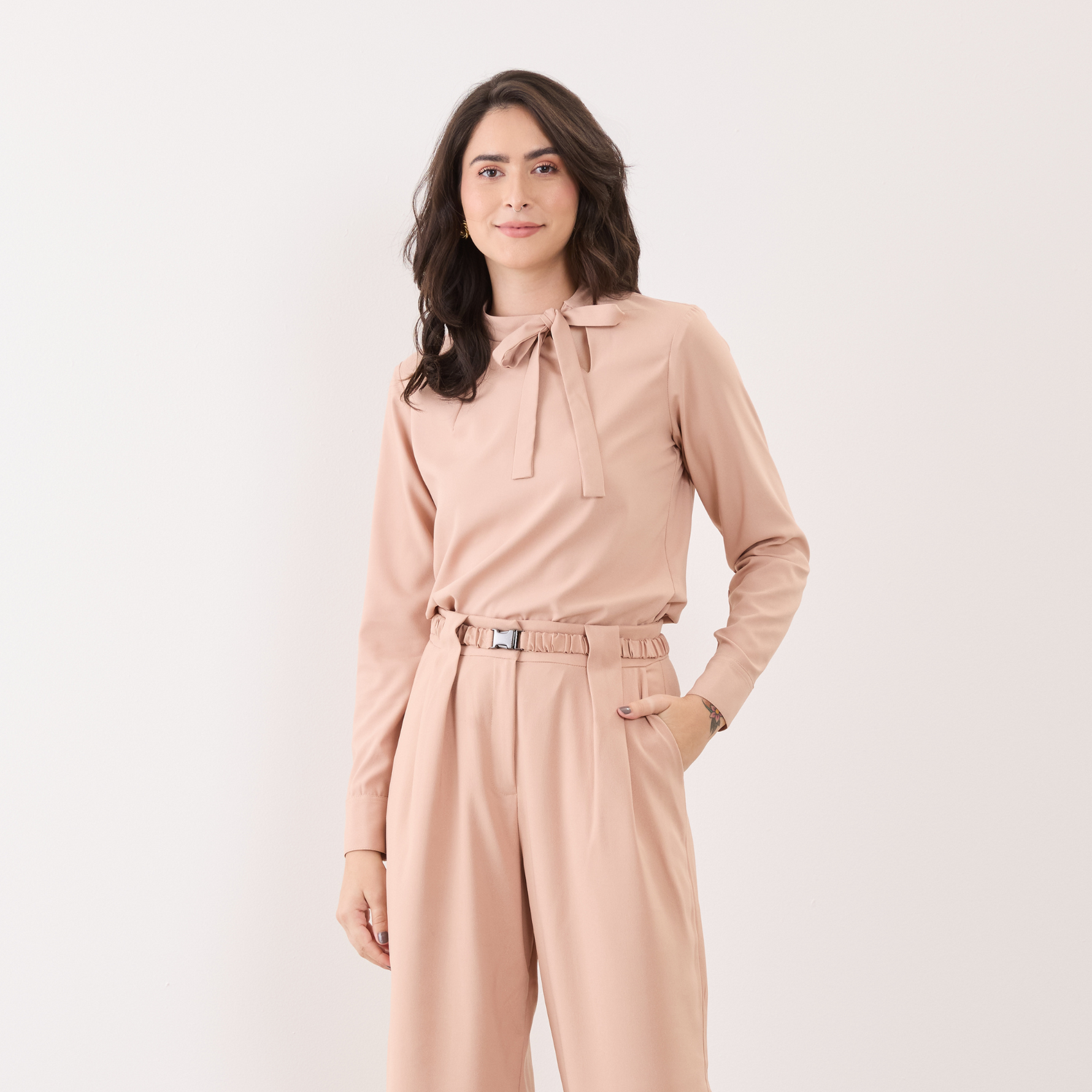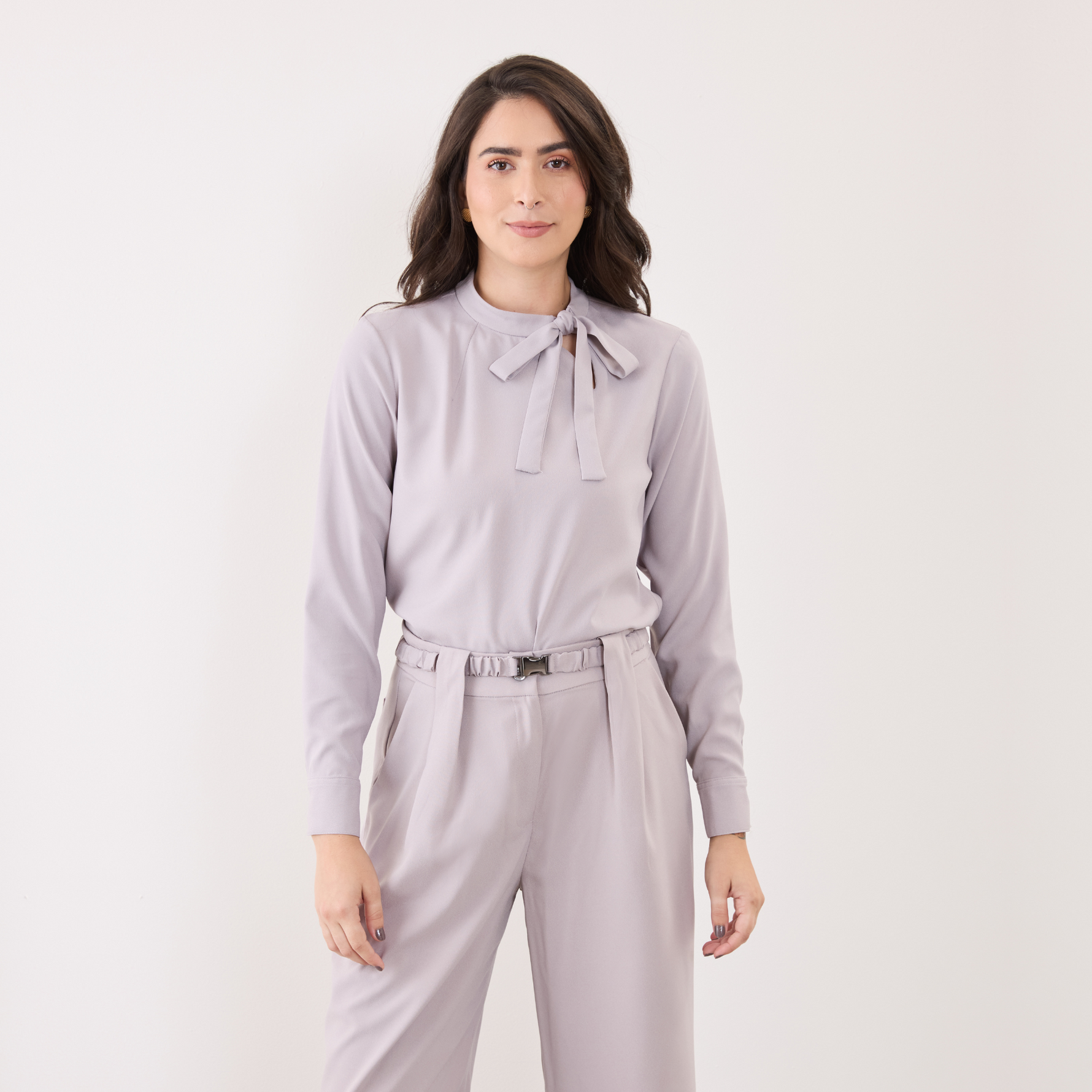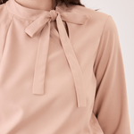 Além disso, a Blusa Feminina Manga Longa Lia possui uma amarração em laço na gola, o que adiciona um toque feminino e delicado ao visual.
