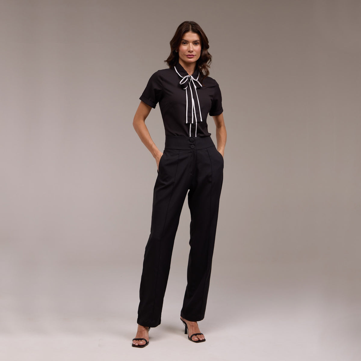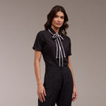 Para ressaltar ainda mais o design, a blusa possui detalhes em viés branco na borda da gola, do laço e do abotoamento. Essa adição contrastante proporciona sofisticação e destaque adicionais. Além disso, o fechamento frontal com botões simplifica o processo de vestimenta.