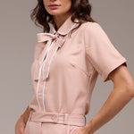 Com mangas curtas, ela traz uma sensação de frescor perfeita para os dias mais quentes. Sua gola laço é um elemento delicado e charmoso não só adiciona um toque de personalidade ao visual, como também oferece a flexibilidade de ajustar o aperto conforme sua preferência, criando um estilo mais personalizado.