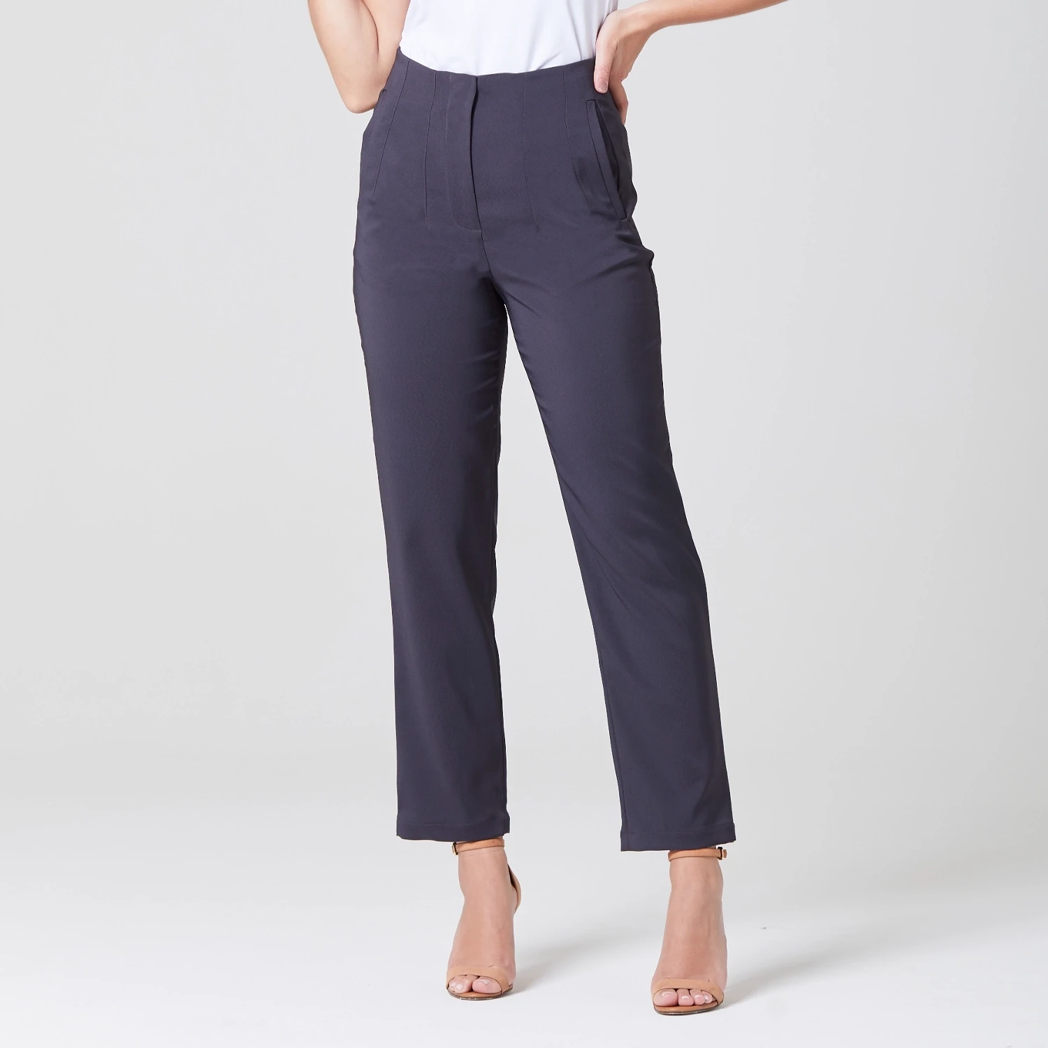Sua característica principal é a cintura alta, que não só garante um ajuste perfeito, mas também um visual mais alongado, proporcionando uma aparência mais esguia. Além disso, as pregas delicadamente dispostas na parte frontal realçam a silhueta e conferem um aspecto bem estruturado à peça.