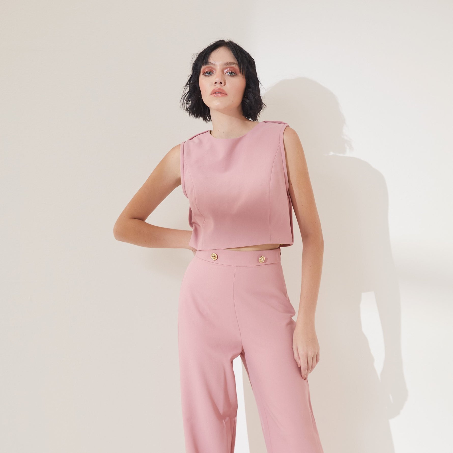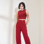 Os dois botões dourados no cós acrescentam um toque de refinamento à peça, enquanto os bolsos faca frontais e bolsos chapados traseiros garantem funcionalidade sem abrir mão do estilo. Disponível nas cores nude e vermelho escuro, é uma escolha versátil e elegante.
