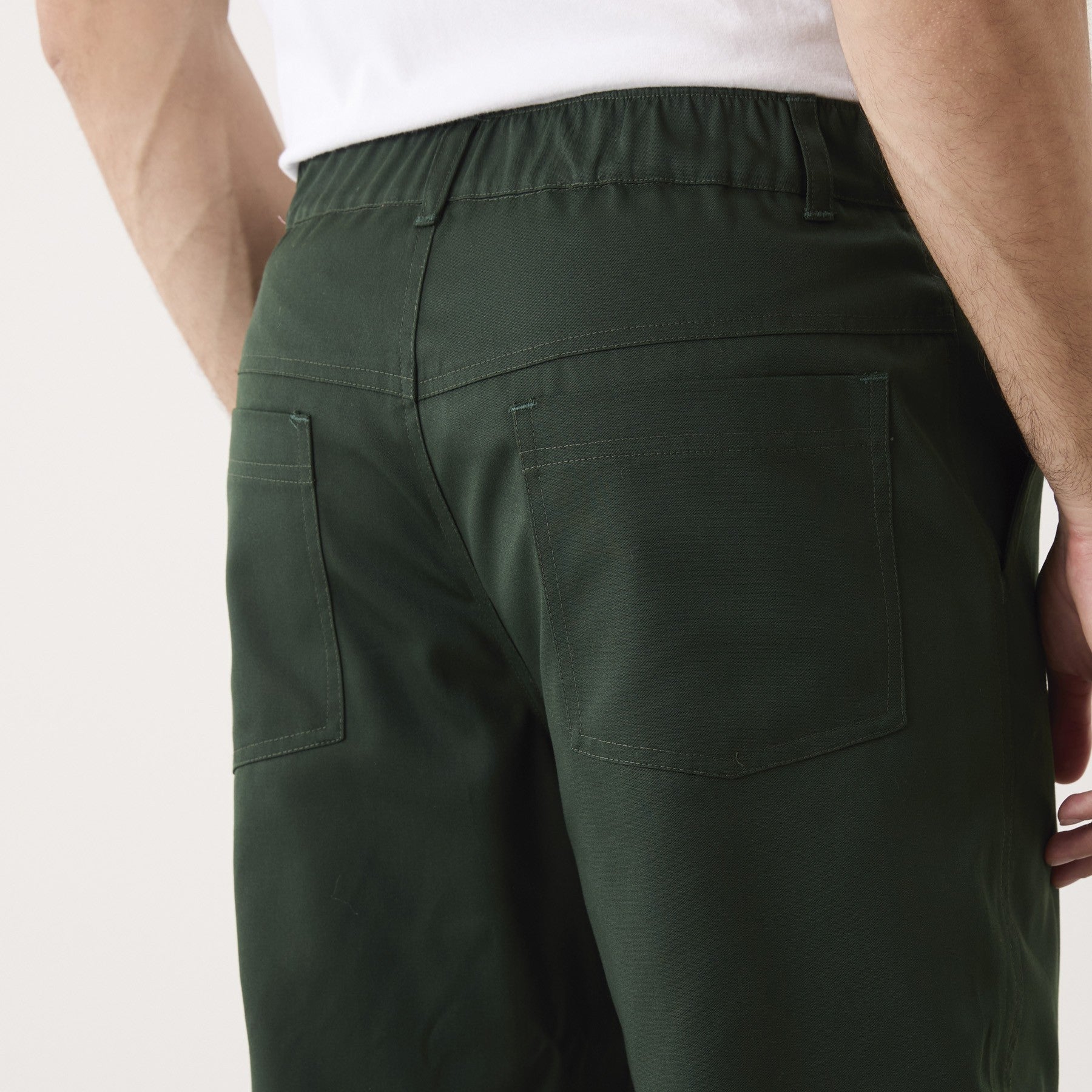 Na região das costas, a calça possui uma pala e dois bolsos chapados, proporcionando mais opções de armazenamento. O pesponto em linha branca confere um acabamento visual agradável e destaca os detalhes do design.