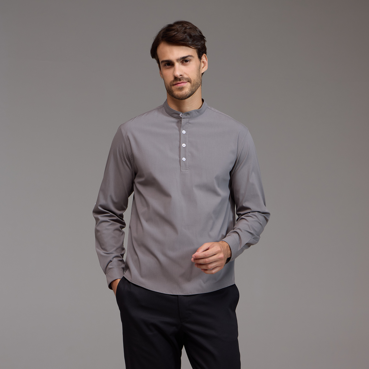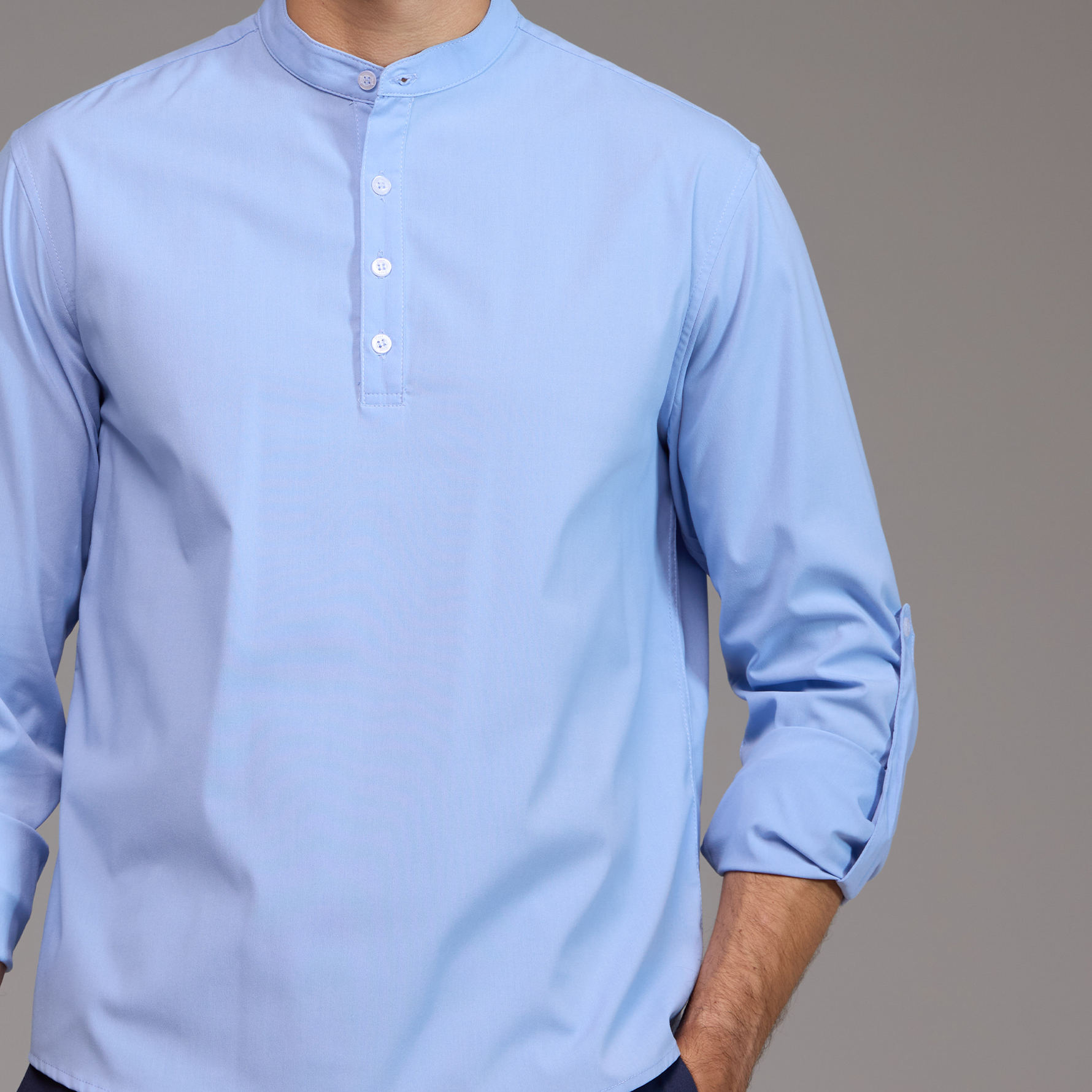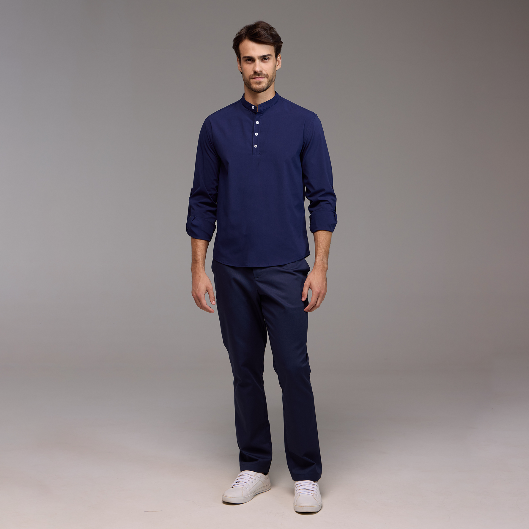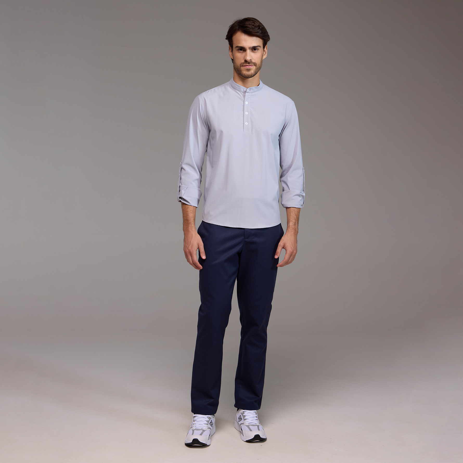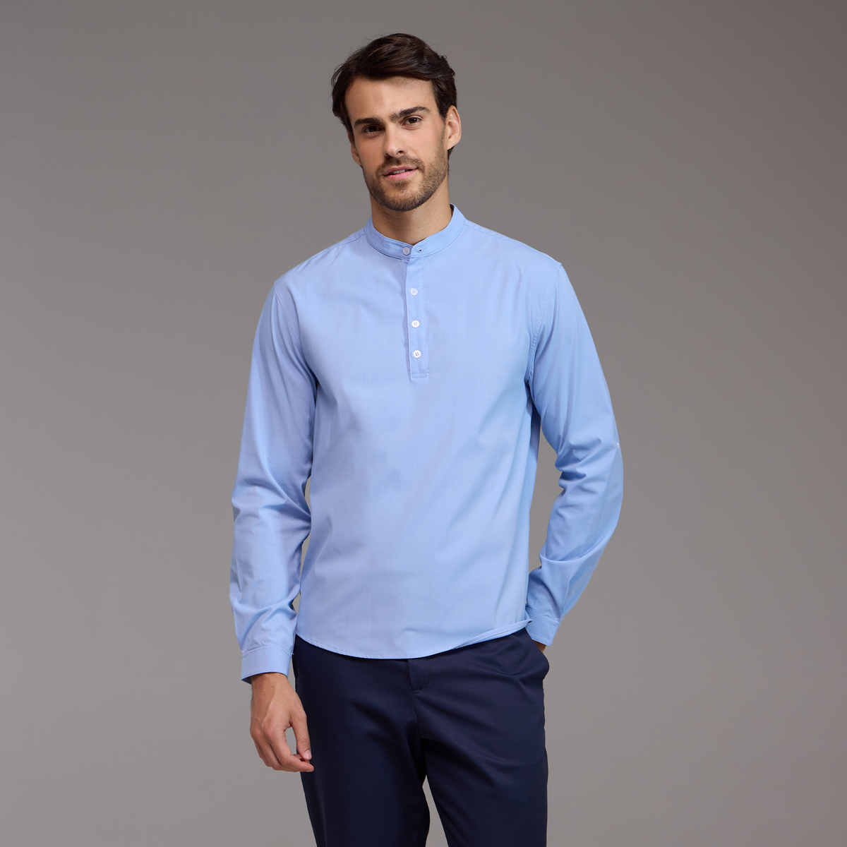O destaque desta camisa é a sua gola padre, que confere um toque sofisticado e contemporâneo ao visual. A camisa possui uma patte com 4 botões, permite que você ajuste a abertura até a altura do tórax de acordo com sua preferência, proporcionando praticidade ao vestir a camisa e uma maior ventilação em dias mais quentes.