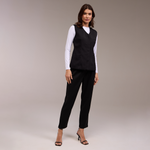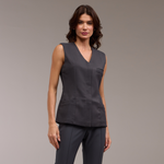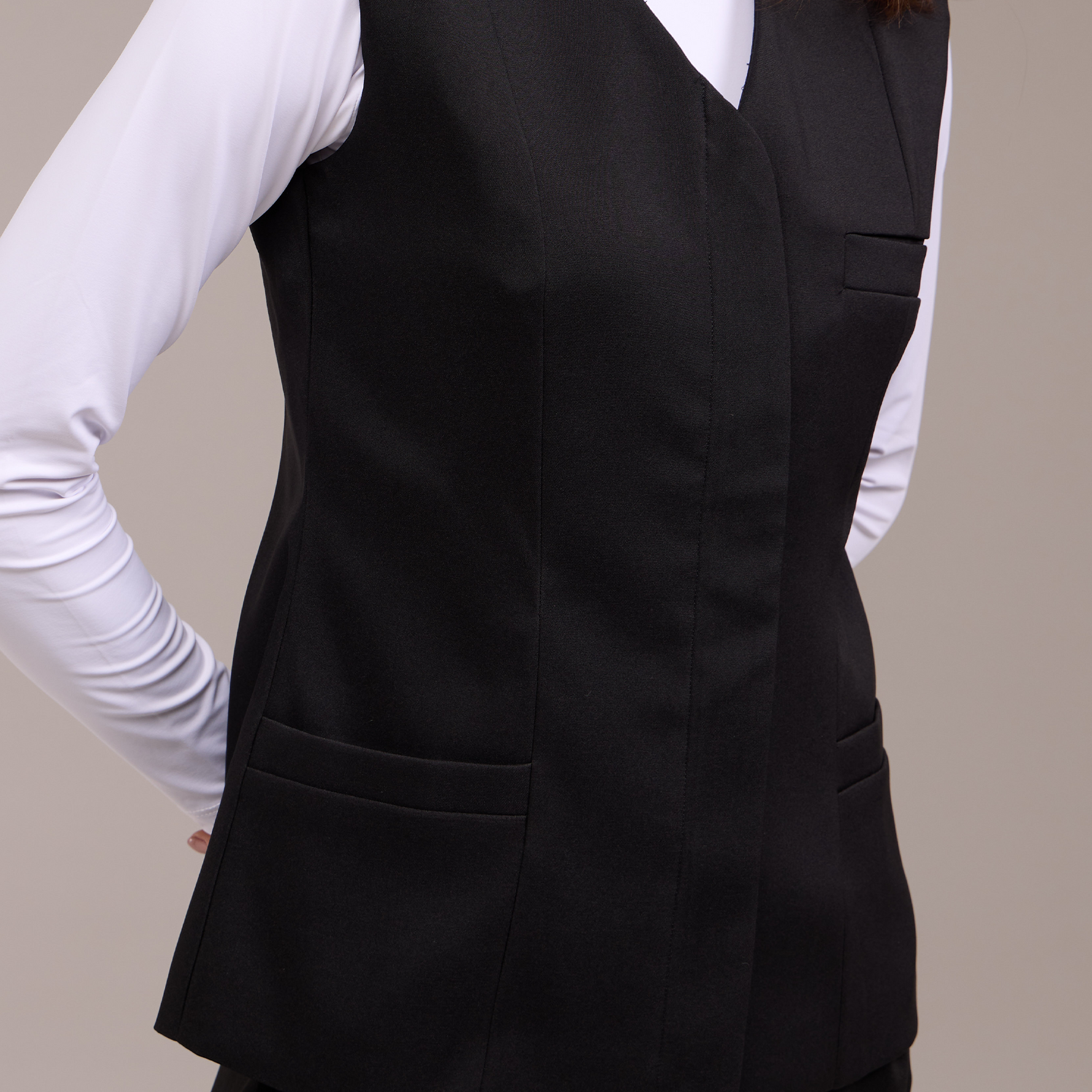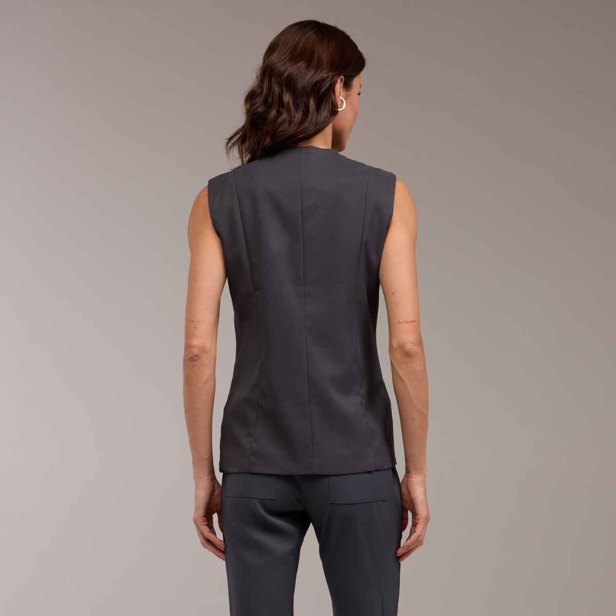 O colete é confeccionado em tecido de alfaiataria flex, proporcionando conforto e mobilidade. Esse tipo de tecido é conhecido por sua durabilidade e resistência, além de manter a forma mesmo após várias lavagens.