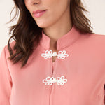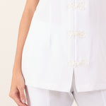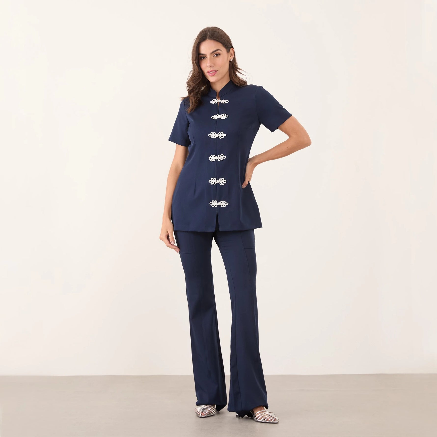 Com um design moderno e sofisticado, o jaleco possui gola padre e um detalhe de arabescos delicados na frente, que agregam informação de moda e design à peça.