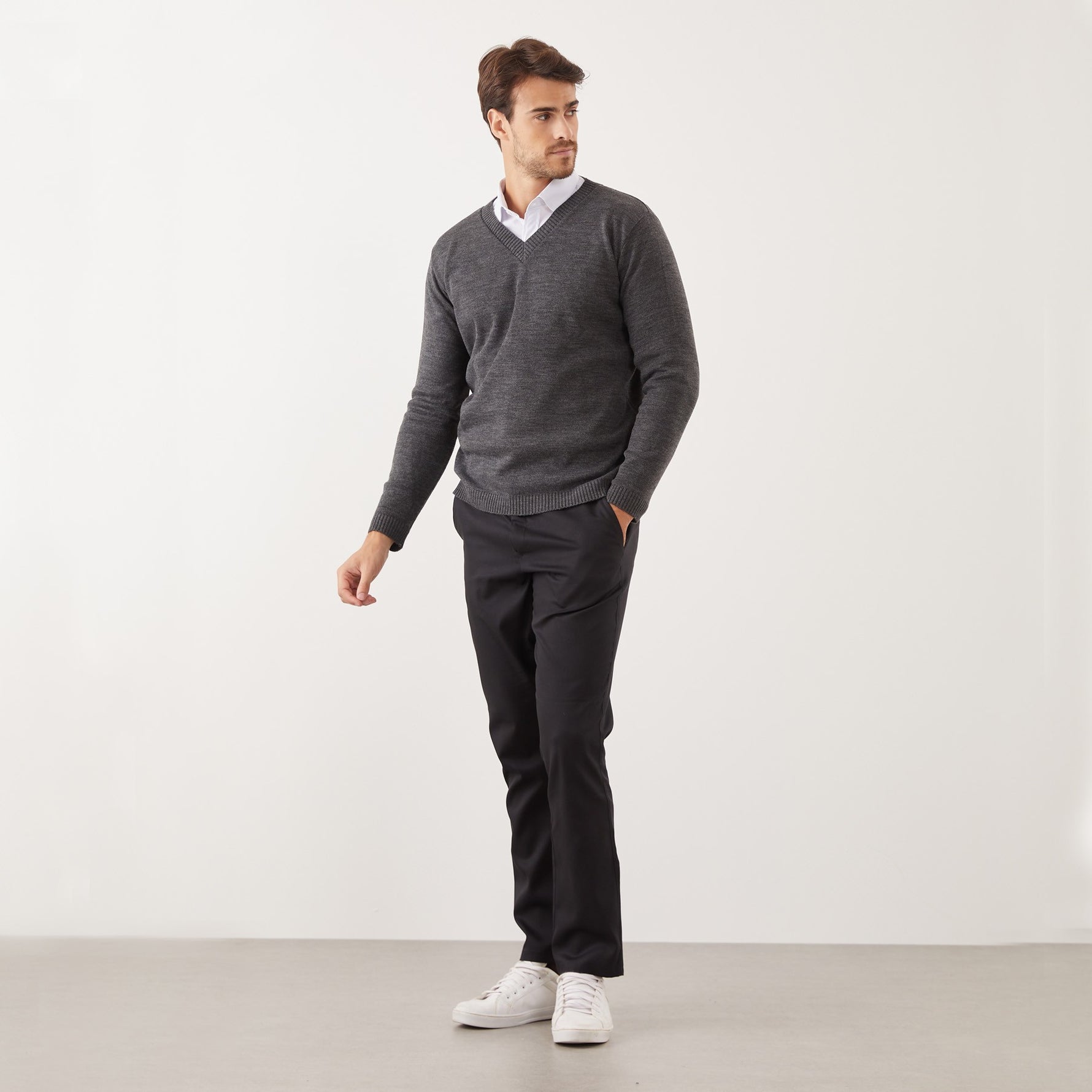 Gola V - A gola V direciona o olhar para o rosto e destaca o colarinho, adicionando um elemento de destaque ao visual.