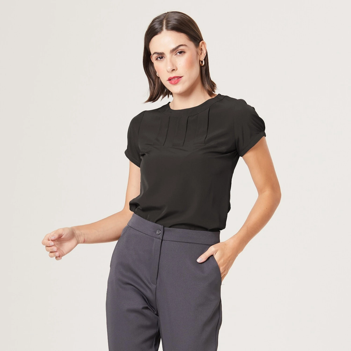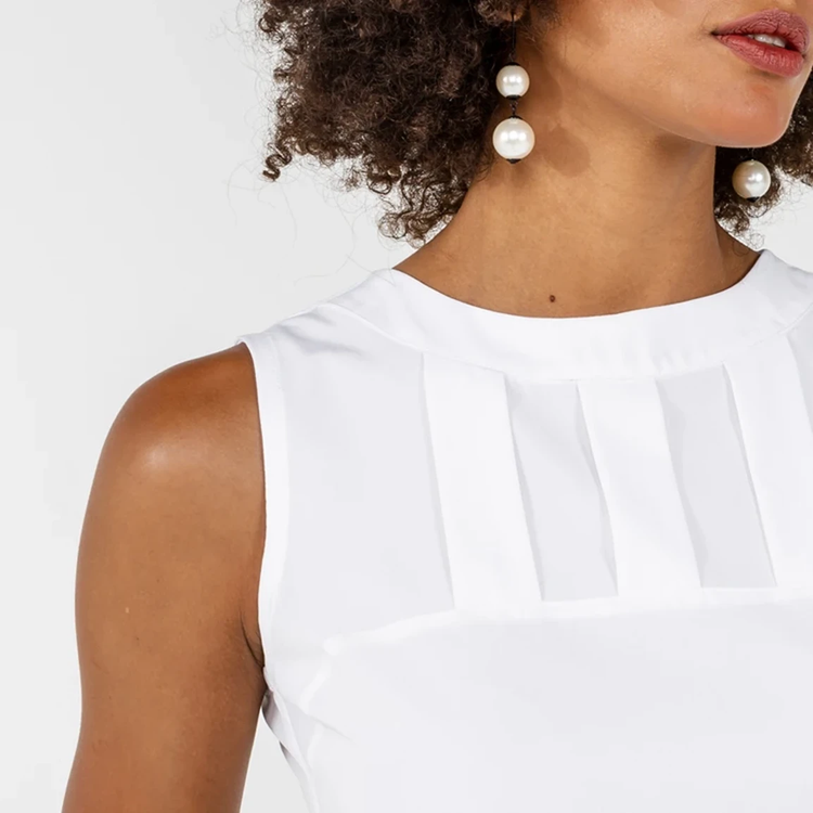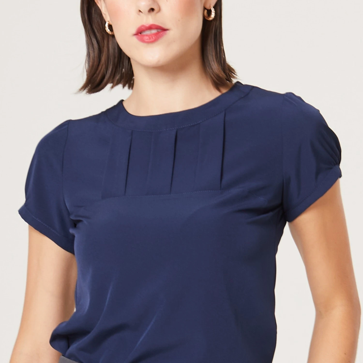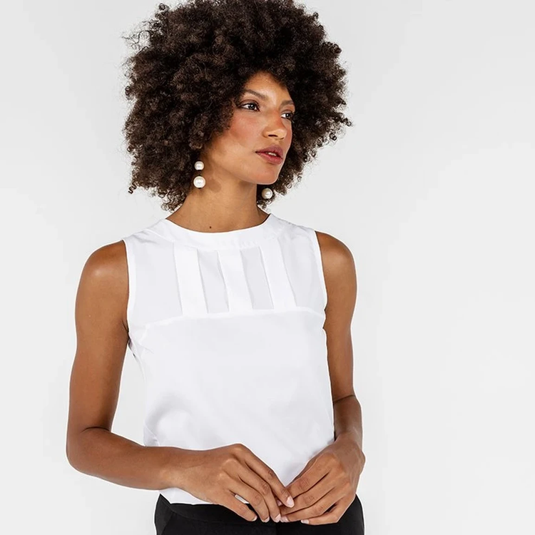 Seu destaque são as 3 pregas e o recorte na horizontal delicadamente posicionados na região do busto que tornam a peça moderna e diferenciada para o ambiente de trabalho.