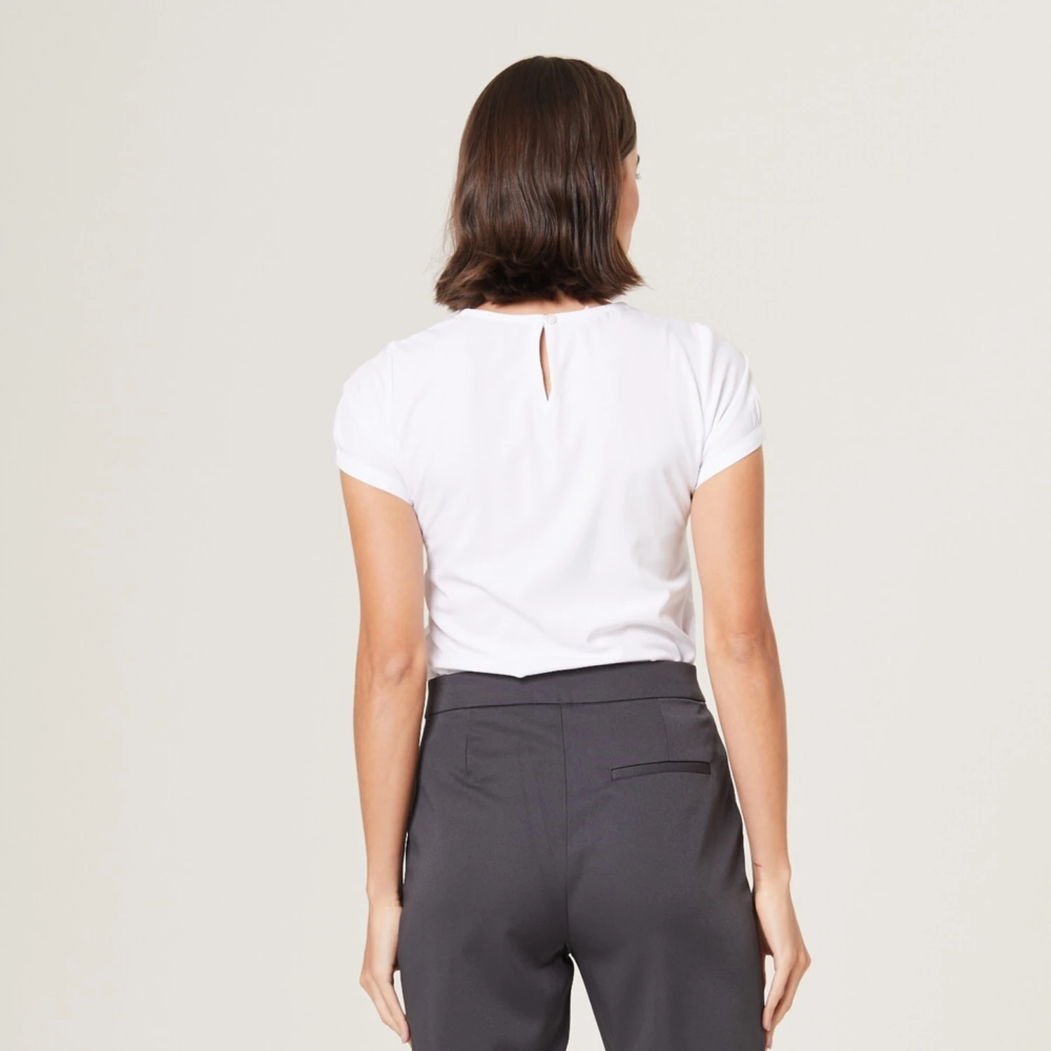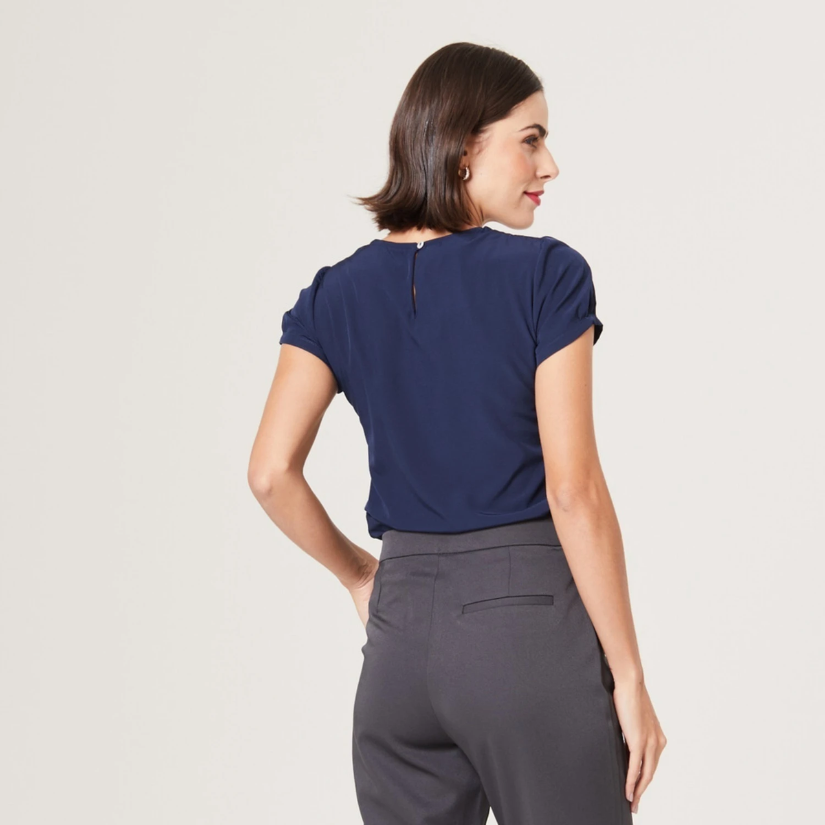 Pensando na praticidade e no cuidado com os detalhes, a Blusa Eliane também conta com um botão discreto nas costas. Esse elemento não apenas adiciona um toque de elegância, mas também facilita o vestir da peça.
