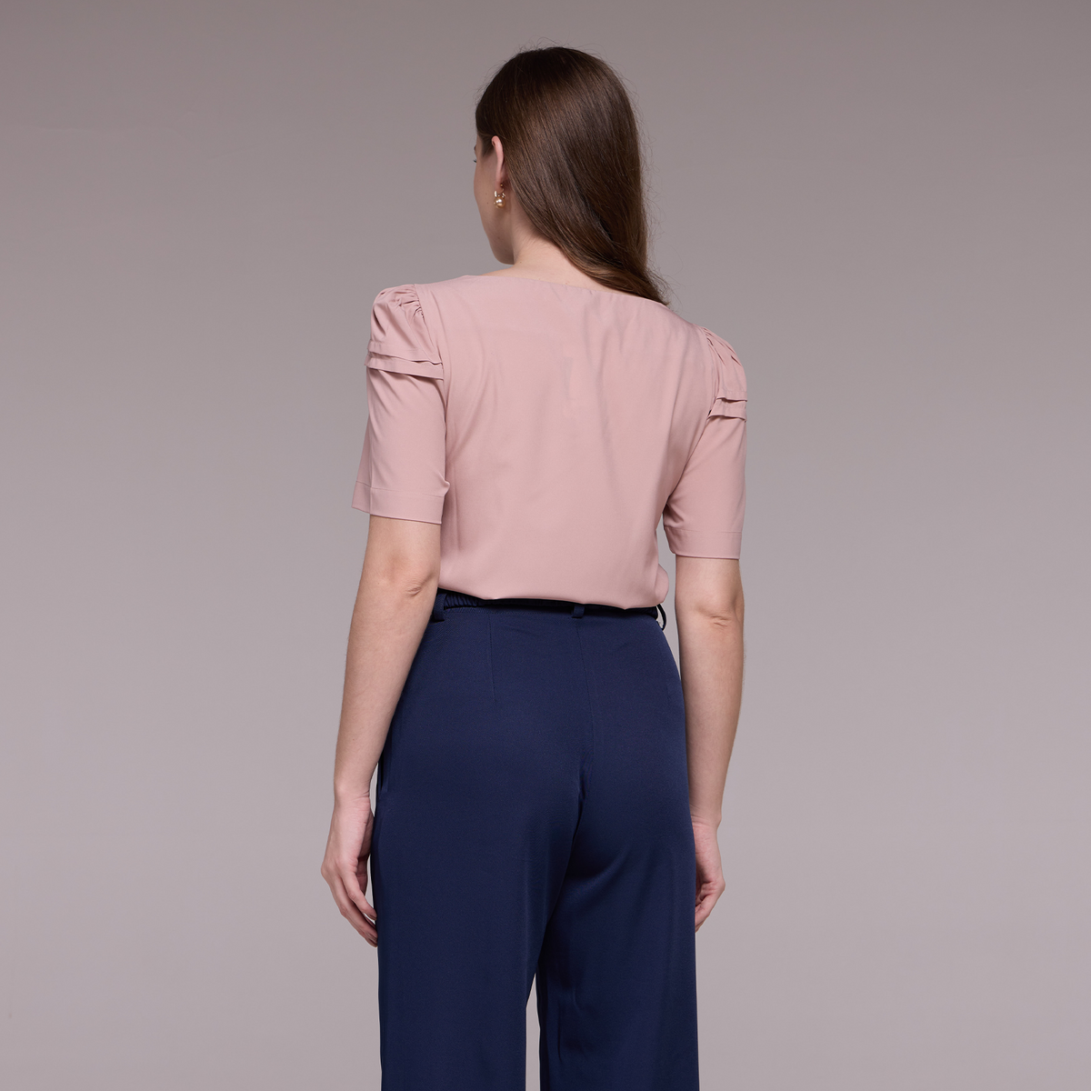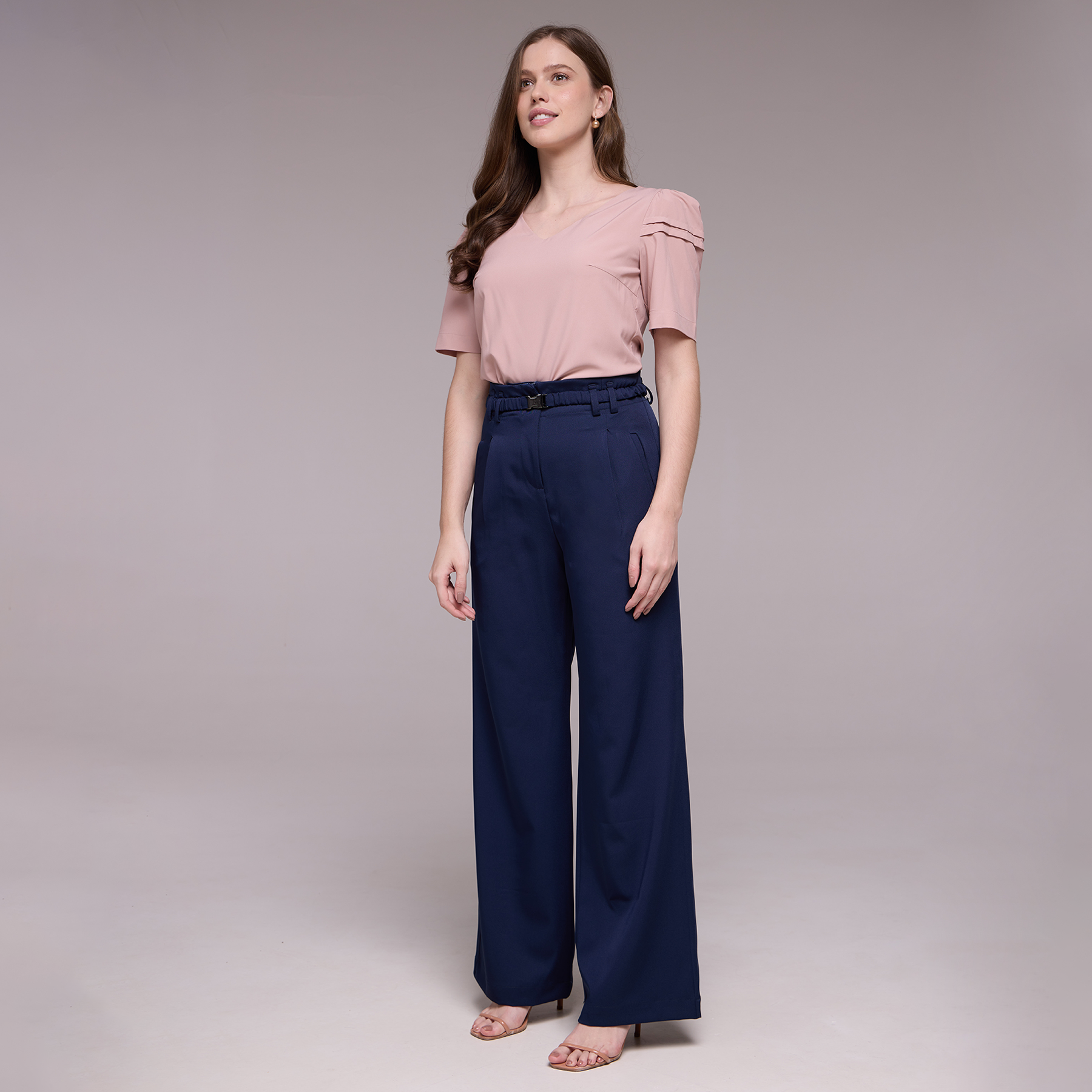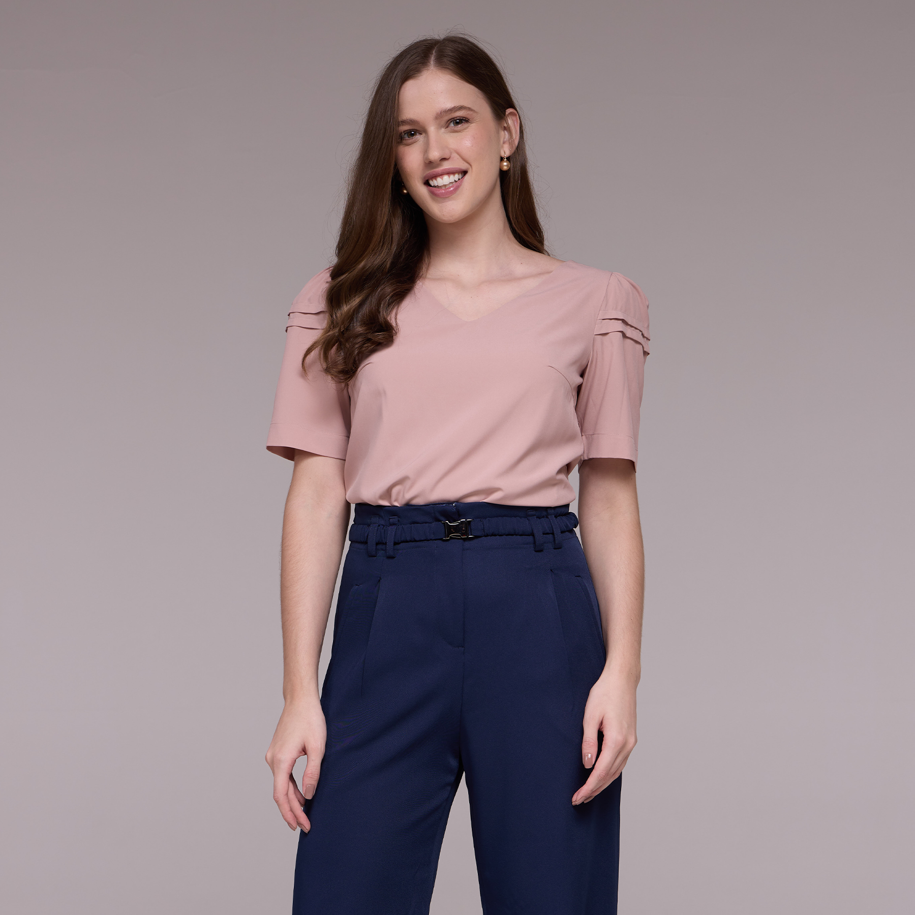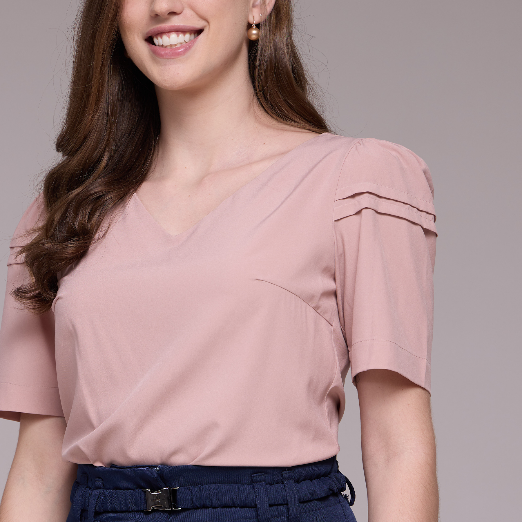 A Blusa Feminina Manga Curta Magda contém decote em V, suas mangas curtas com detalhe e pregueadas dão a elegância e leveza à peça, modelagem reta e comprimento longo.