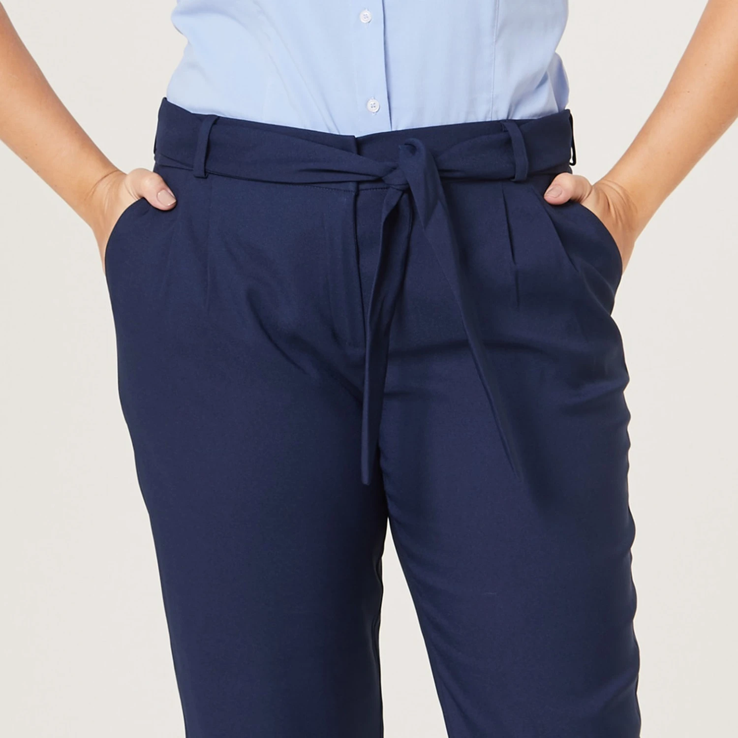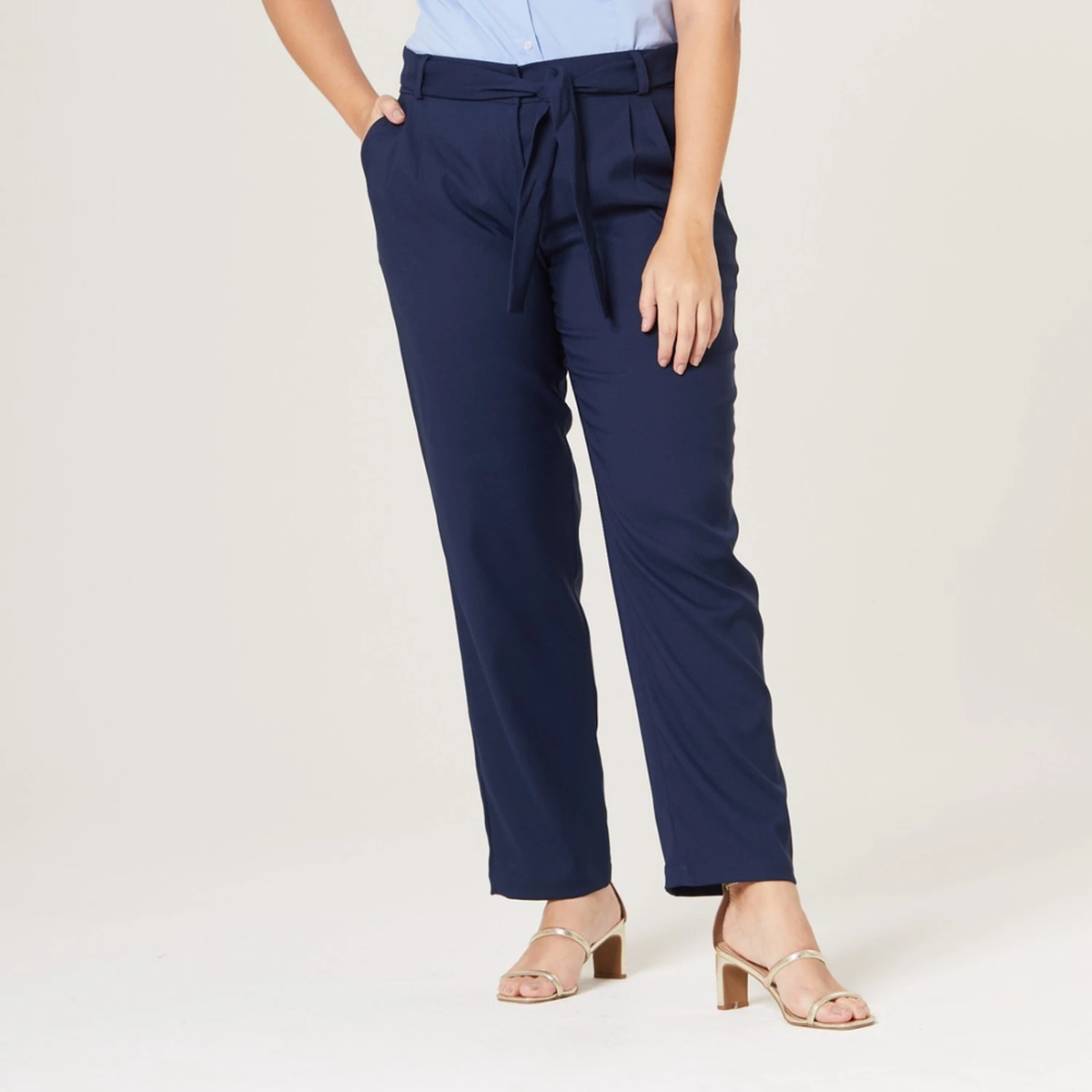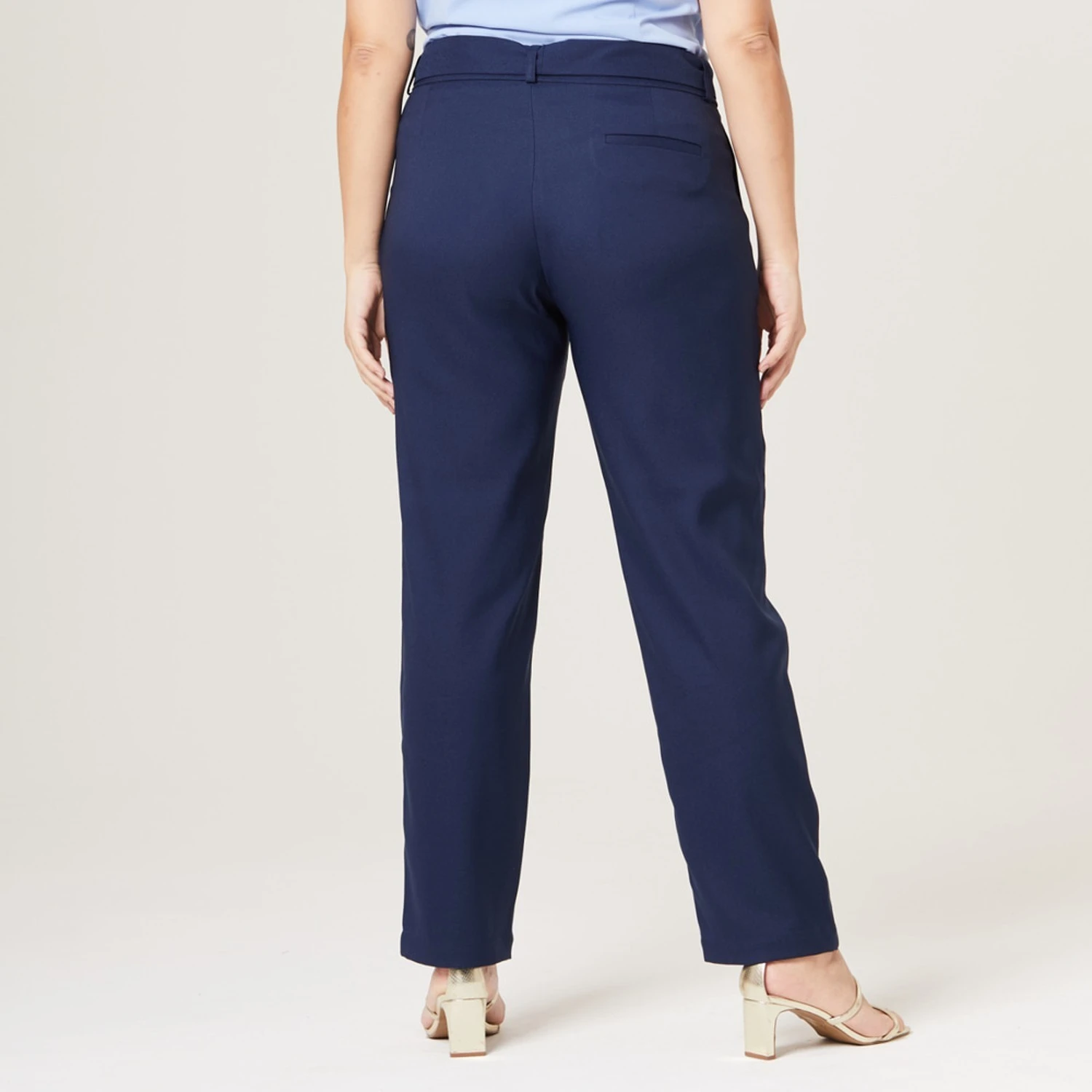 Uma faixa cinto, confeccionada no mesmo tecido da calça, acompanha a peça, ajudando a acentuar a cintura alta e criando um efeito visual interessante. Além disso, contribui também para ajustar a calça ao corpo de maneira personalizada.