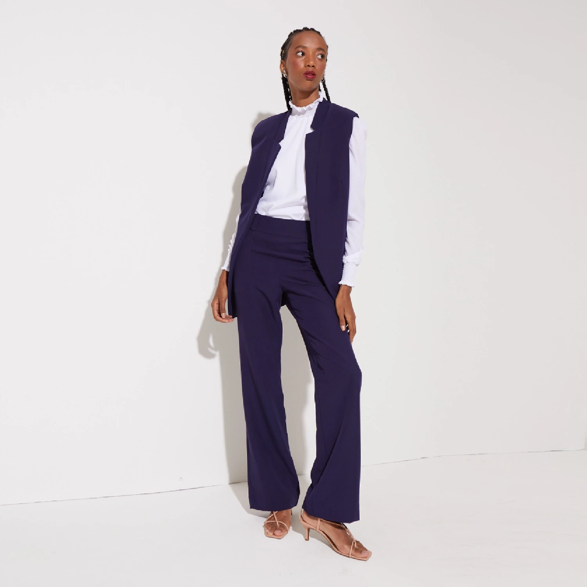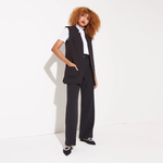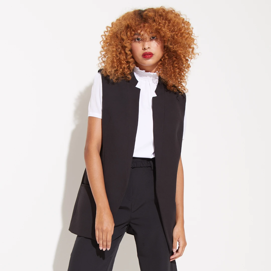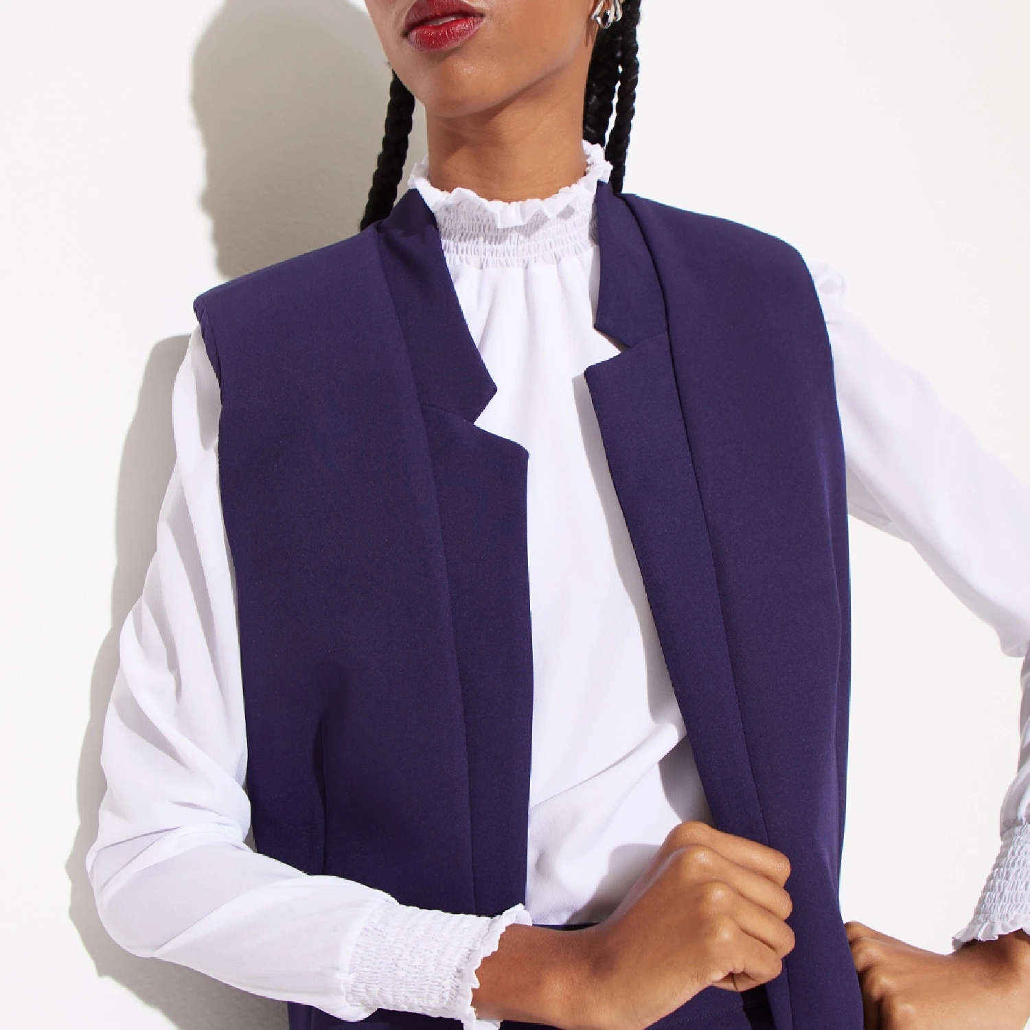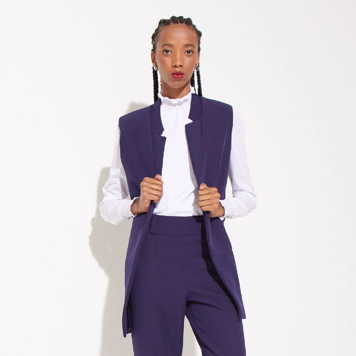 O Colete Feminino Rúbia apresenta uma gola invertida que cria um visual diferenciado, chamando a atenção para a região do pescoço.