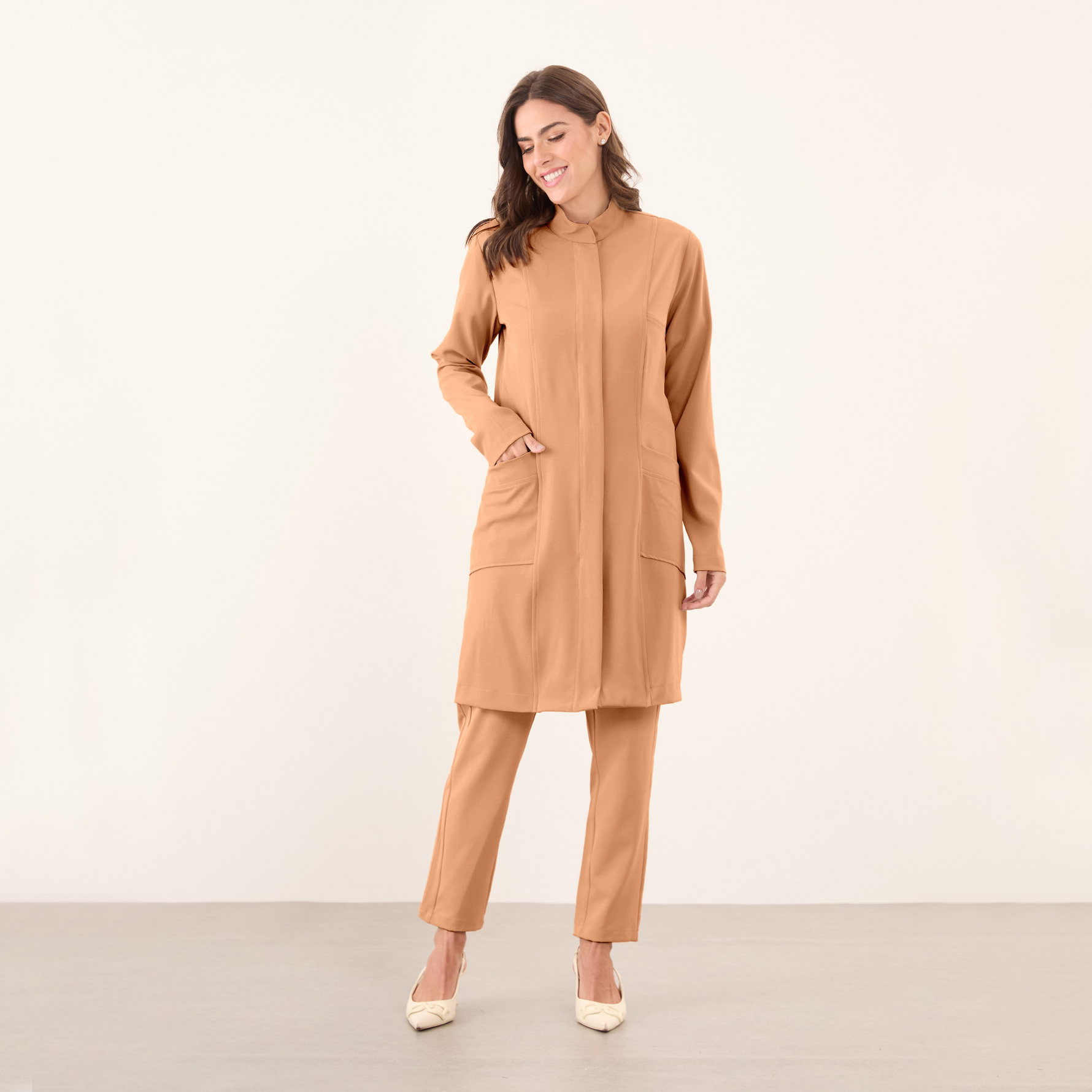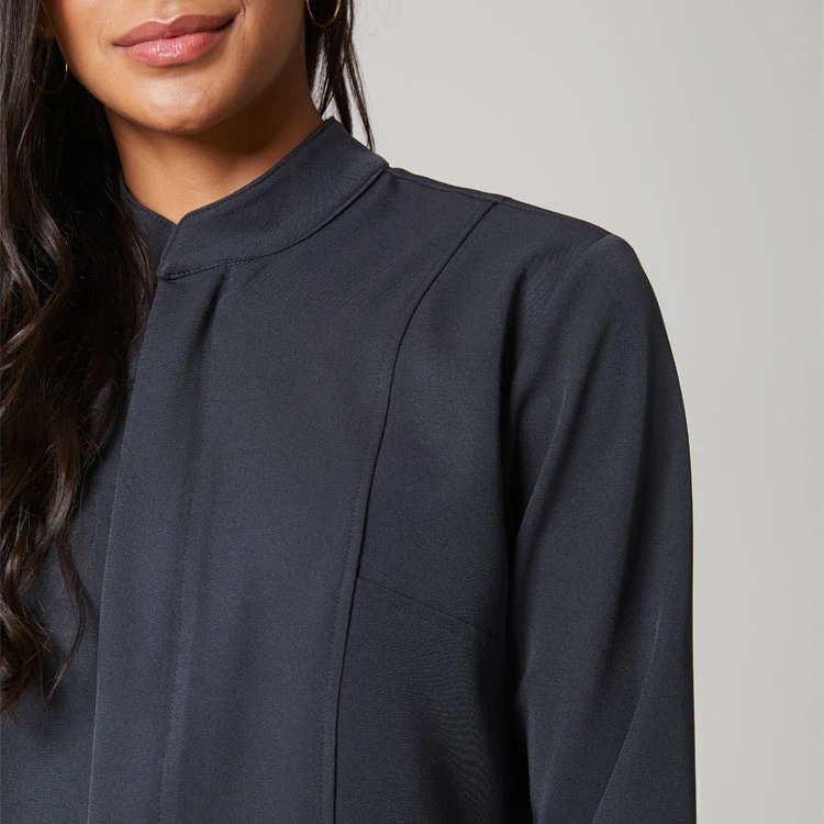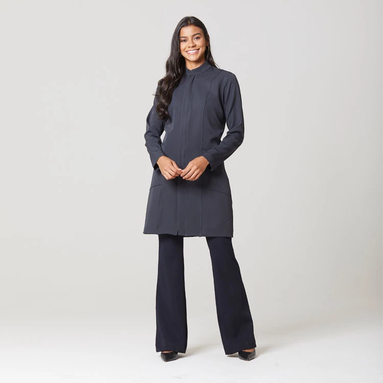 O Jaleco Feminino Gola Padre Georgia é uma peça de vestuário elegante e funcional. Possui uma gola padre, que é uma gola alta e reta que confere um aspecto sofisticado ao jaleco.
