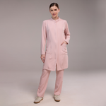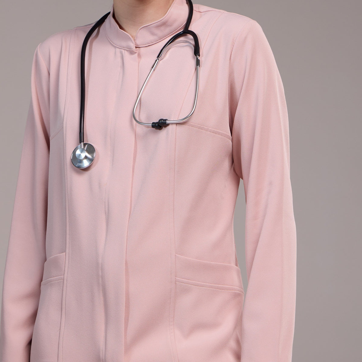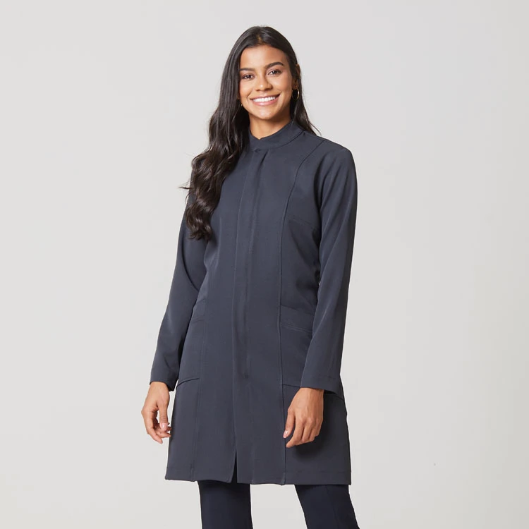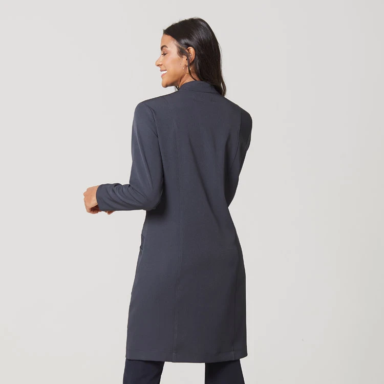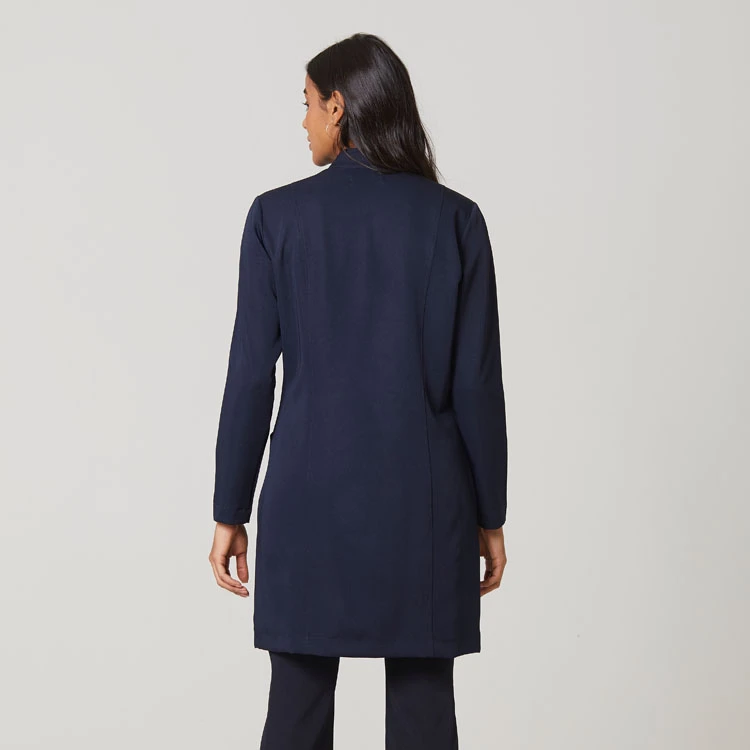 O jaleco apresenta um recorte saindo dos ombros até a base, o que adiciona um toque de estilo e uma aparência mais alongada.
