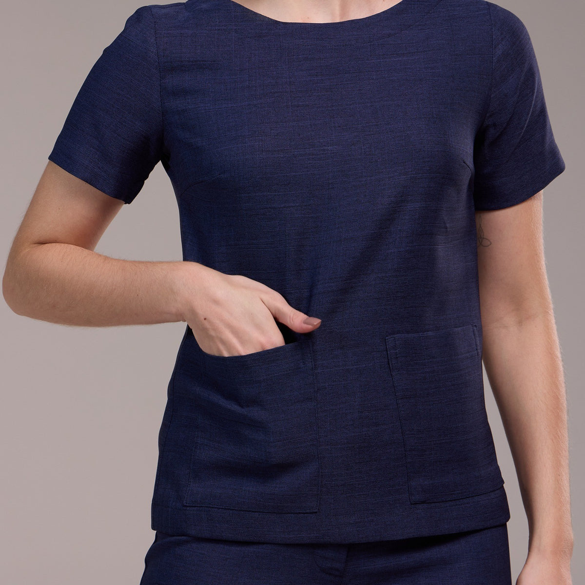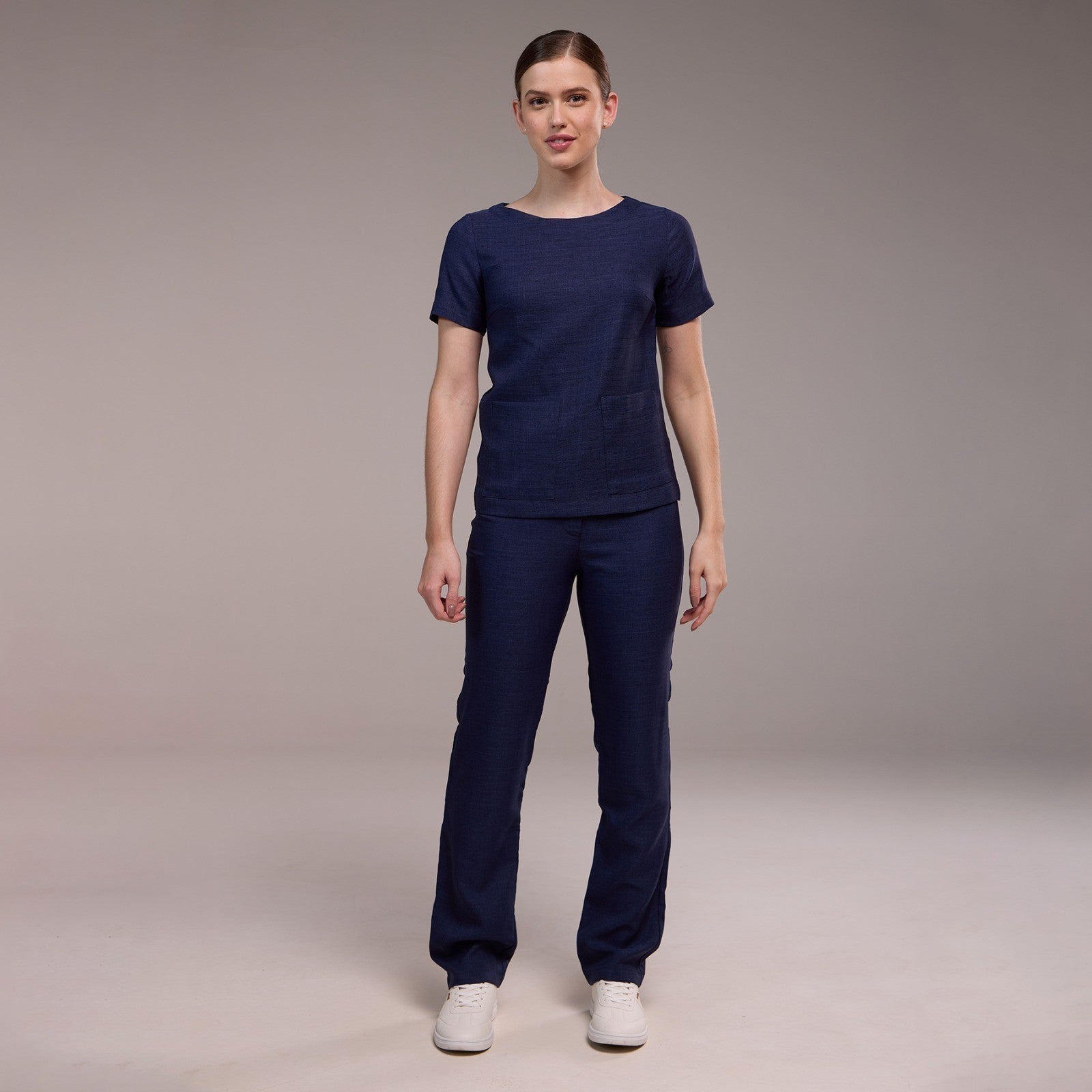 O decote canoa confere um toque de sofisticação ao uniforme, proporcionando uma aparência moderna e feminina. Este design de decote também contribui para um caimento mais suave e soltinho do jaleco.