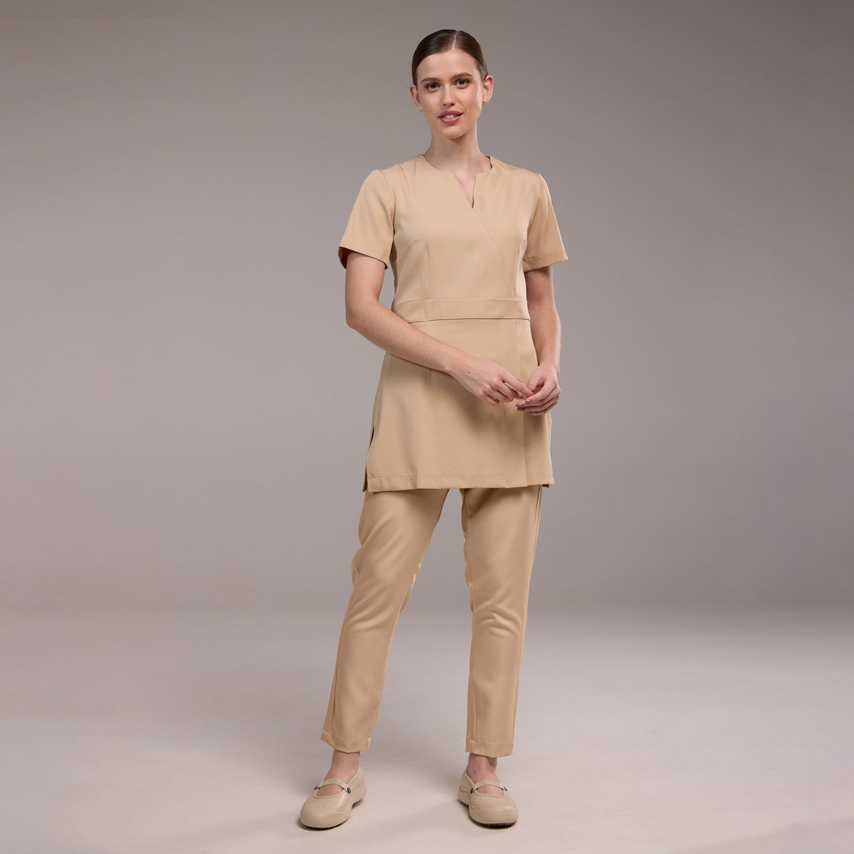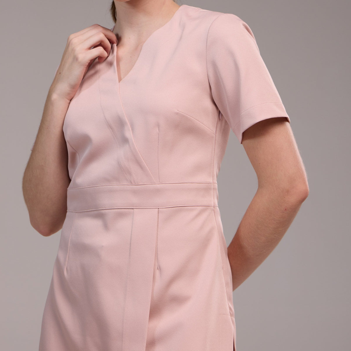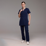 O Jaleco Feminino Trespassado Melanie é uma peça de vestuário que possui um decote arredondado em formato de V. Ele apresenta um detalhe trespassado no busto e no corpo, o que significa que uma parte do tecido é cruzada sobre a outra, criando um efeito visual interessante. Além disso, o jaleco possui uma faixa na cintura, que ajuda a definir a silhueta e acrescenta um toque de estilo ao modelo.
