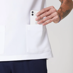 Uma característica adicional do jaleco Galileu são as aberturas nas laterais. Essas aberturas permitem maior mobilidade e conforto ao caminhar, além de conferir um caimento soltinho à peça.