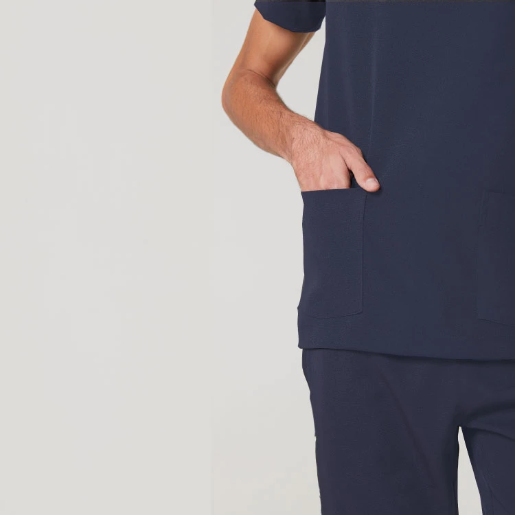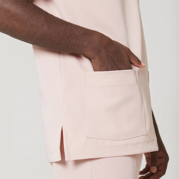 Na base do jaleco, na altura da cintura, existem dois bolsos chapados. Esses bolsos são planos, sem dobras, e oferecem espaço para armazenar pequenos objetos, como canetas, blocos de anotações ou equipamentos médicos de uso frequente.