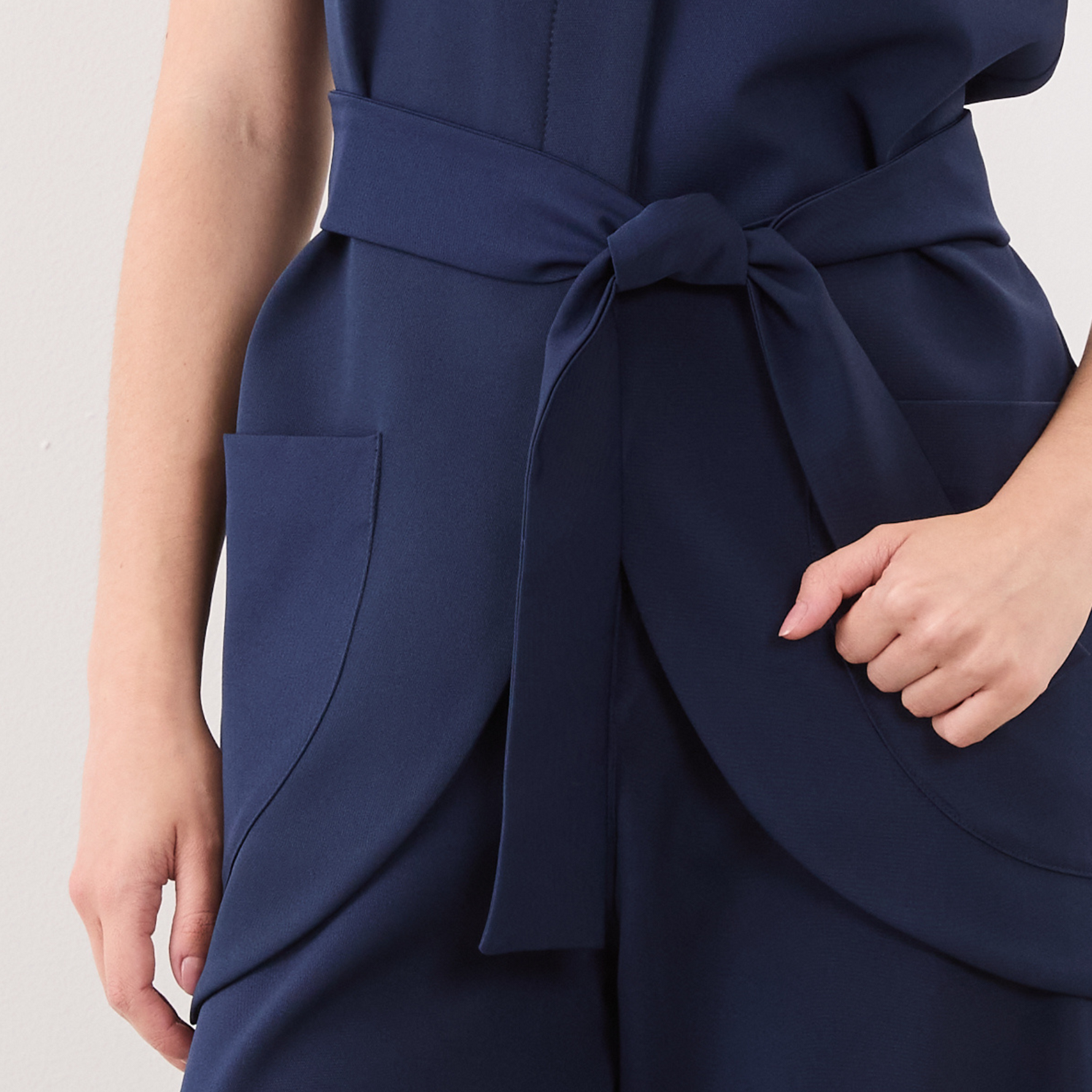 Ele possui também uma faixa no próprio tecido, preso por passantes, que servem para ajustar a cintura e também trazer um charme a mais para o visual.
