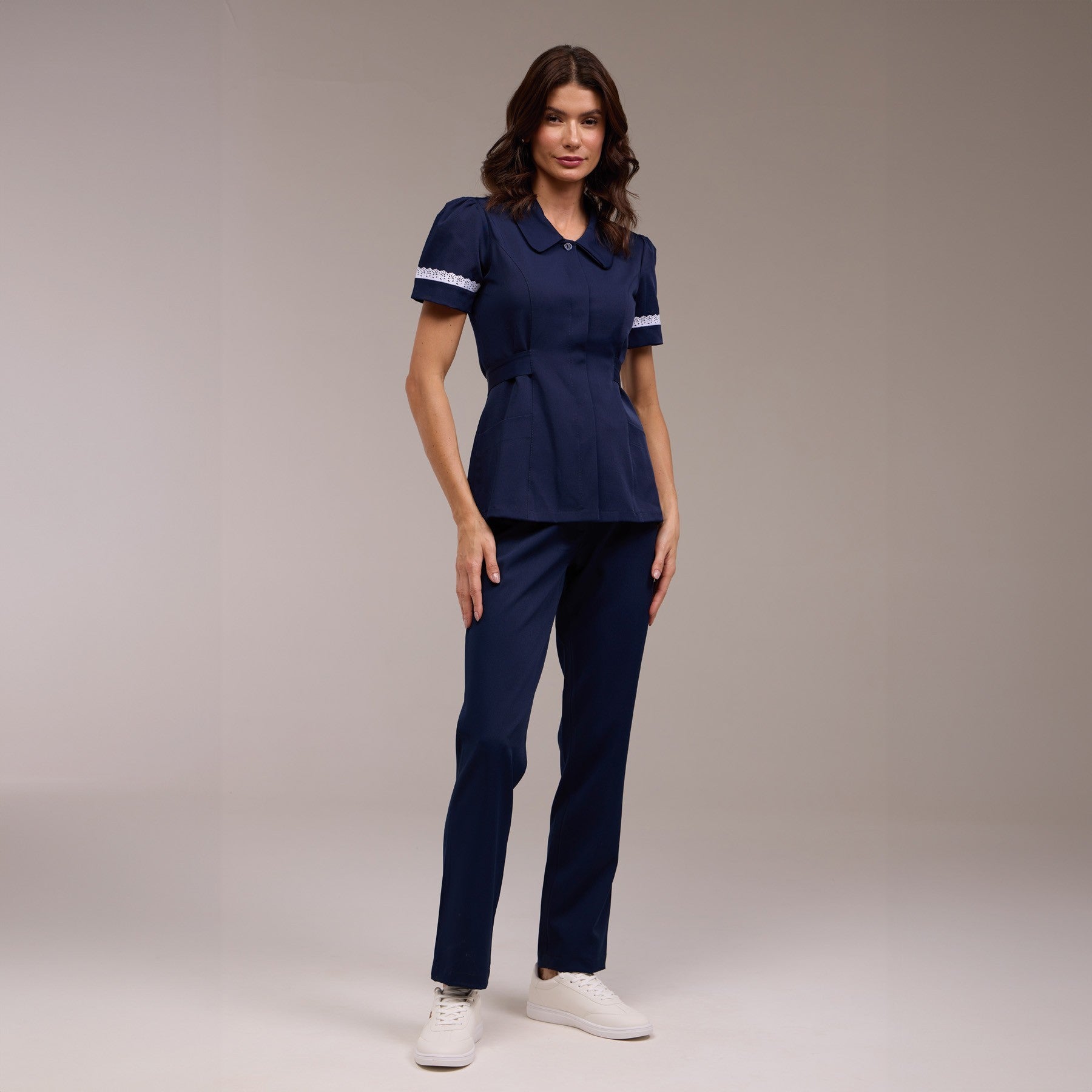 A gola do jaleco é redonda, oferecendo um visual clássico e discreto. O abotoamento é embutido, com o primeiro botão visível, o que torna o acabamento mais refinado e discreto, conferindo um mais segurança à peça. Além disso, o acabamento embutido serve para proteger os botões do desgaste diário.