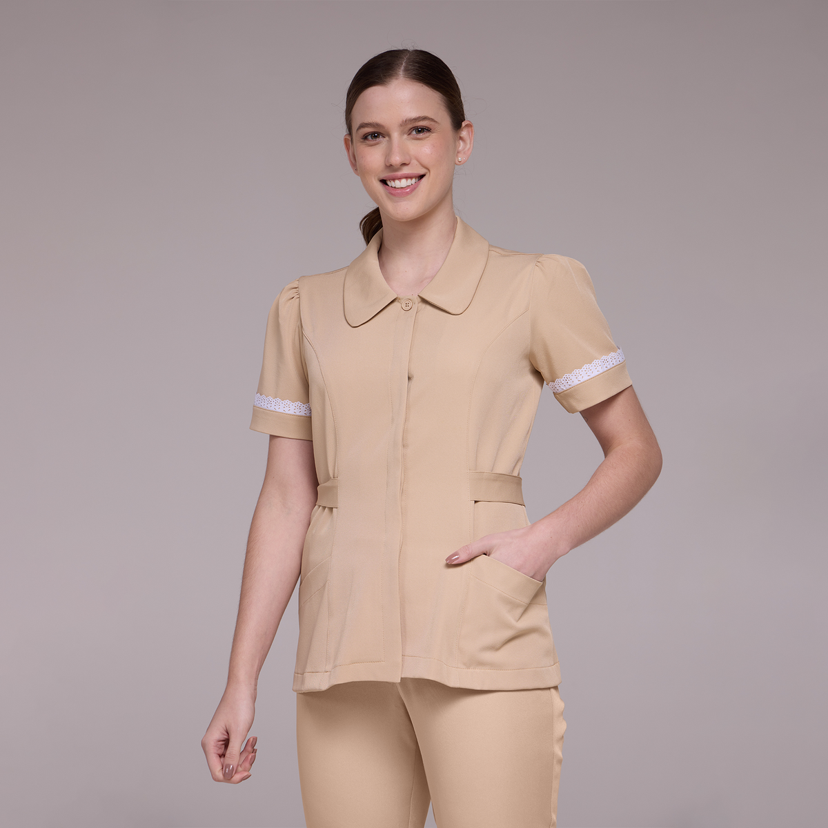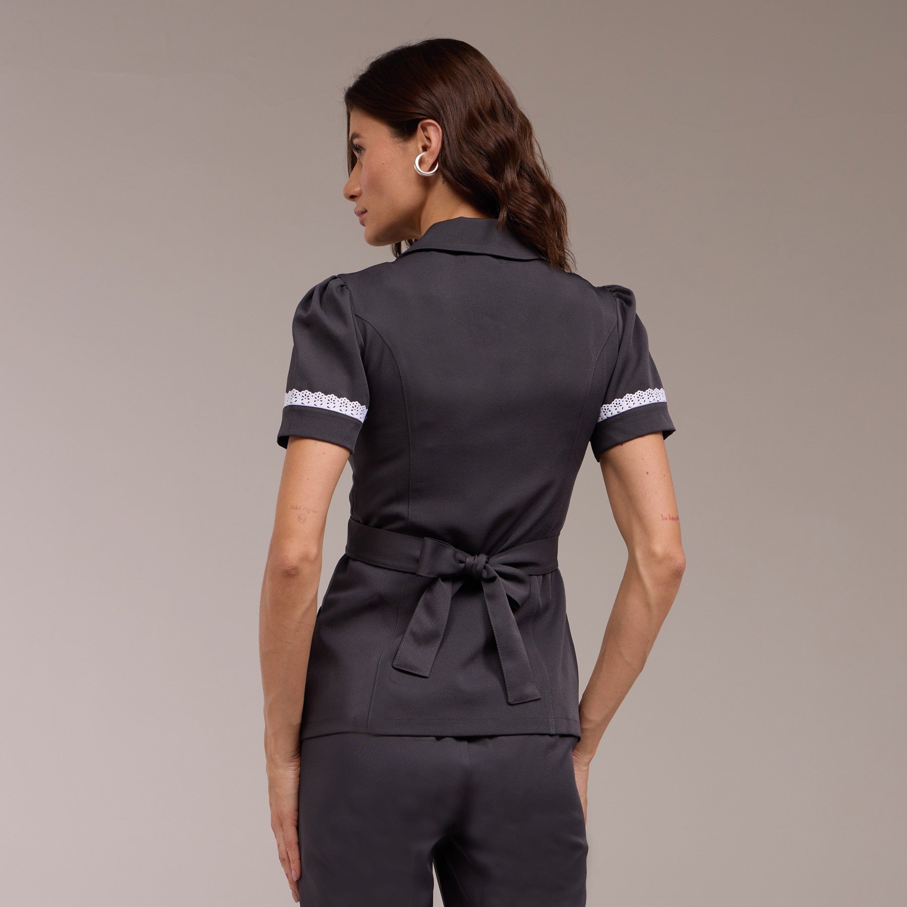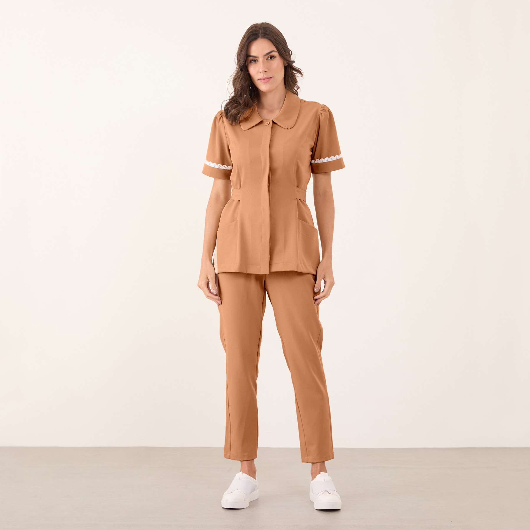 O Jaleco Feminino Manga Curta Ísis possui mangas curtas, o que torna a peça mais confortável e adequada para climas mais quentes ou para quem prefere maior mobilidade nos braços. Além disso, as mangas são levemente bufantes e possuem detalhes em renda, que conferem um aspecto delicado e feminino à peça.