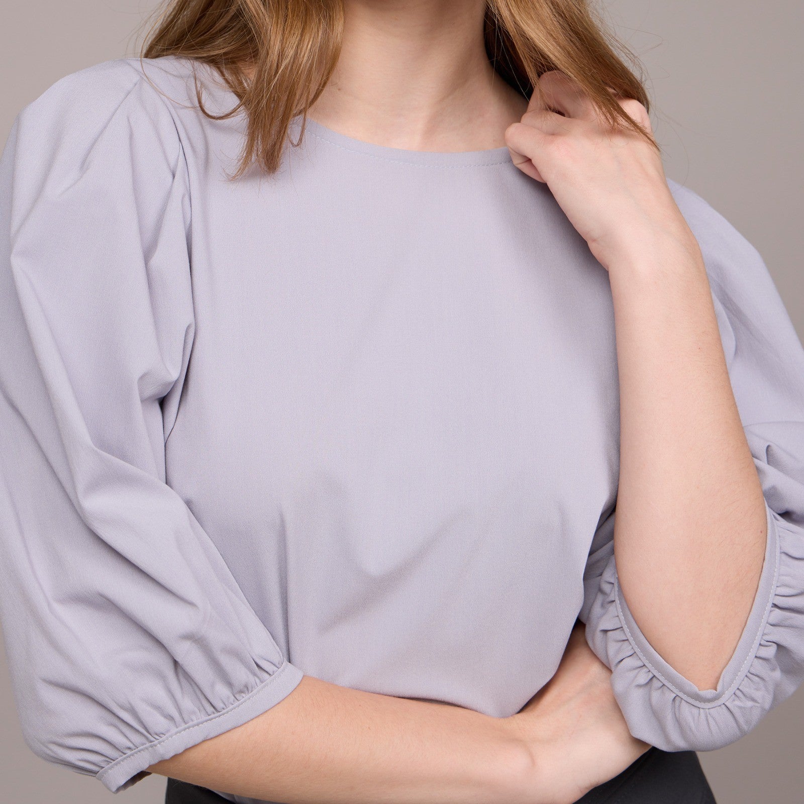 Cada manga bufante termina com um elástico na altura do cotovelo. Esse elástico ajuda a manter o volume da manga e proporciona um ajuste confortável no cotovelo, evitando que as mangas escorreguem para cima.