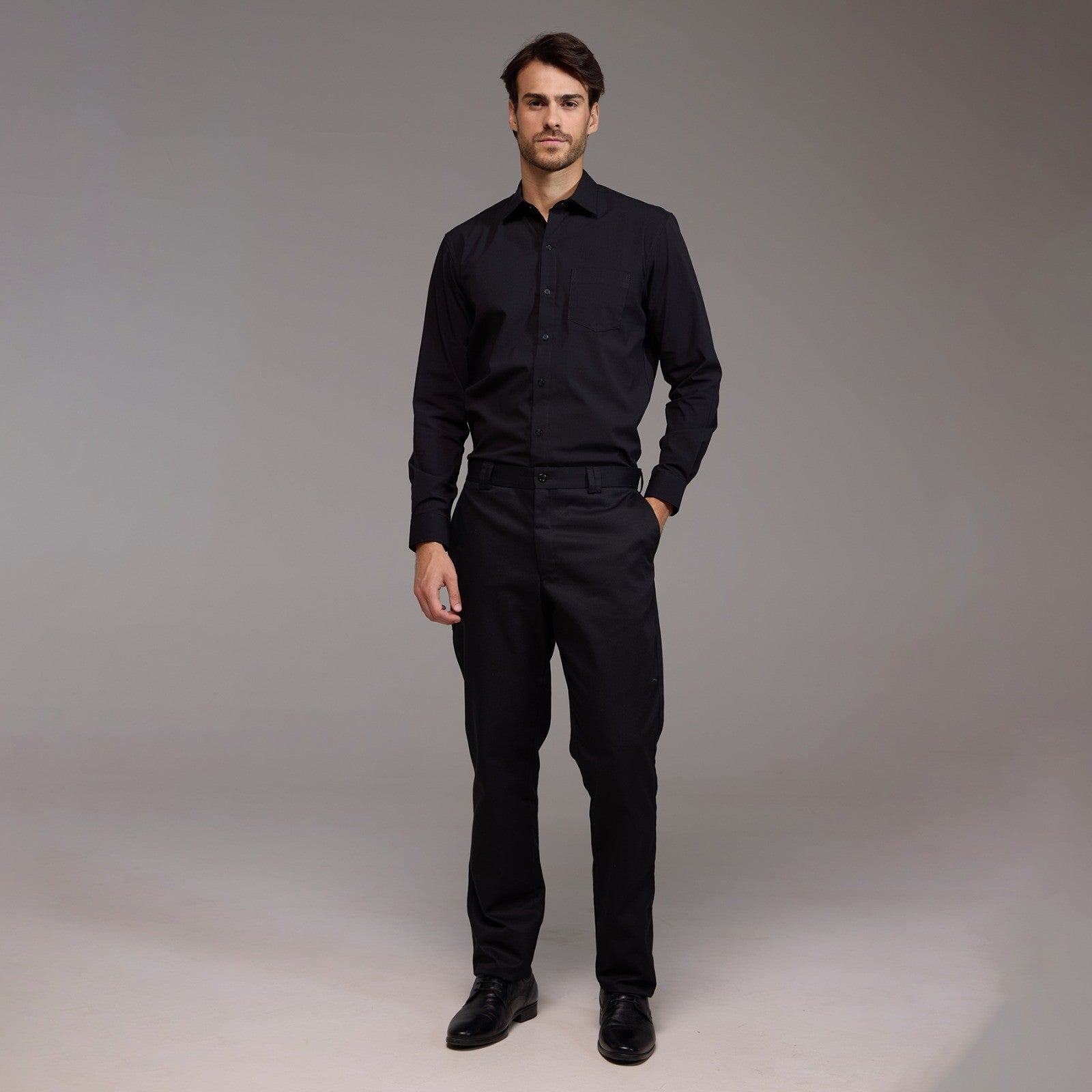 A camisa possui um abotoamento frontal simples, isso permite fácil colocação e remoção da peça, além de dar um aspecto limpo e organizado.