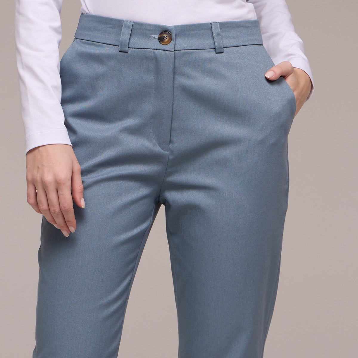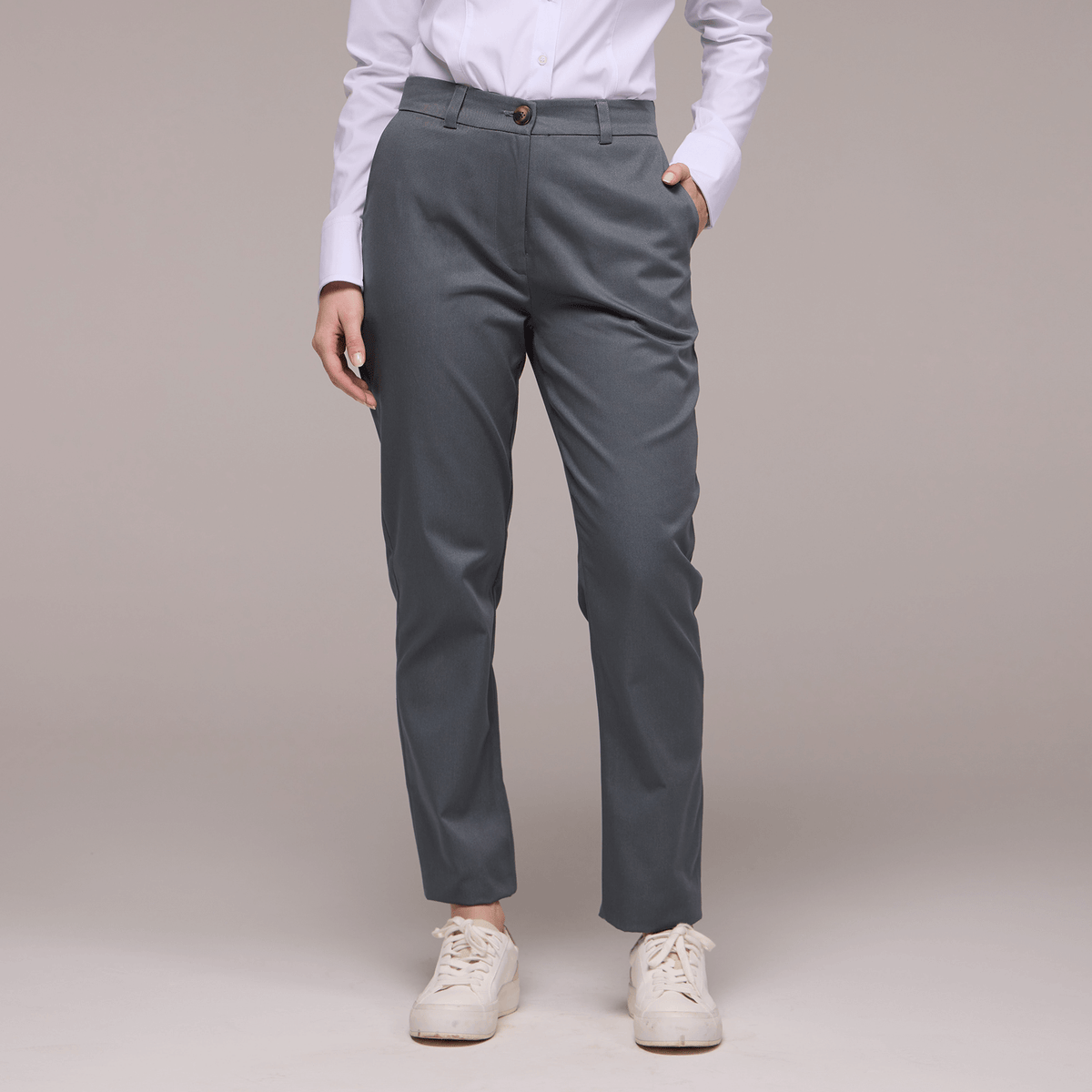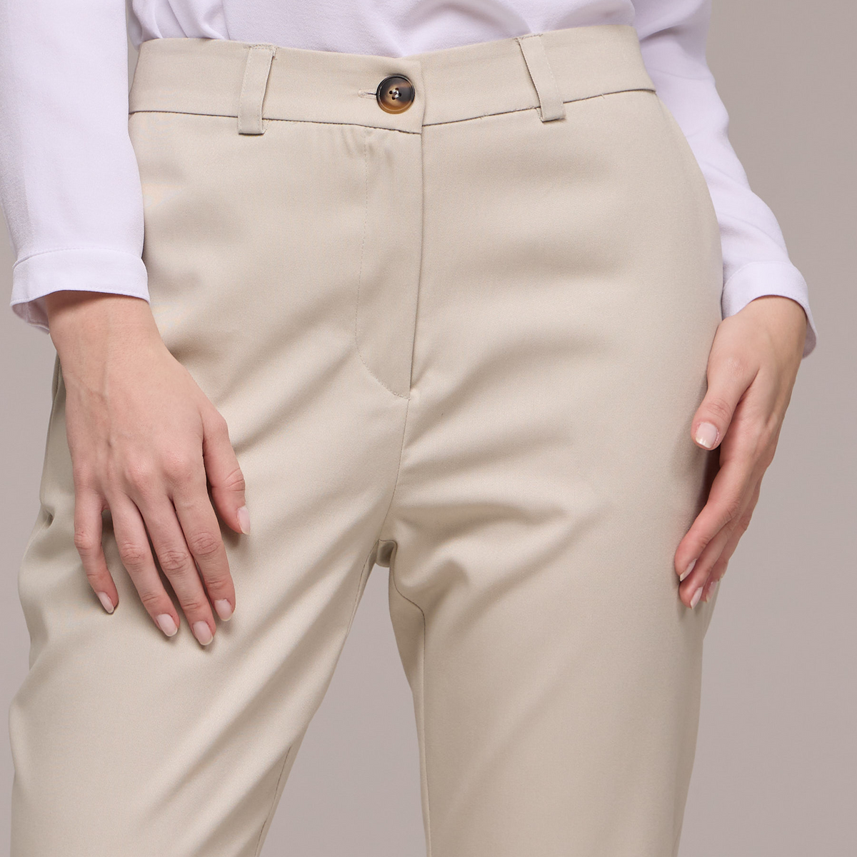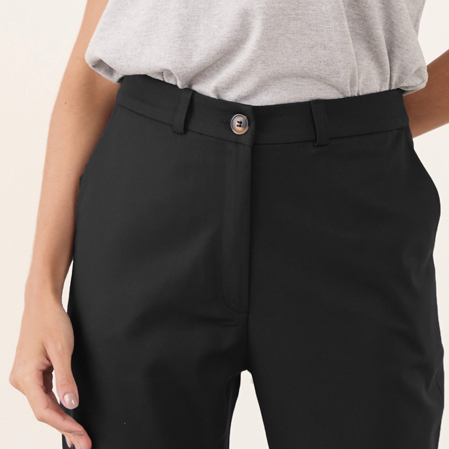 A calça possui passantes no cós, permitindo que você use um cinto para um ajuste personalizado e uma aparência mais polida. O fechamento é feito com zíper e um botão, garantindo praticidade e segurança.