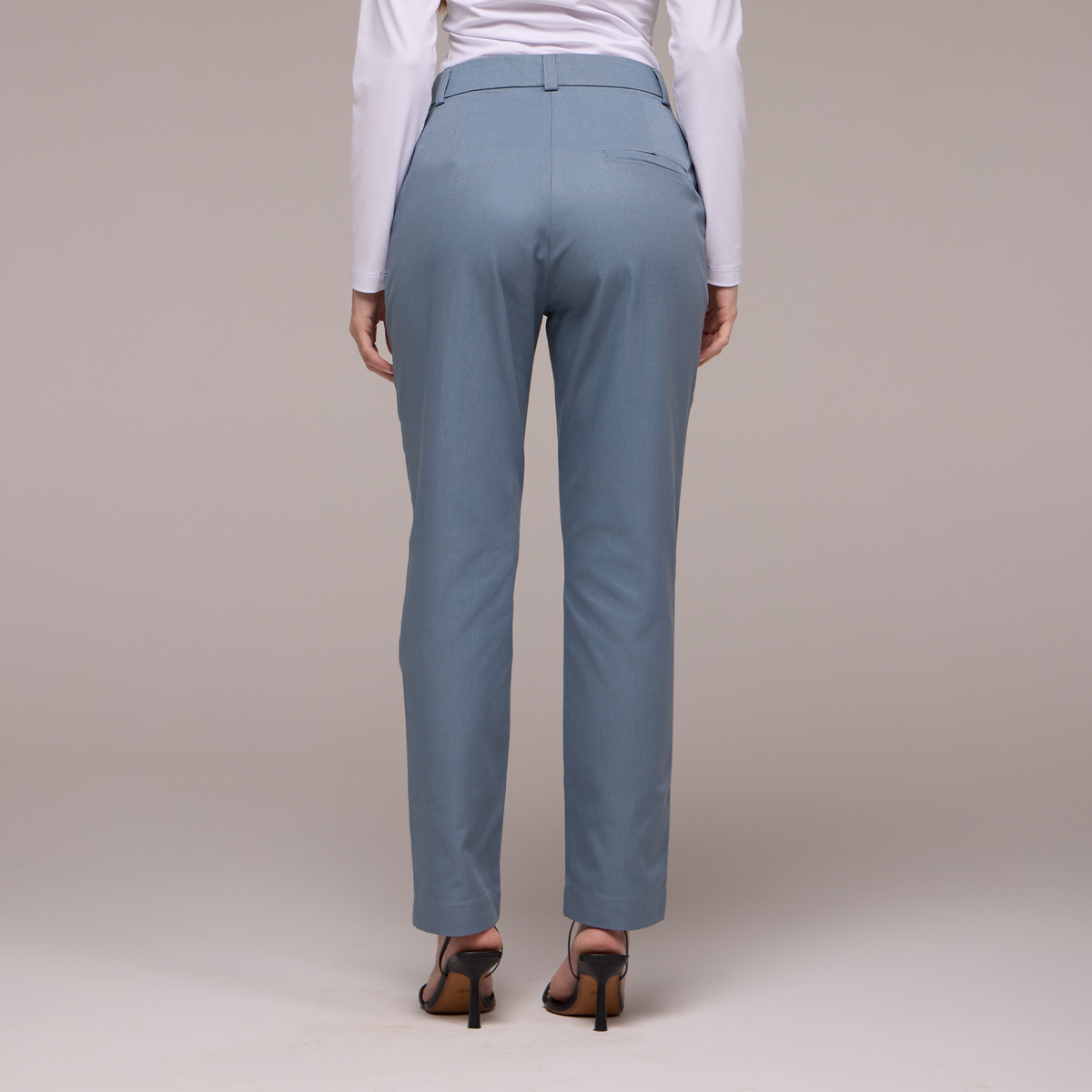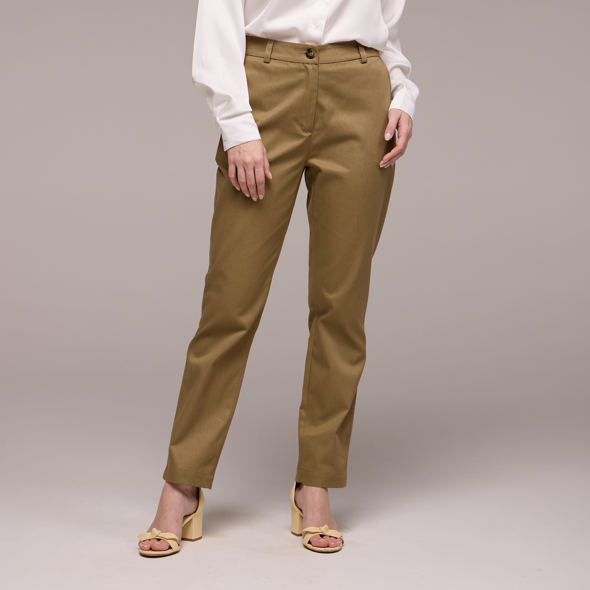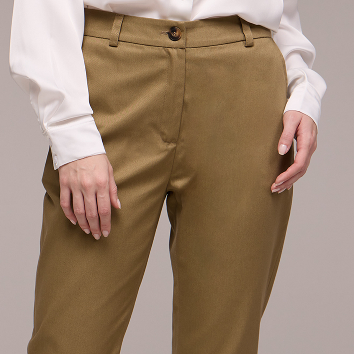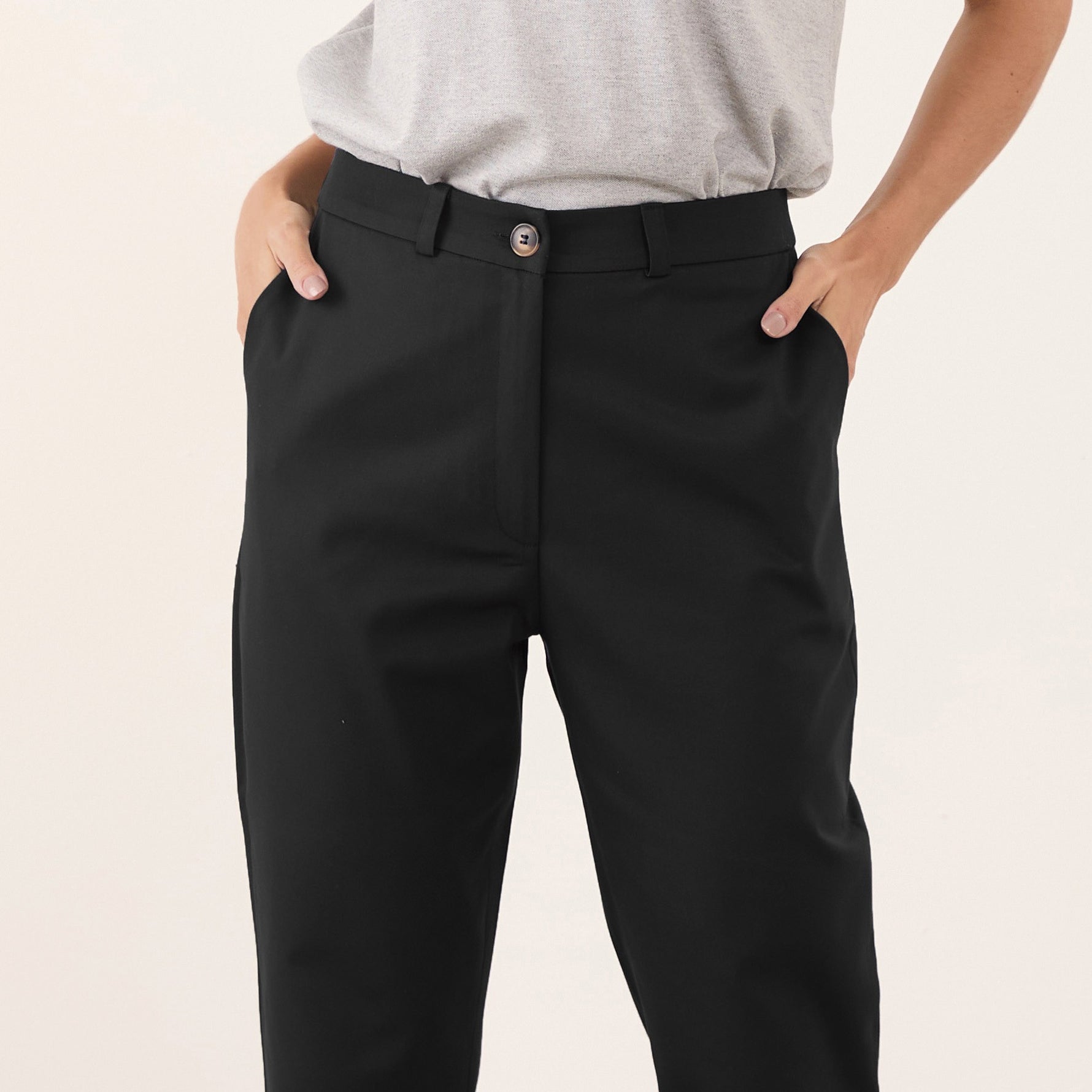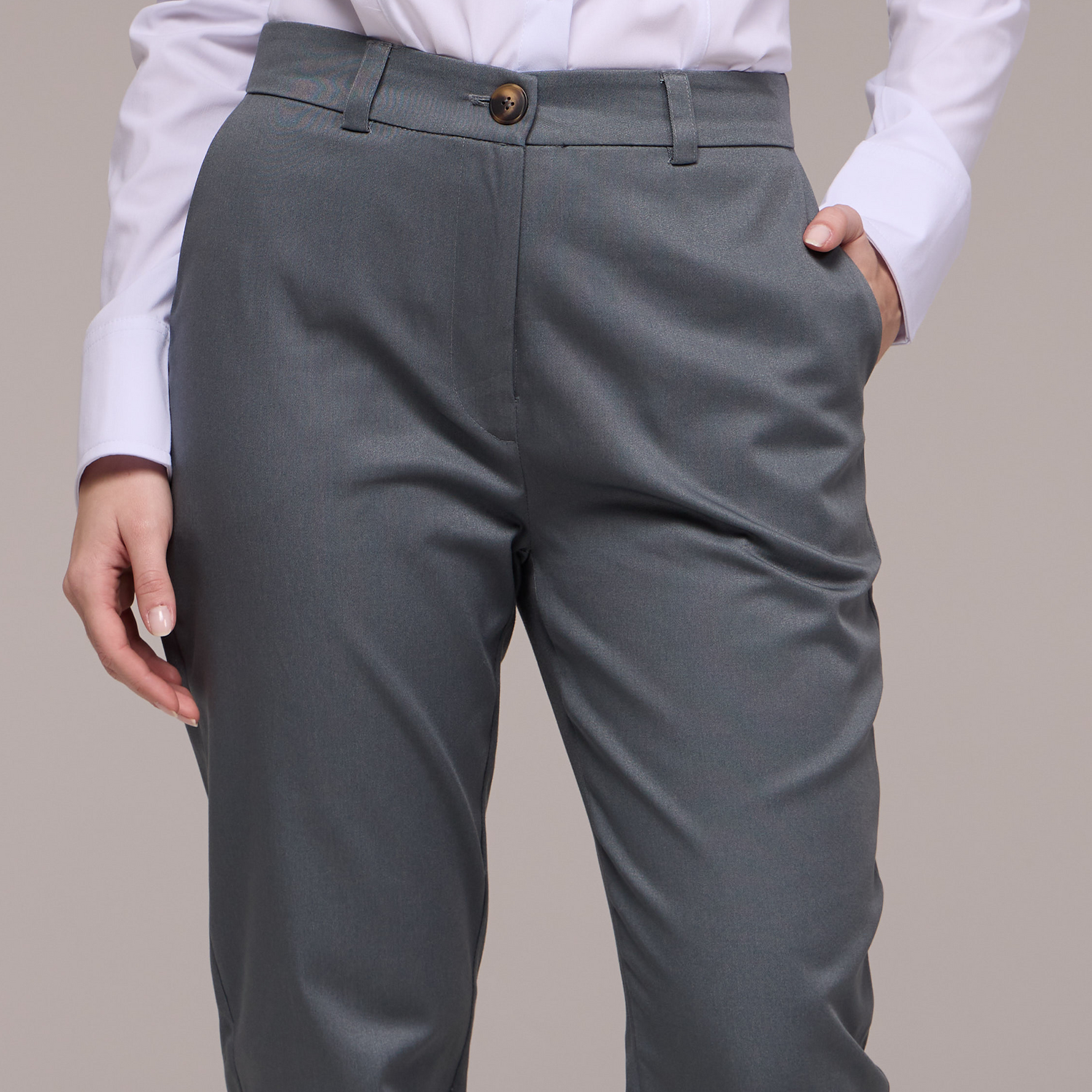 A calça possui passantes no cós, permitindo que você use um cinto para um ajuste personalizado e uma aparência mais polida. O fechamento é feito com zíper e um botão, garantindo praticidade e segurança.