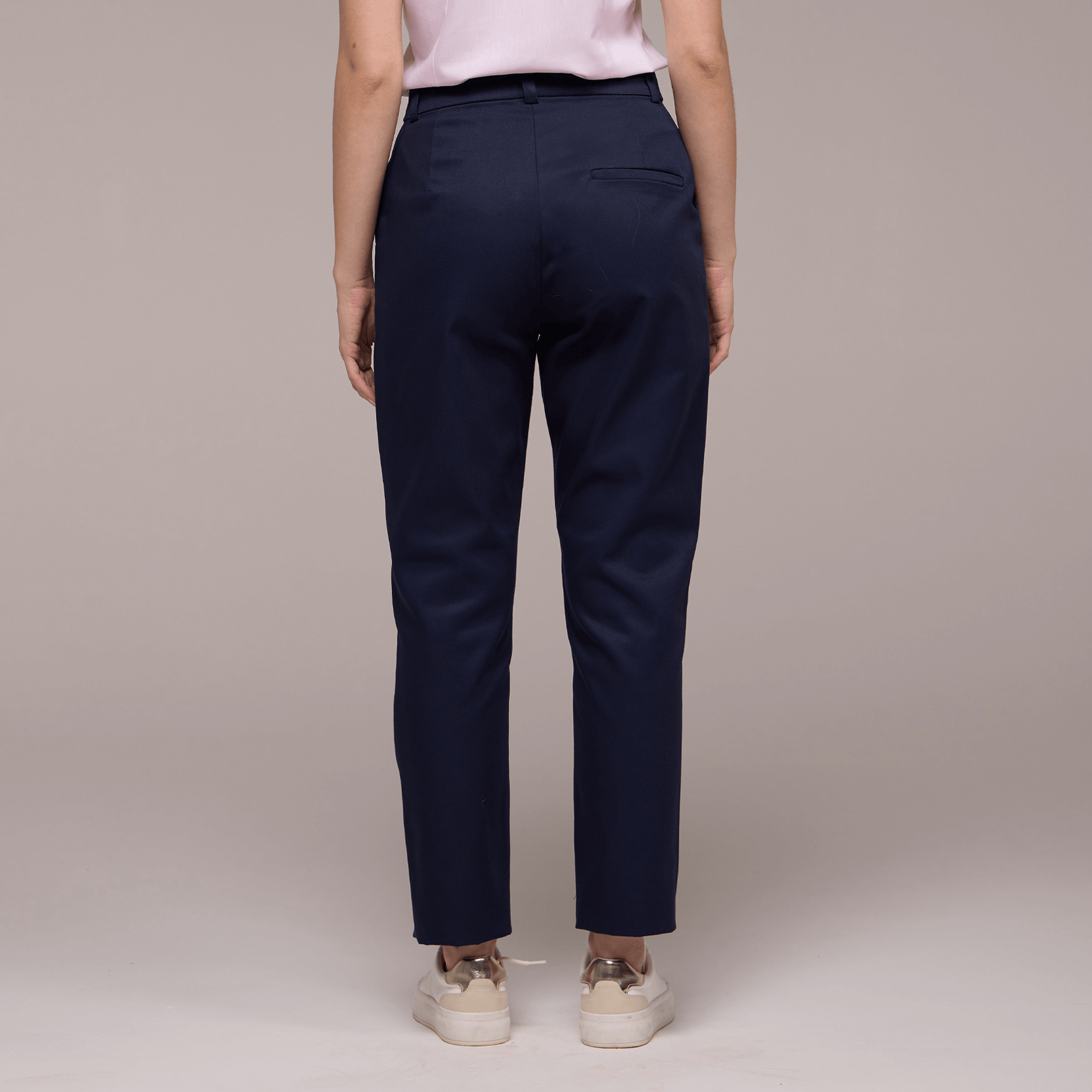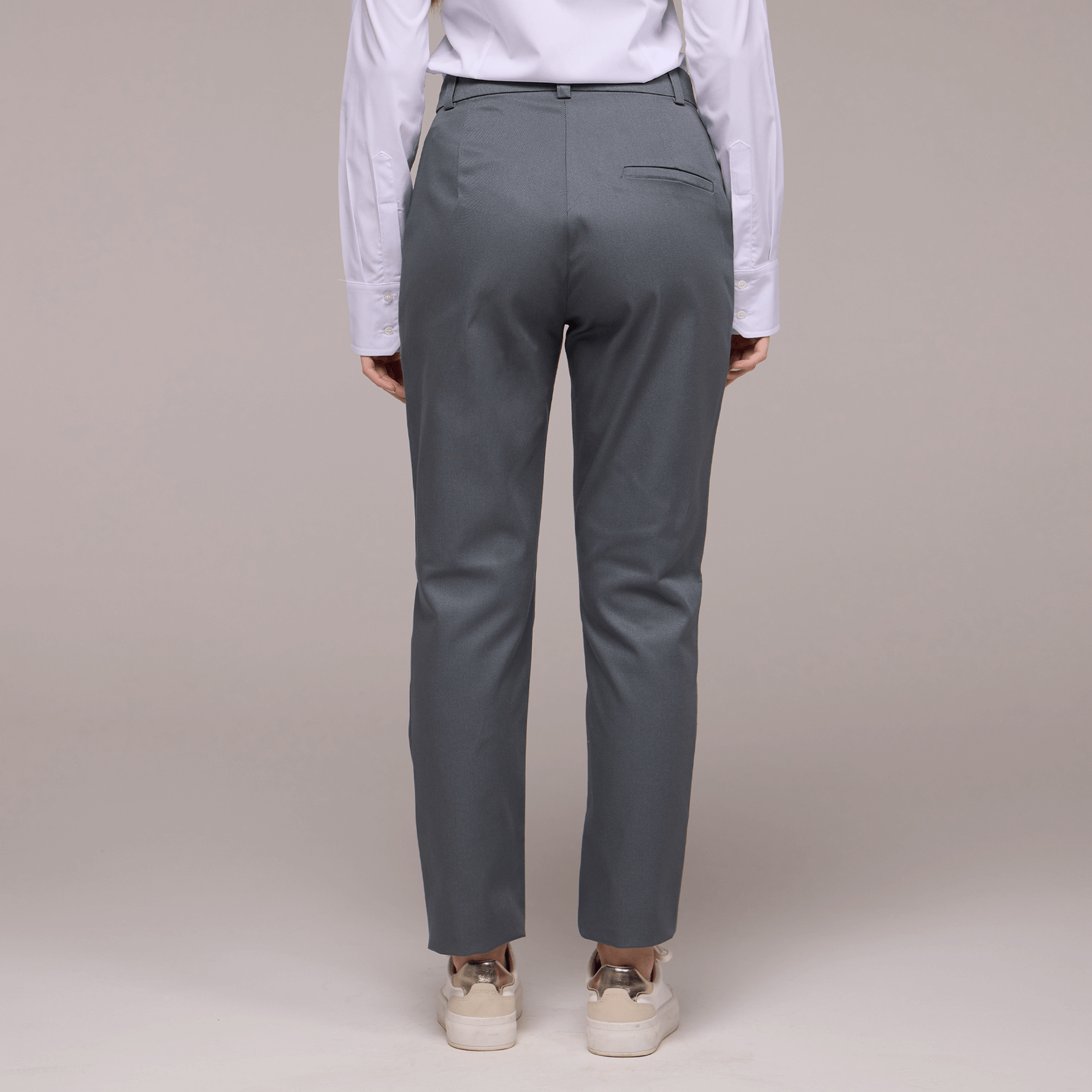 Na parte da frente, a calça apresenta bolsos faca, que oferecem espaço para guardar pequenos itens essenciais, como chaves ou um telefone celular. Esses bolsos são práticos e discretos, contribuindo para o visual profissional da peça.