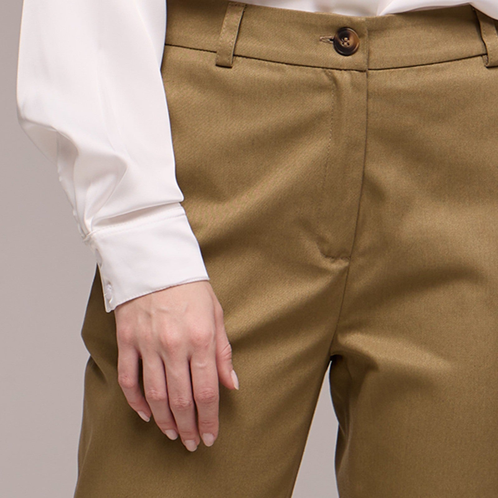 A calça possui passantes no cós, permitindo que você use um cinto para um ajuste personalizado e uma aparência mais polida. O fechamento é feito com zíper e um botão, garantindo praticidade e segurança.