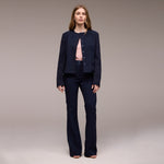 Em um ambiente profissional, o tecido de alfaiataria compõem uma imagem séria e respeitável, enquanto a gola careca adiciona um toque de feminilidade.