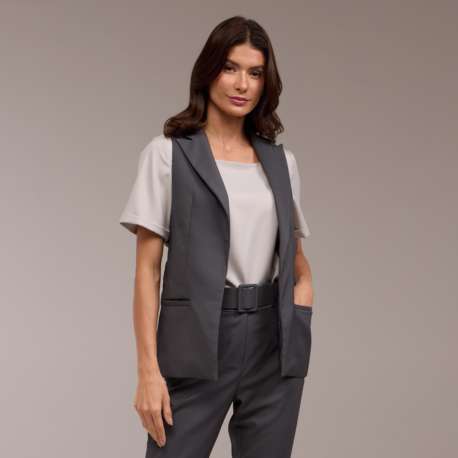 O colete, sem mangas, permitindo que você o use sobre blusas de manga curta ou comprida, adicionando estilo e camadas ao seu visual. Além disso, ele não possui abertura traseira, o que confere um acabamento mais contínuo e uniforme na parte de trás.