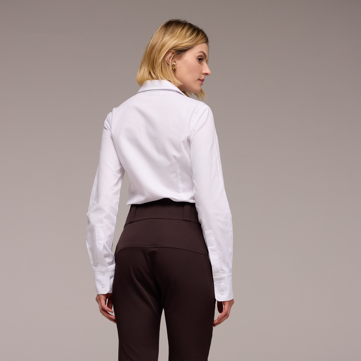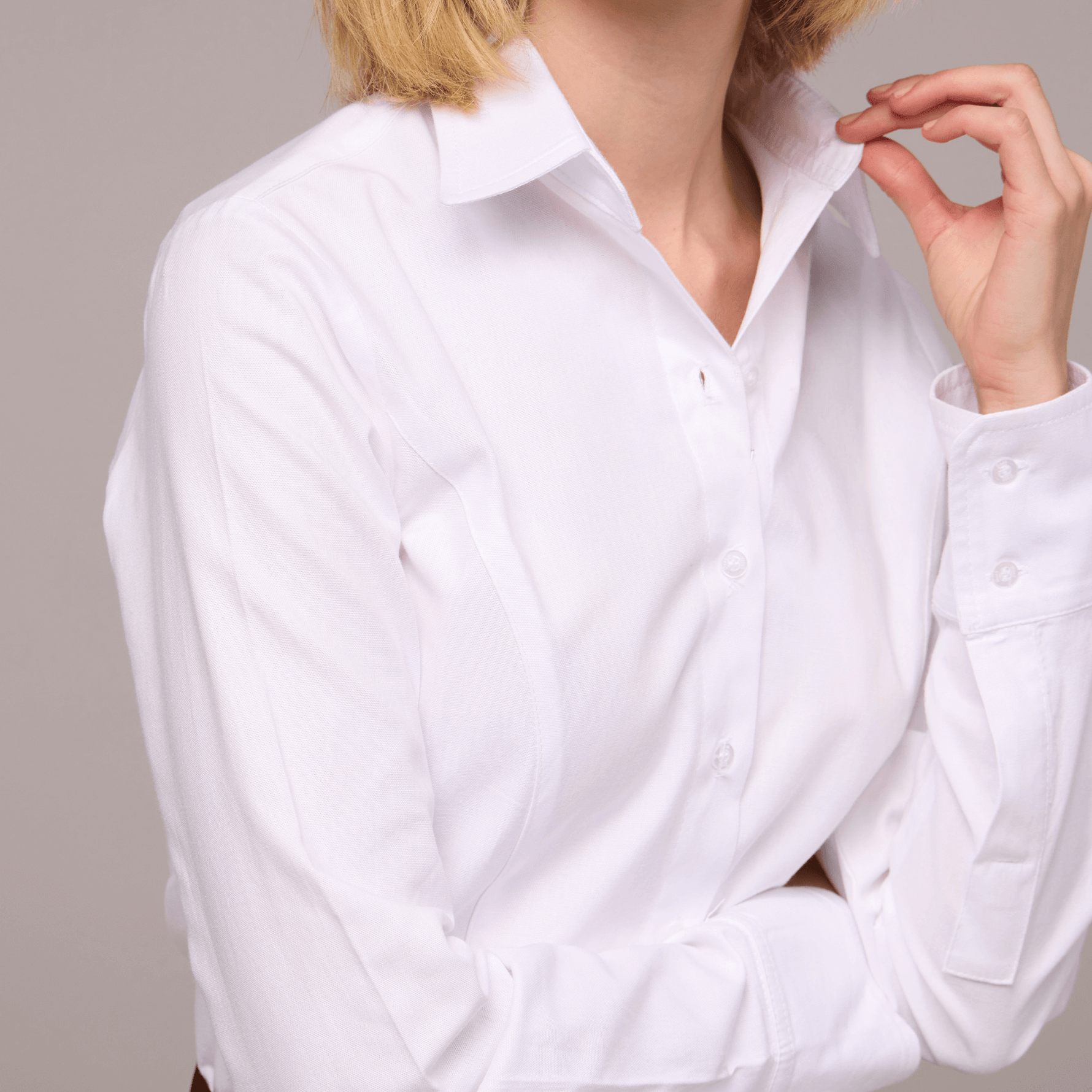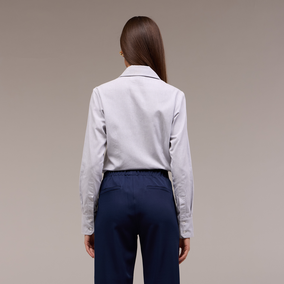 Ela apresenta uma gola social, que é mais estruturada, o que confere um toque de sofisticação ao visual. Além disso, esse modelo possui recortes na frente e pences nas costas para deixar o caimento mais ajustado ao corpo.
