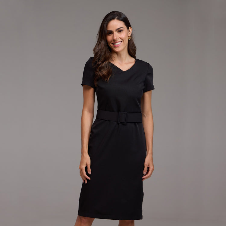 O Vestido Manga Curta Talita é uma peça com design clássico com o caimento acinturado, tornando-o um vestido básico atemporal, perfeito para combinar com diversos estilos e acessórios.