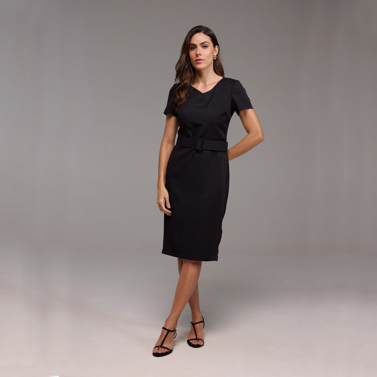 O Vestido com Cinto Laia é uma peça clássica e elegante, com um corte reto que se ajusta suavemente ao corpo, proporcionando um caimento estruturado. Suas alças largas oferecem sustentação e conforto aos ombros.