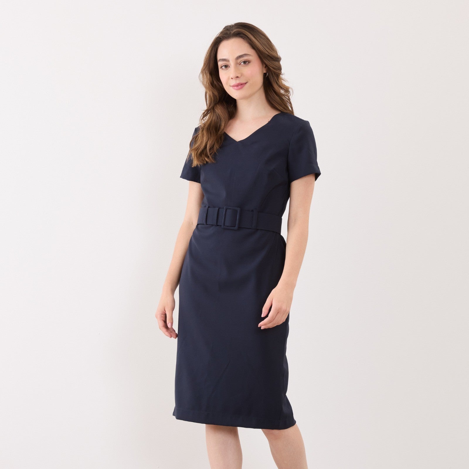 O decote em formato "V" acrescenta um toque de feminilidade, alongando a silhueta e destacando o colo de maneira delicada. O cinto, posicionado na altura da cintura, marca sutilmente a silhueta, valorizando as curvas naturais do corpo.