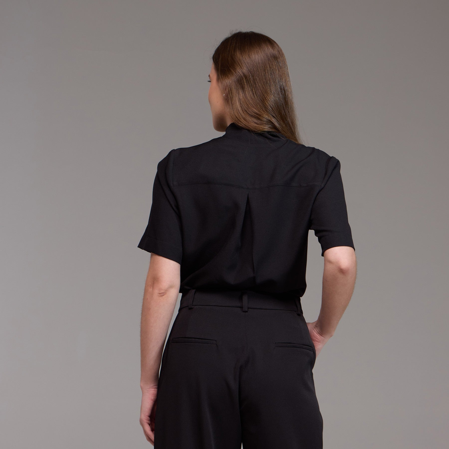 Um dos detalhes distintivos desta blusa são as duas pregas localizadas nos ombros, próximas ao pescoço, que proporcionam um destaque para o rosto e um volume sutil para a região.