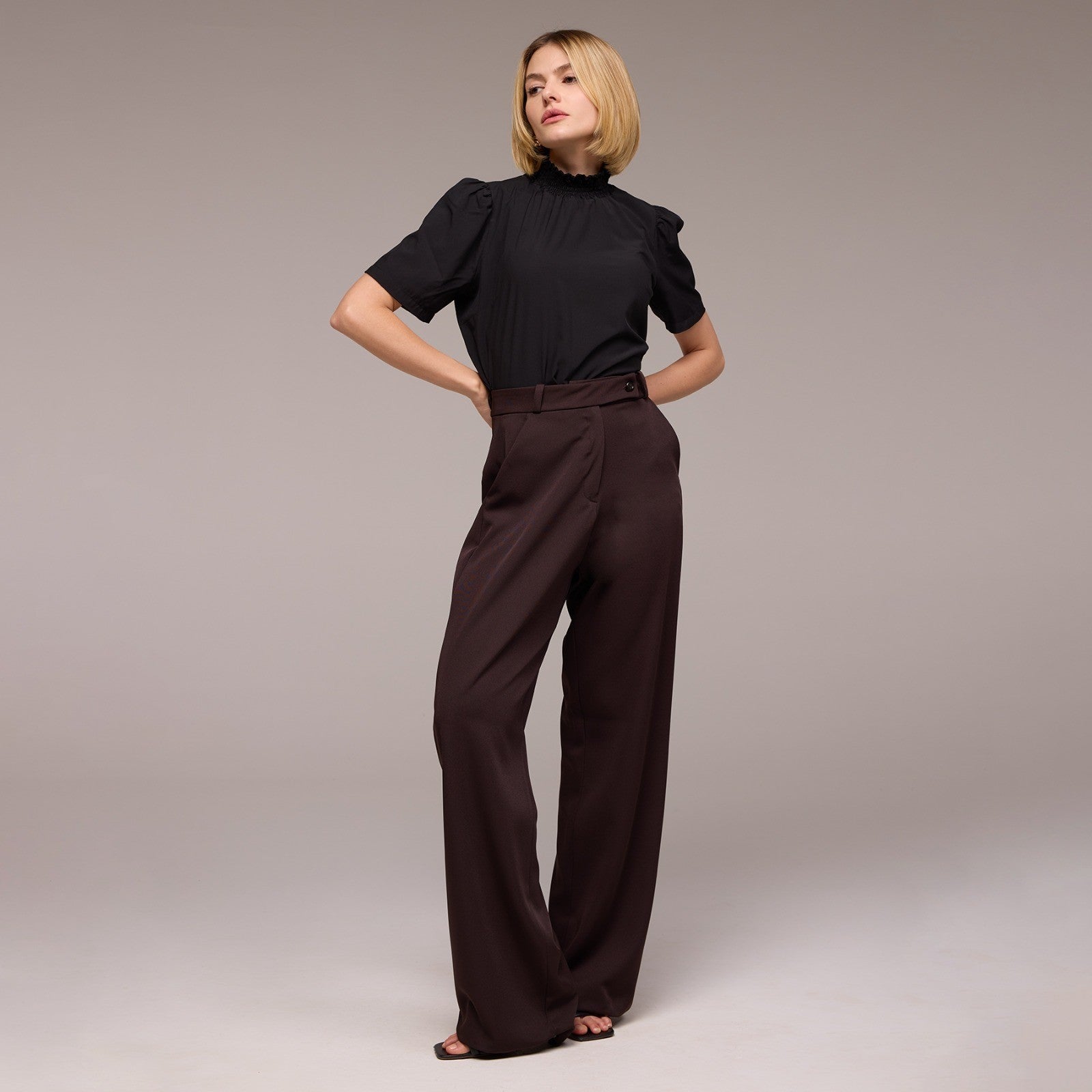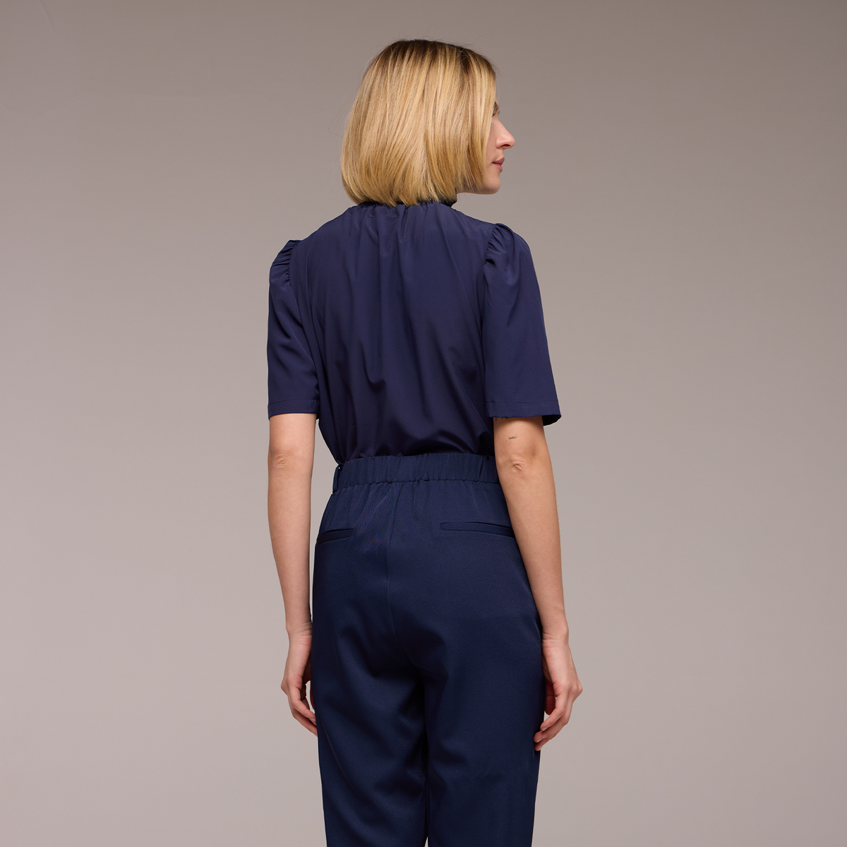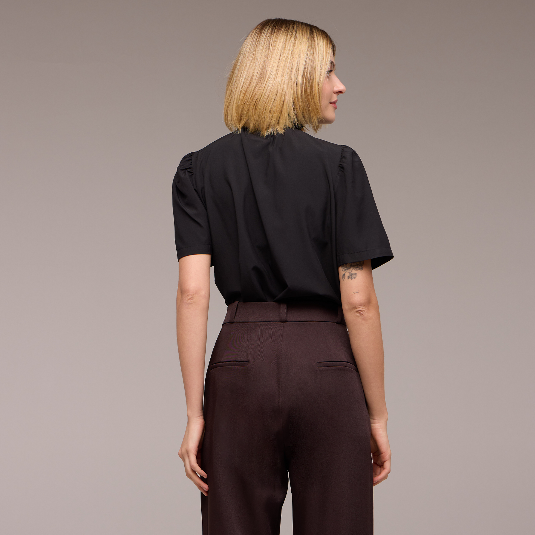 A blusa é confeccionada em um tecido leve, que proporciona uma sensação agradável ao toque e uma excelente respirabilidade. Esse tecido também garante um caimento suave e fluido, conferindo um aspecto feminino e delicado à peça.