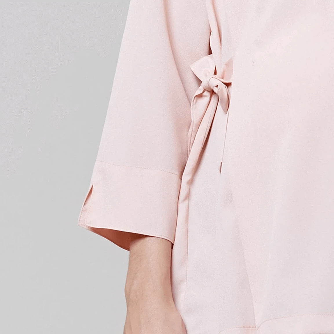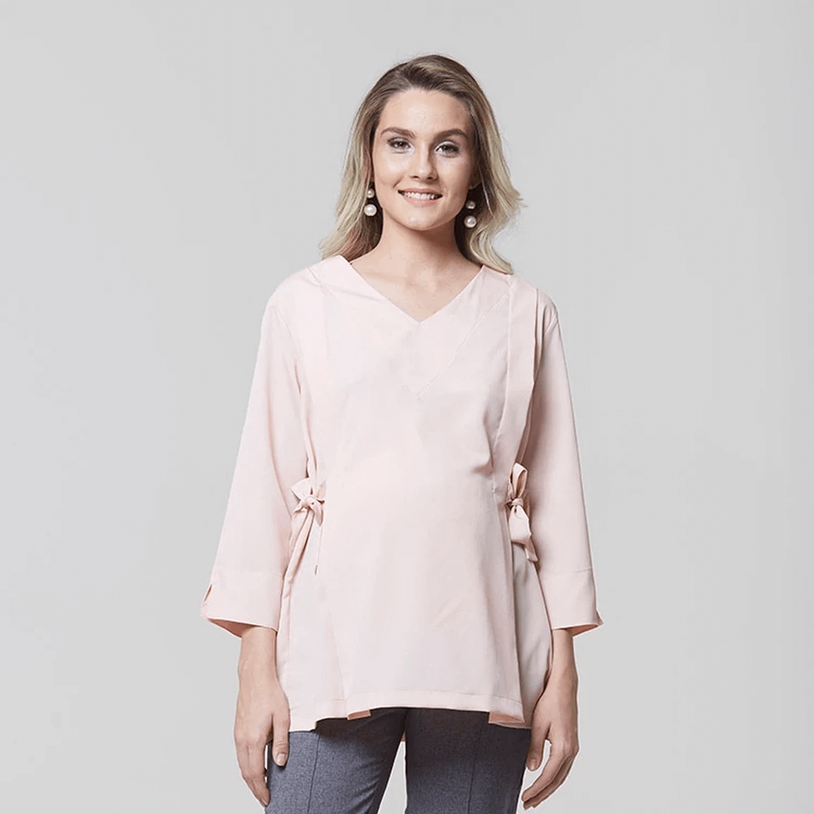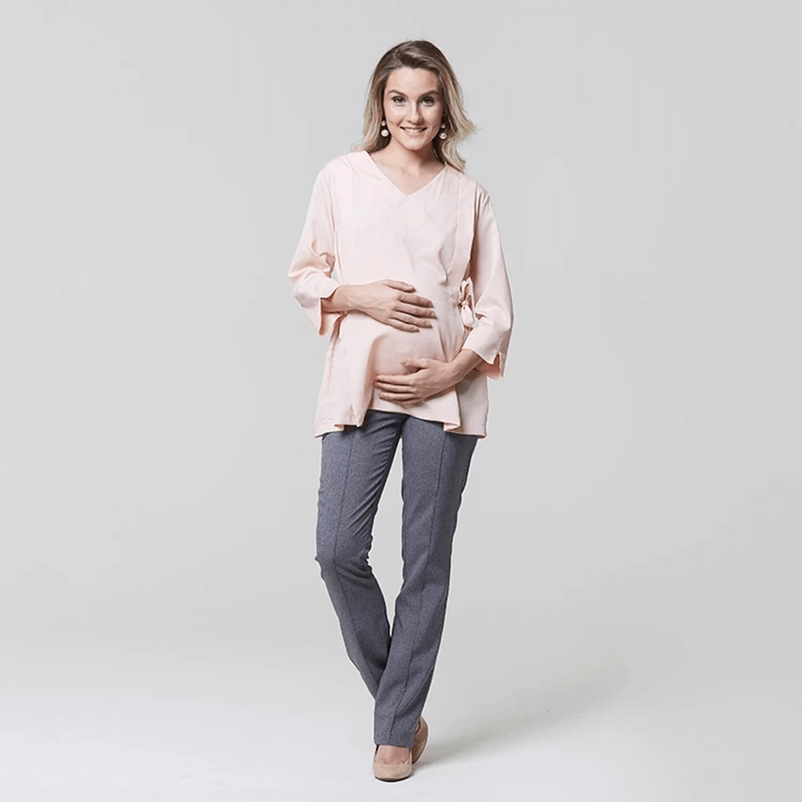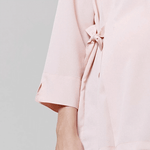 Os laços nas laterais da bata são um detalhe encantador que adiciona um toque de delicadeza ao design. Esses laços não apenas embelezam a peça, mas também proporcionam uma regulagem personalizável para acomodar o crescimento da barriga da colaboradora ao longo da gestação.