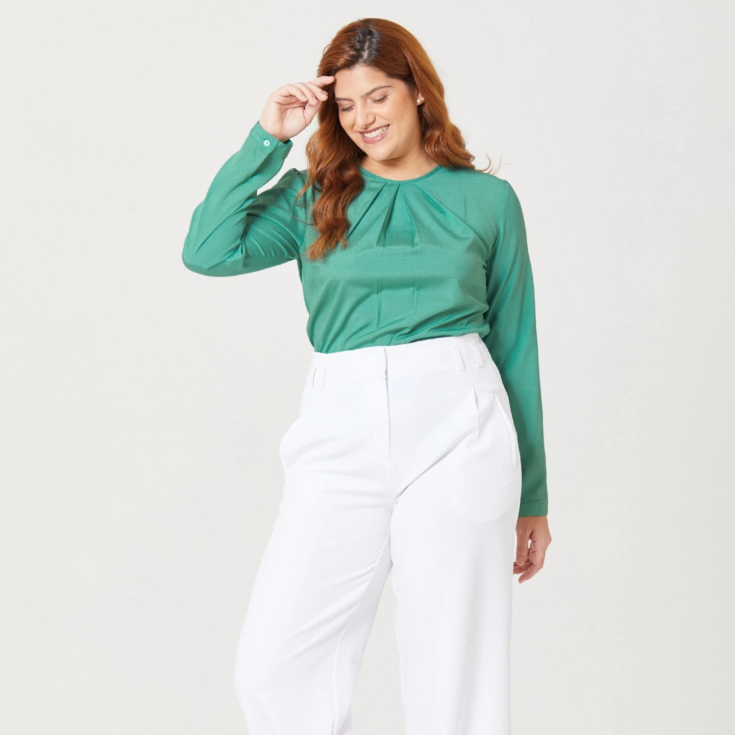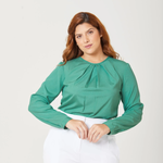 Pregas na Gola - A forma como as pregas estão dispostas, elas criam um efeito de alongamento na área do pescoço, proporcionando uma aparência mais esguia e elegante.