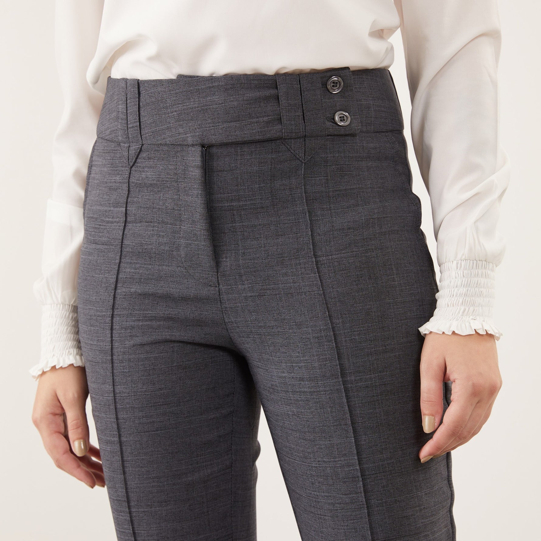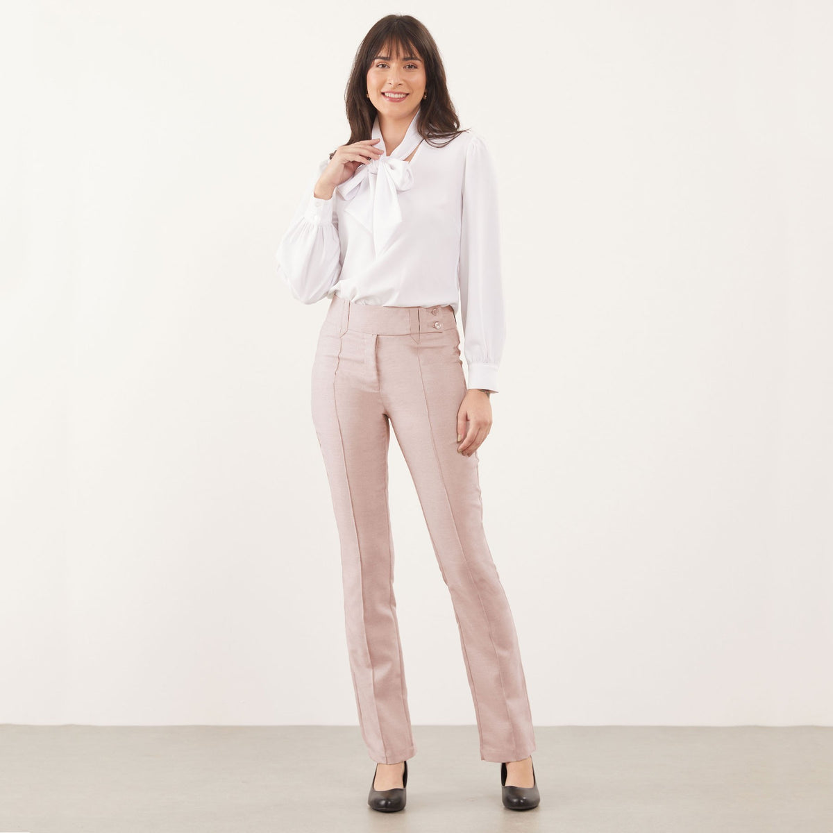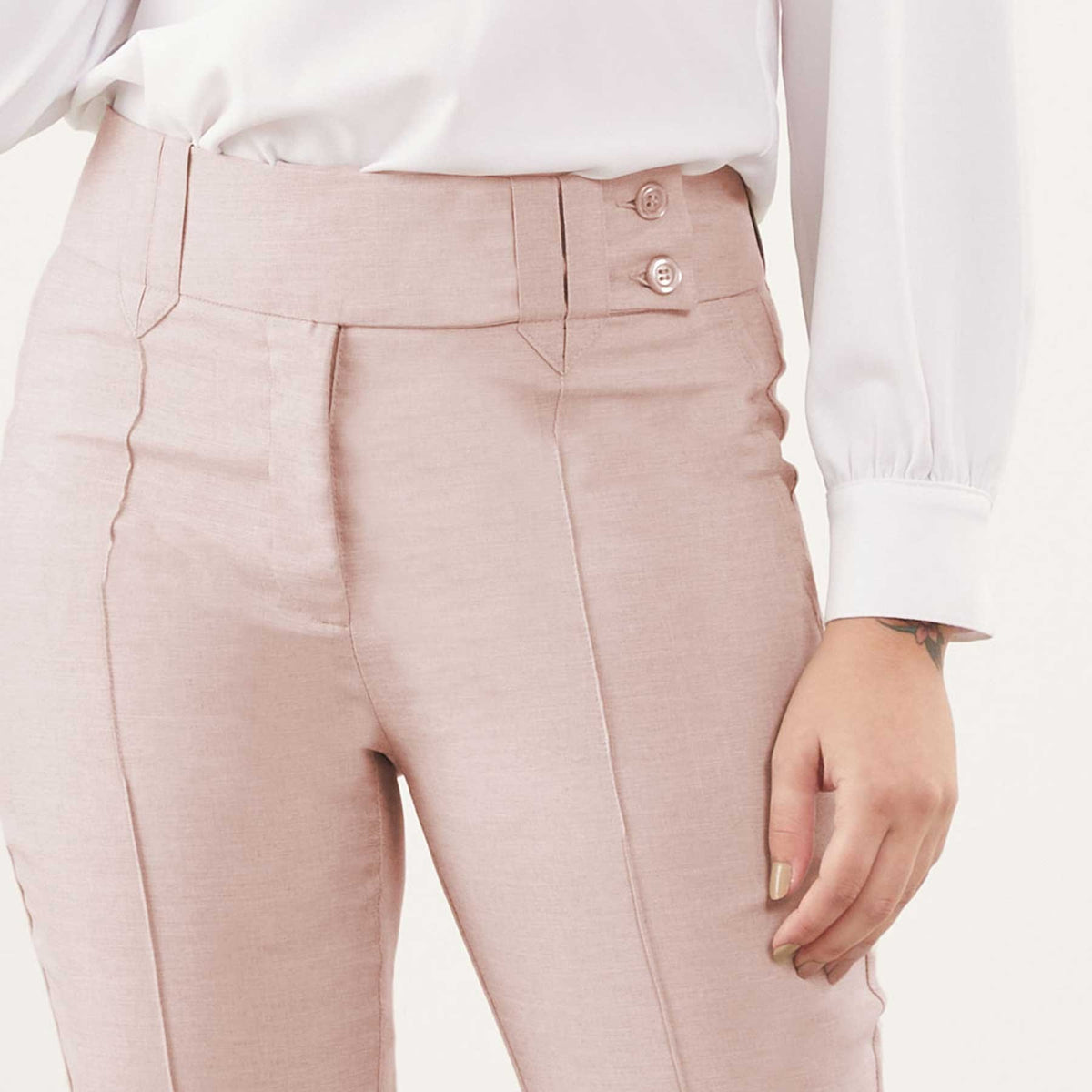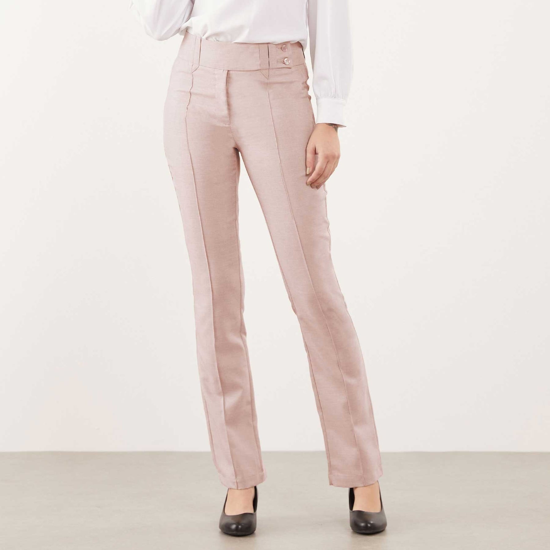 A Calça Feminina Clássica Maria Alice possui cós trespassado com passante e abotoamento de dois botões, trazendo um detalhe moderno à peça clássica.